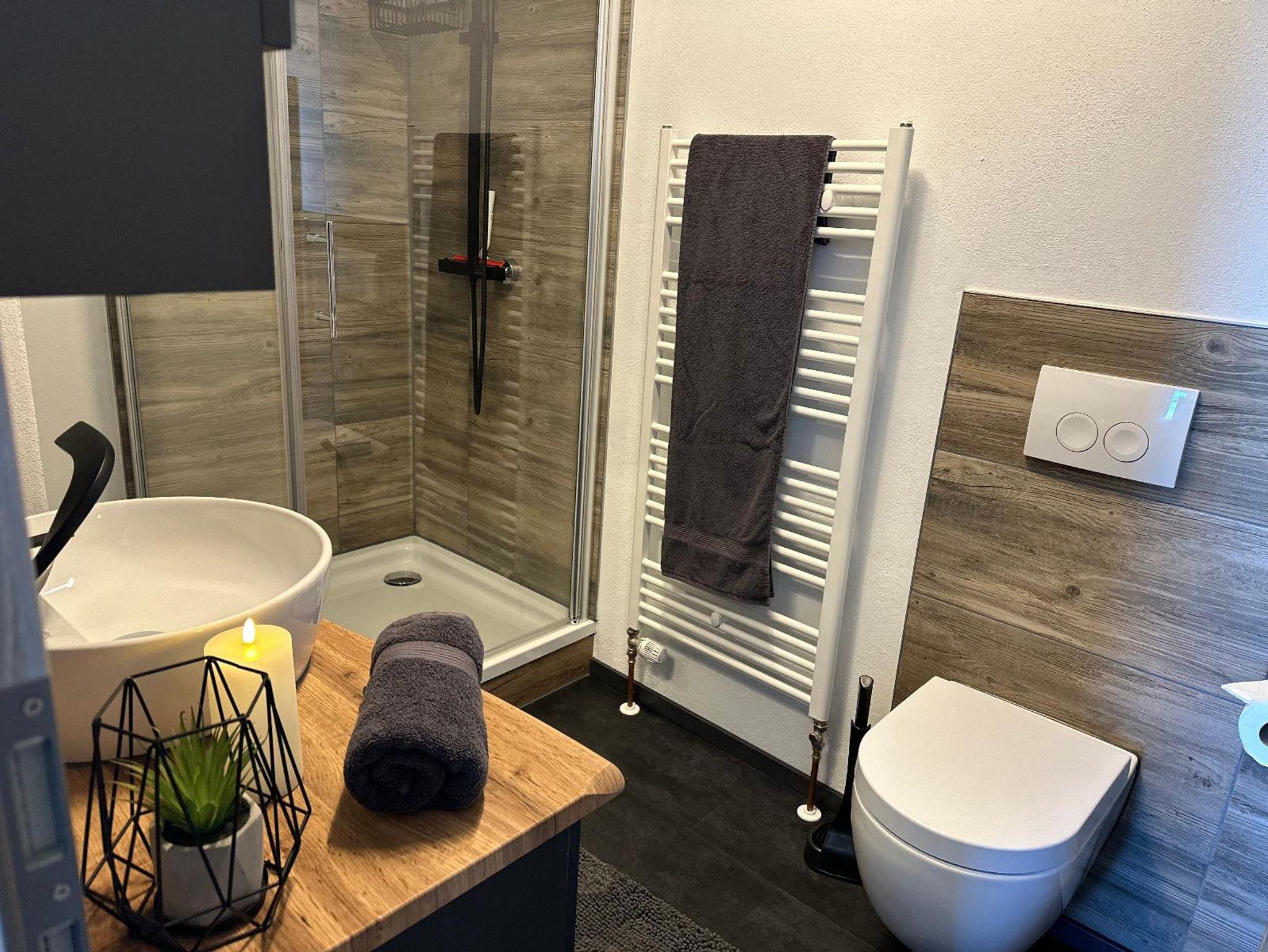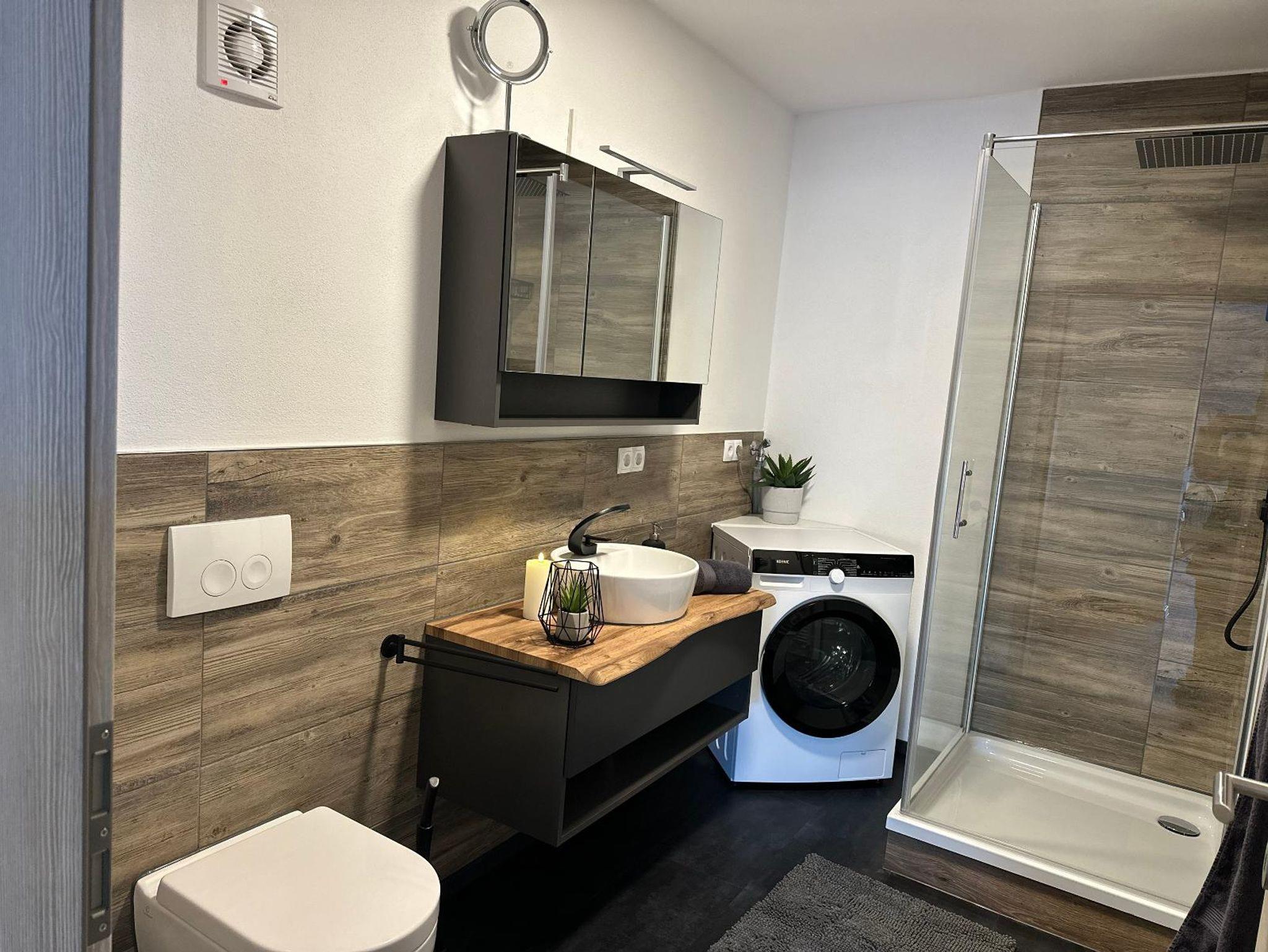 • 1 separates Badezimmer mit Waschbecken, Dusche und WC sowie Waschtrockner