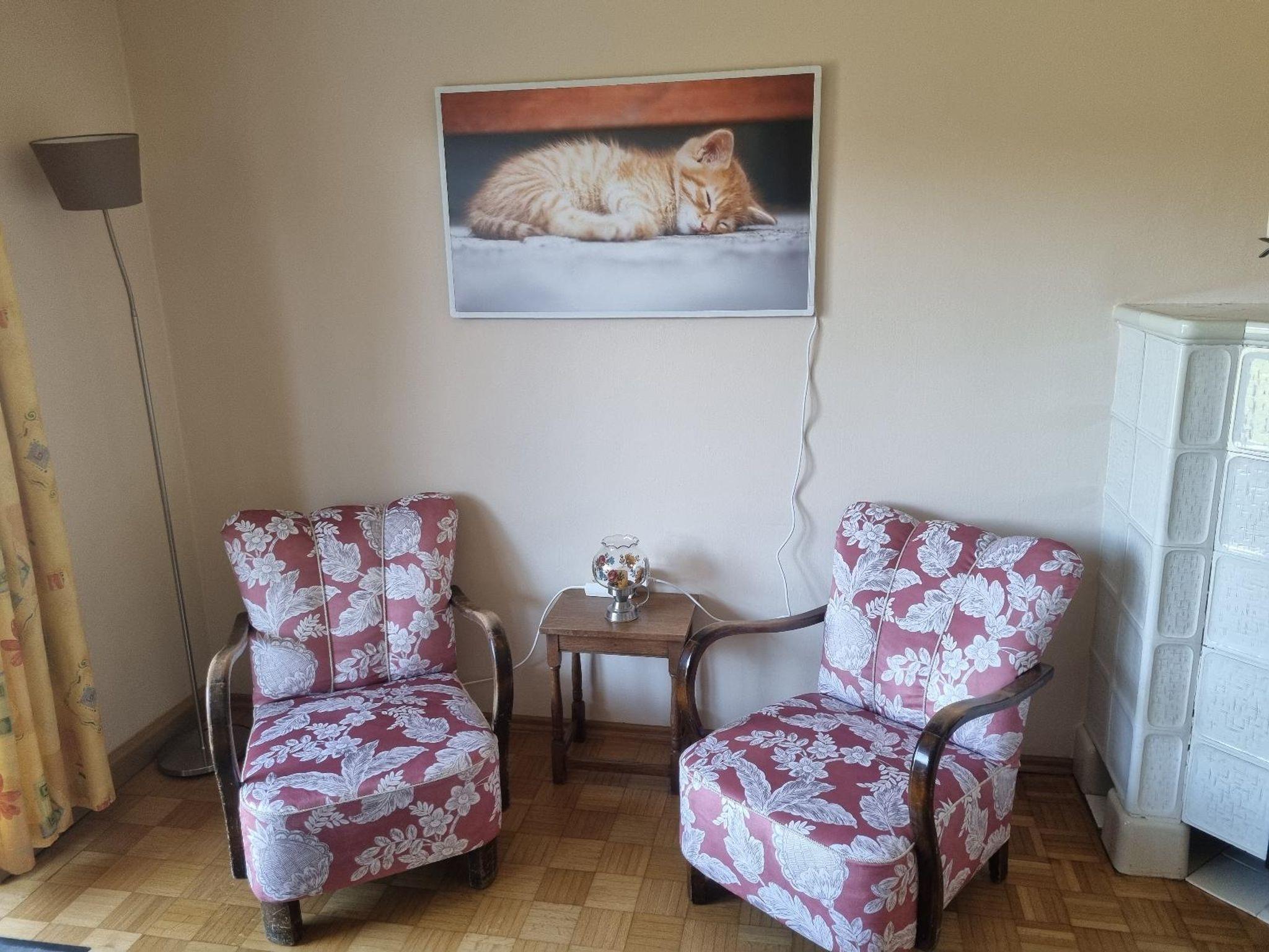 Das im Stil der 60er eingerichtete Wohnzimmer lädt zum Verweilen ein. Ausgestattet mit TV, Couch und Polsterstühlen. An sonnigen Tagen steht den Gästen die Terrasse mit Gartenmöbeln und Markise zur Verfügung, die vom Wohnzimmer aus zu erreichen ist.