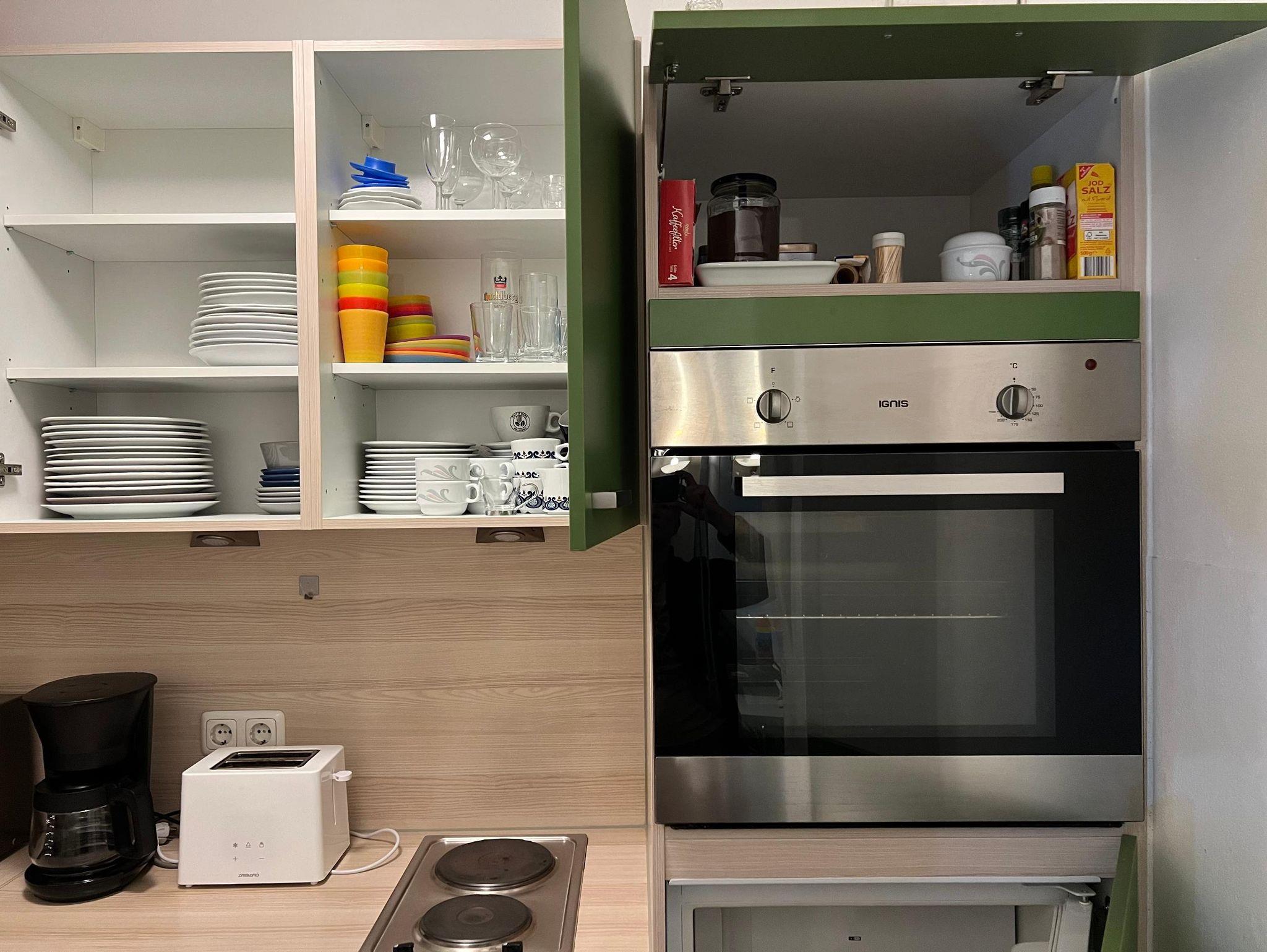 Außerdem bieten wir eine vollausgestattete Küche mit Kaffefiltermaschine, Heißwasserkocher, Toaster, Mikrowelle, Backofen, Spülmaschine und Herd. Optional haben sie die Möglichkeit im Restaurant Geyerei (direkt im Haus) zu frühstücken (Buffet) oder Essen zu gehen (Reservierung notwendig). Waschservice ist buchbar (6 €).