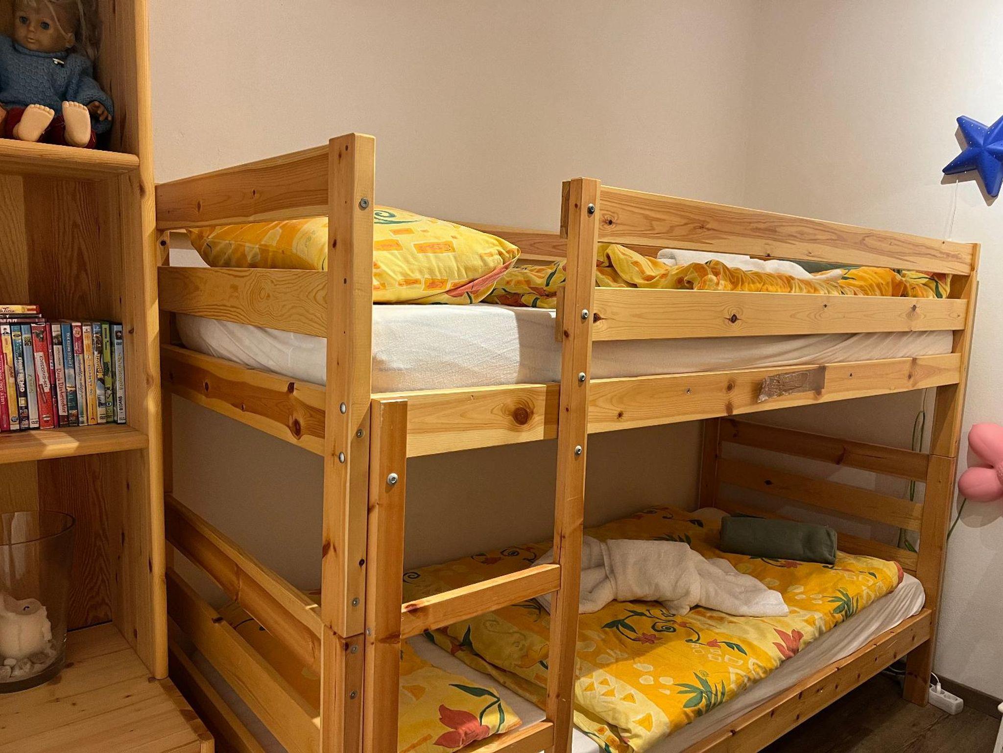 Wir haben eine frisch renovierte Wohnung H180 mit 53qm, Schlafzimmer mit Doppelbett und Stockbett, sowie im Wohnzimmer ein Ausklapp-Sofabett.