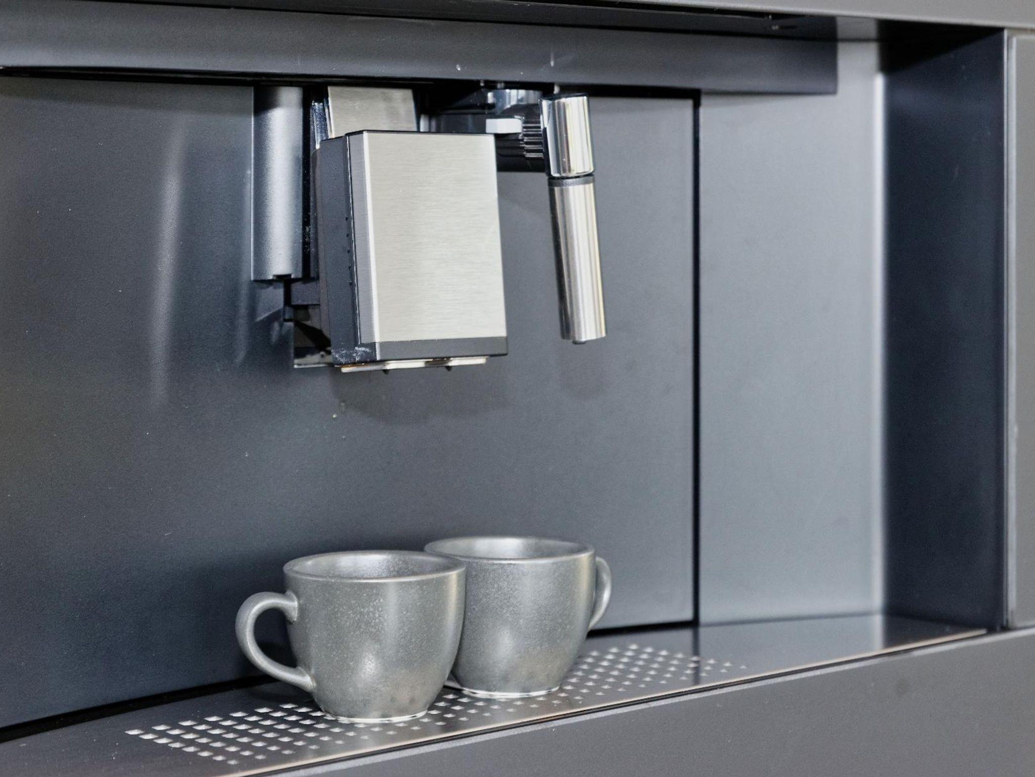 vorhanden. Ein Kaffeevollautomat, Weinkühlschrank, Wasserkocher, Toaster,