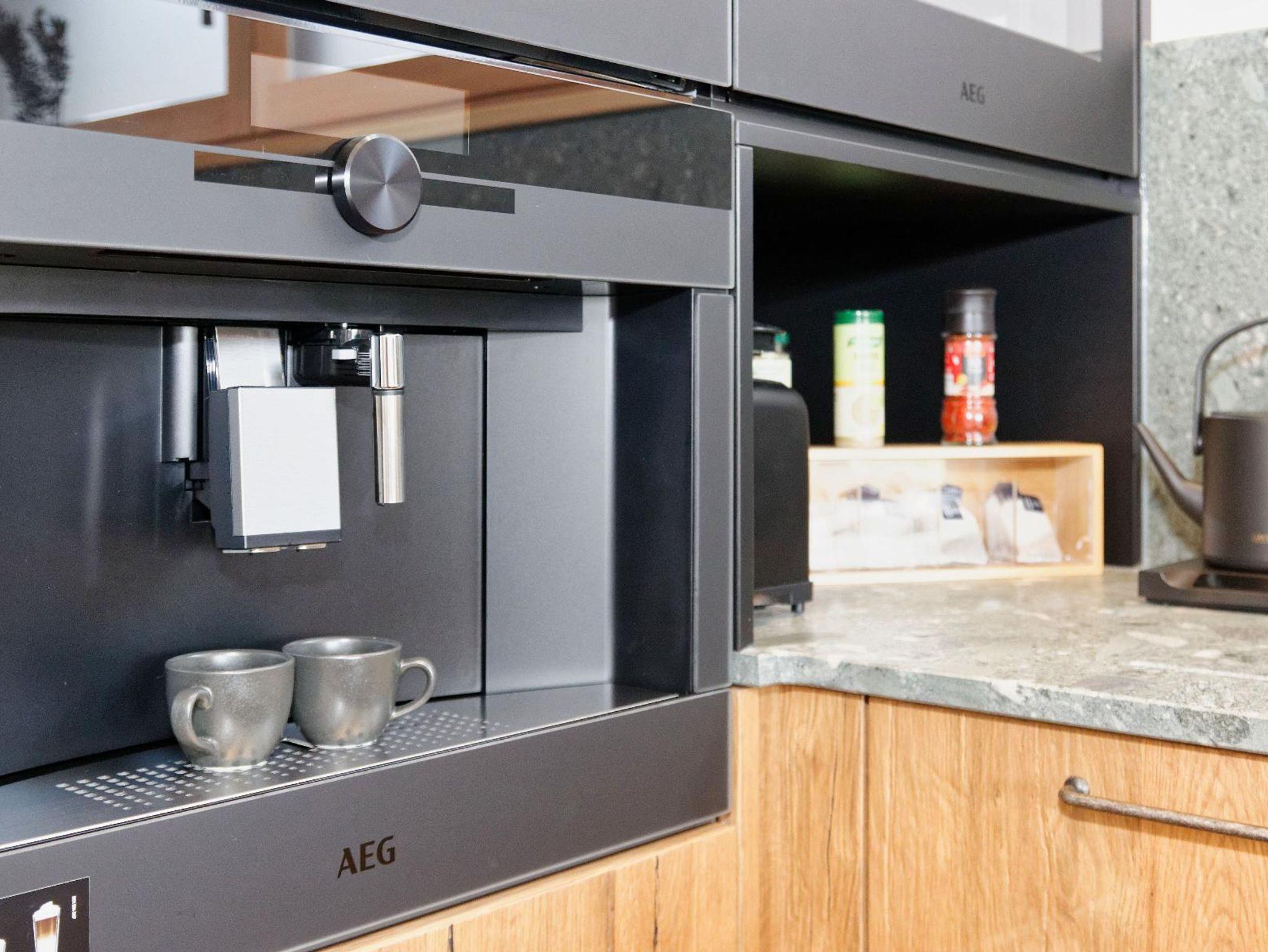 vorhanden. Ein Kaffeevollautomat, Weinkühlschrank, Wasserkocher, Toaster,