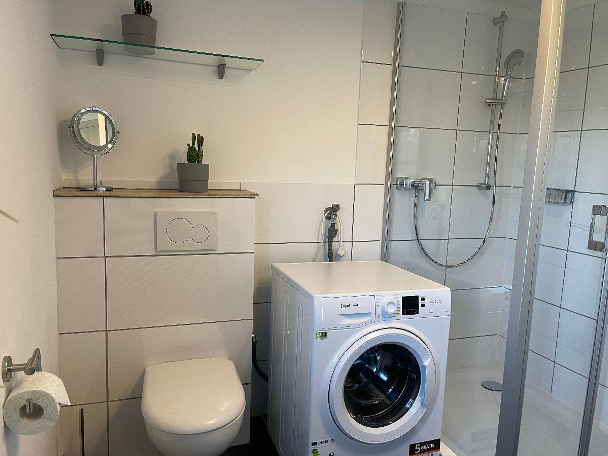 - 1 Badezimmer mit Waschbecken, Dusche und WC sowie Waschmaschine und Trockner