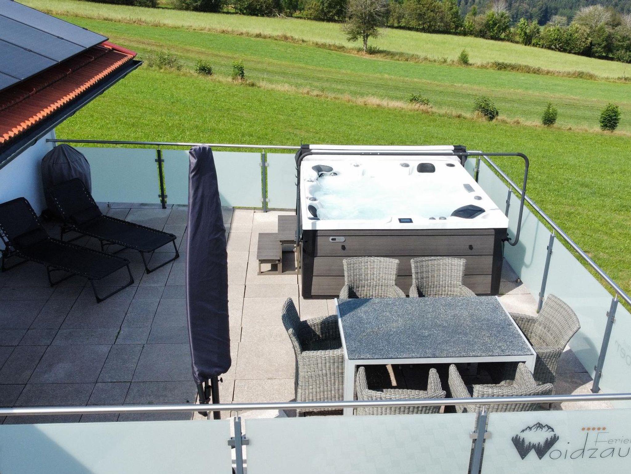 - Beheizter Premium Jacuzzi (38°C), Lounge-Möbeln, Sonnenschirm und Liegen