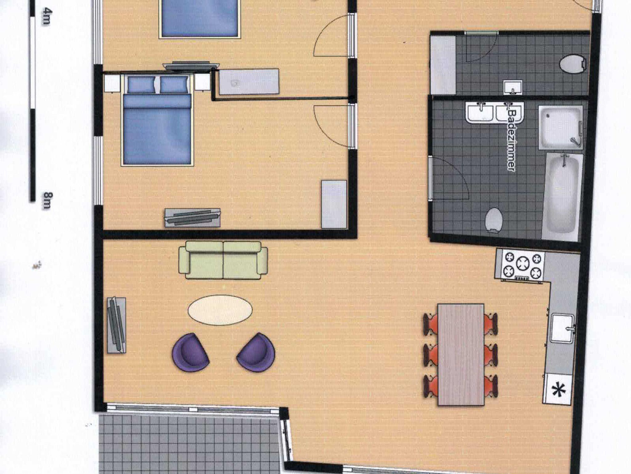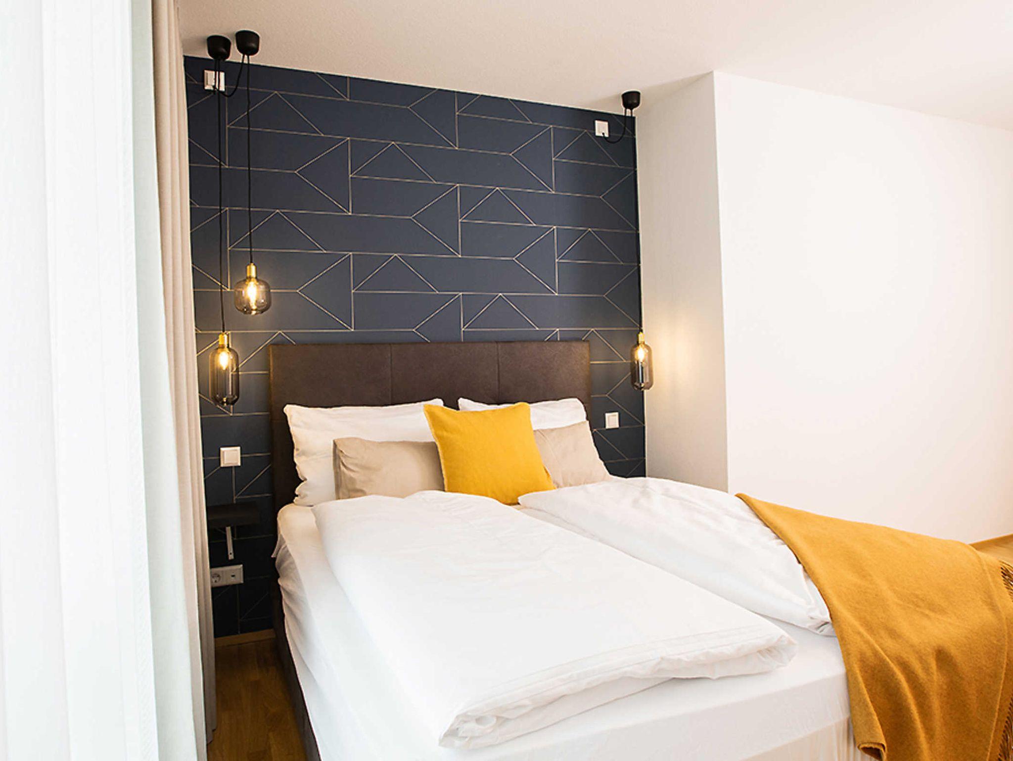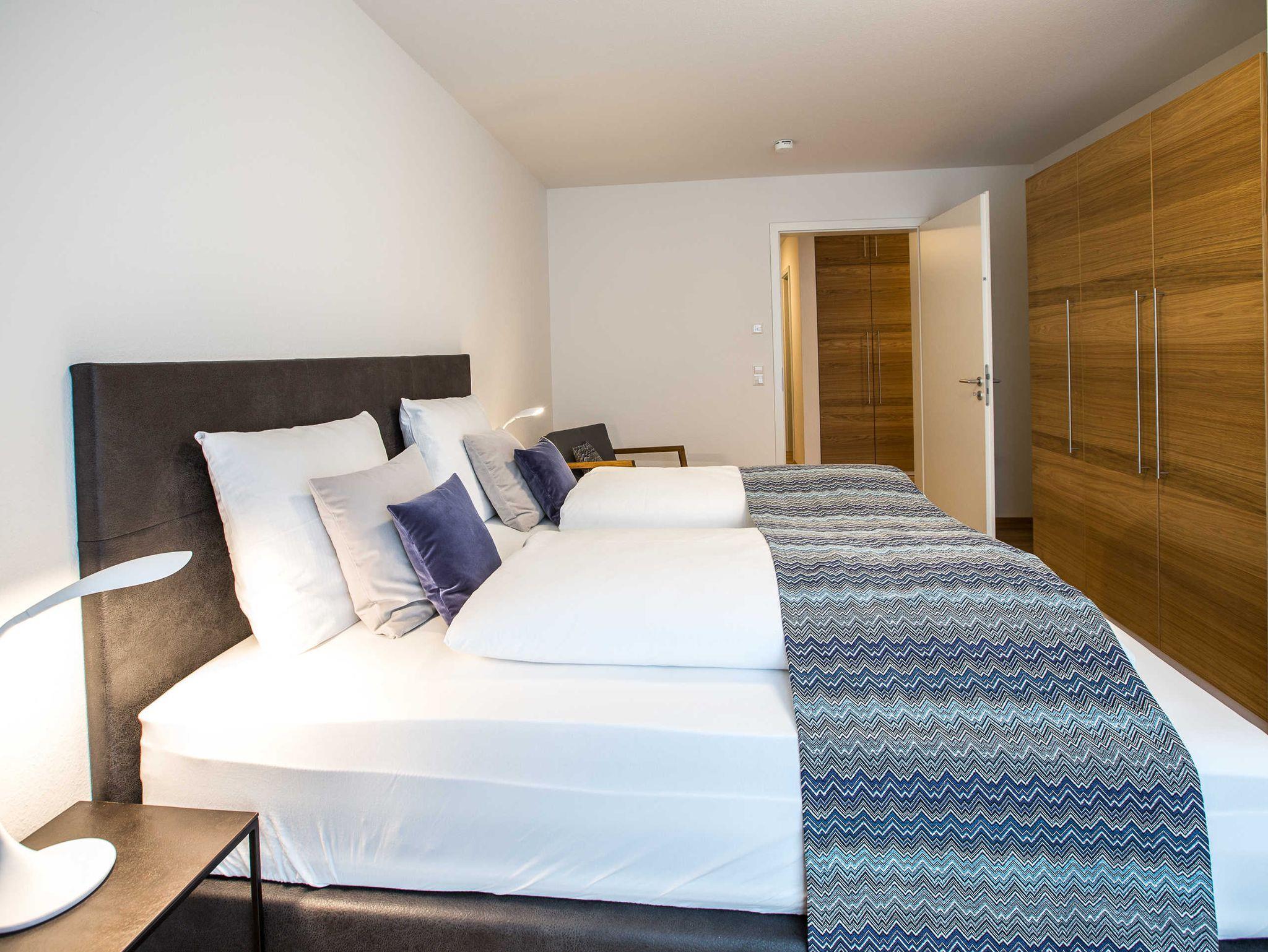 Dieses Apartment hat 110 m² , 2 Schlafzimmer mit Luxus-Matratzen für 4 Personen und neben dem großzügigen Bad ein separates WC. Eine großzügige Schlafcouch bietet zusätzlich 2 Schlafmöglichkeiten. Es gibt einen Wohn- und Essbereich, eine gut ausgestattete Küche mit Backofen, Geschirrspüler und Kaffeemaschine sowie Balkon mit Blick in Richtung Bodensee. Darüber hinaus hat die Wohnung Smart-TV und Highspeed-WLan.