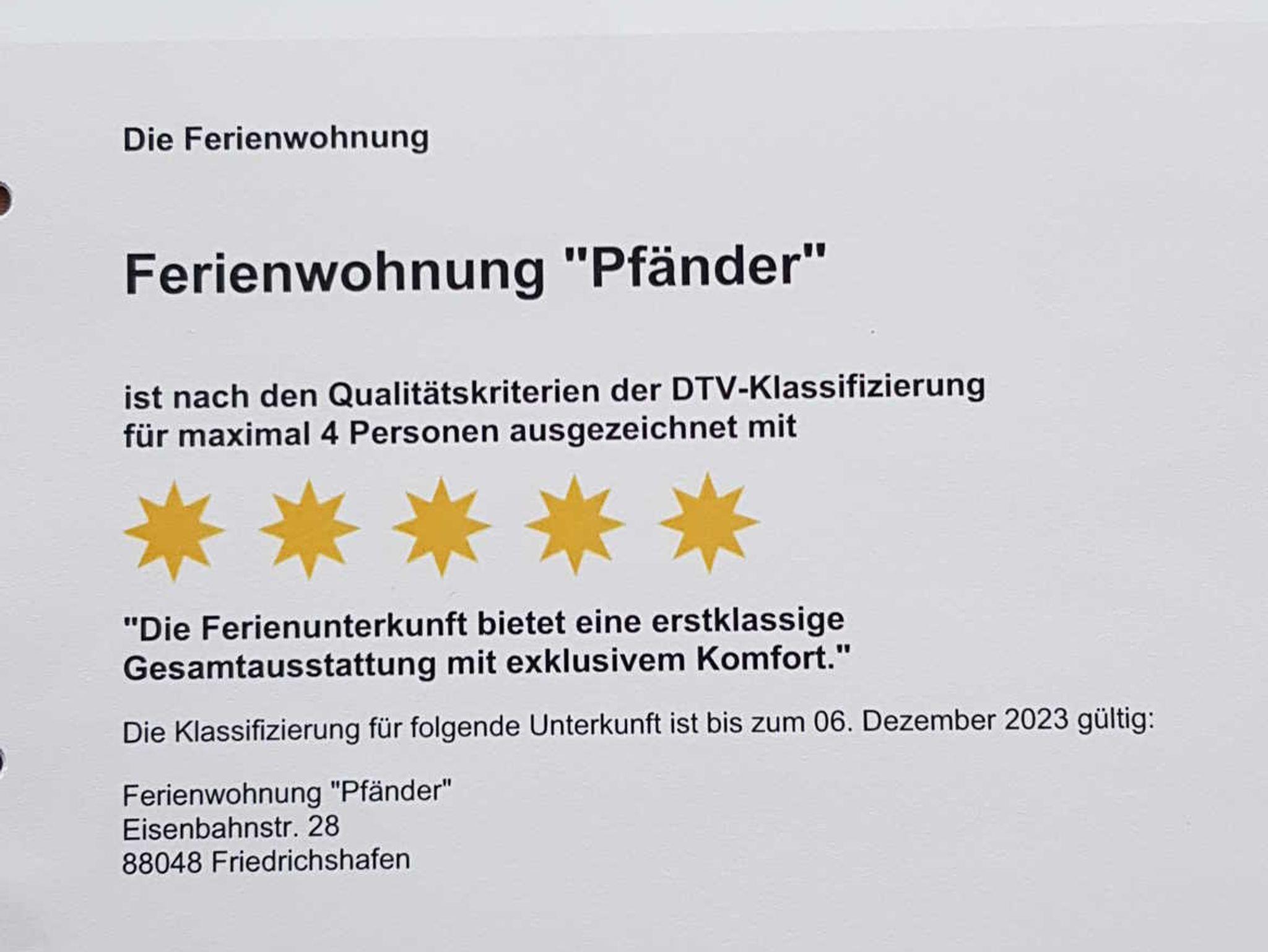 Die Ferienwohnung Pfänder ist vom Deutschen Tourismus Verband mit 5 Sternen ausgezeichnet worden.