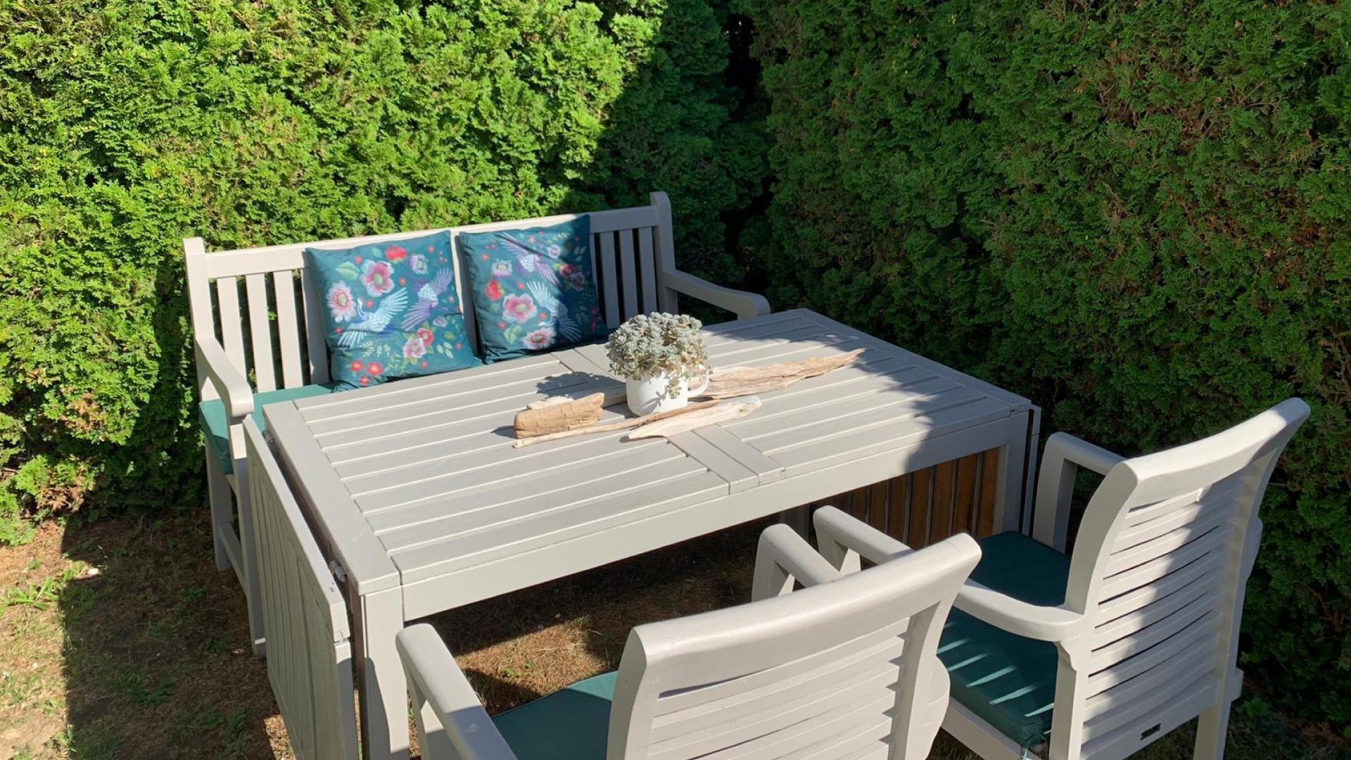 Liebevoll eingerichteter Wohn- und Schlafraum für 2 Personen mit großem Doppelbett und hochwertigem Schlafsofa, Badezimmer mit Dusche, WC, Föhn, Handtuchwärmer und Kosmetikspiegel, Einbauküche, Überdachte 20 m² Terrasse mit großzügigem Garten, Ausblick: in den Garten Fußweg direkt am See: nur 10 Min. zum Strandbad, zum Zentrum Friedrichshafen ca. 25 Minuten, Lage: EG