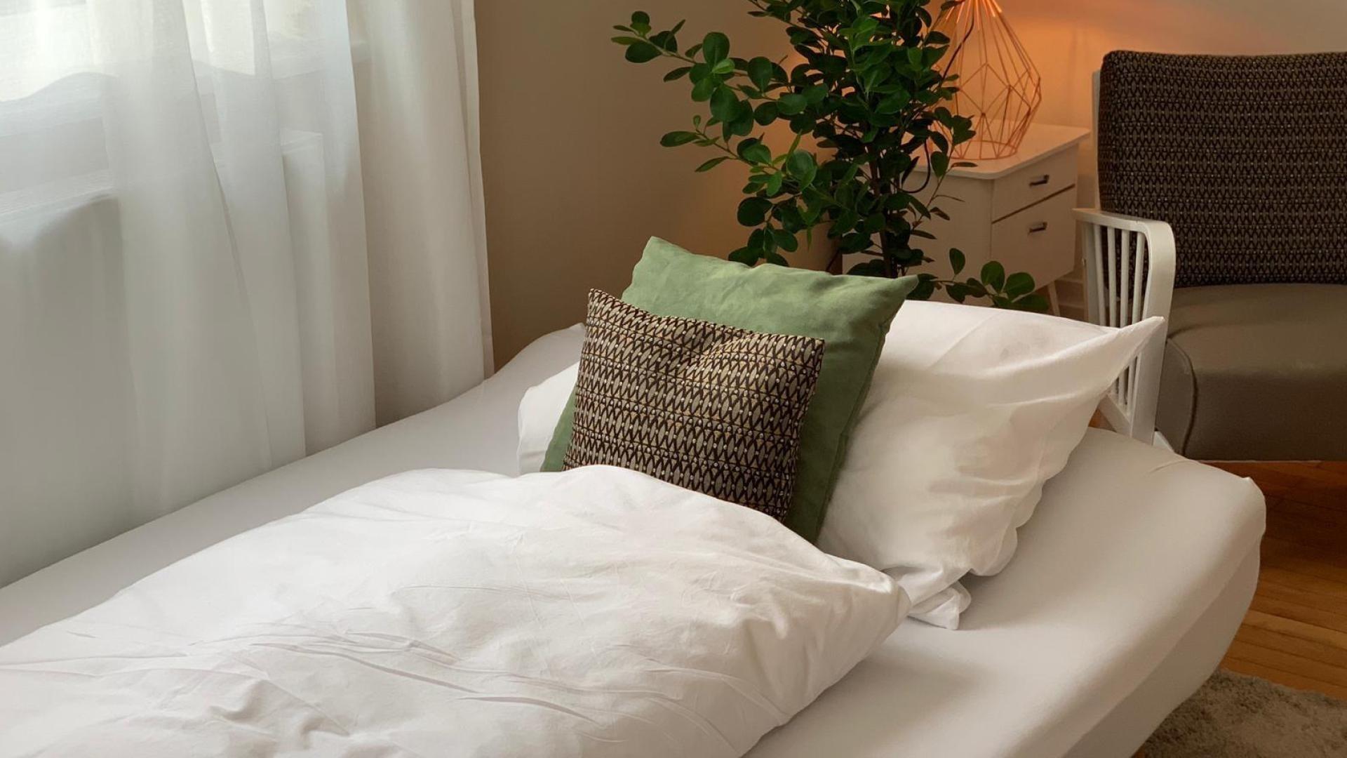 • Liebevoll eingerichteter Wohn- und Schlafraum für 2 Personen mit großem Doppelbett und hochwertigem Schlafsofa (Babybett möglich)