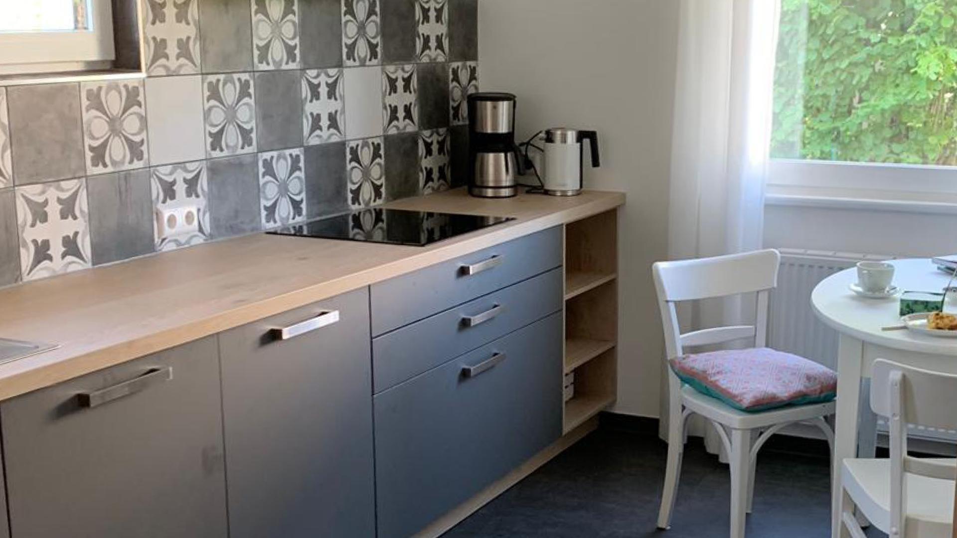 • Einbauküche mit Induktionsherd, Backofen, Kühlschrank mit Gefrierfach, Wasser-/Eierkocher, Kaffeemaschine und Toaster