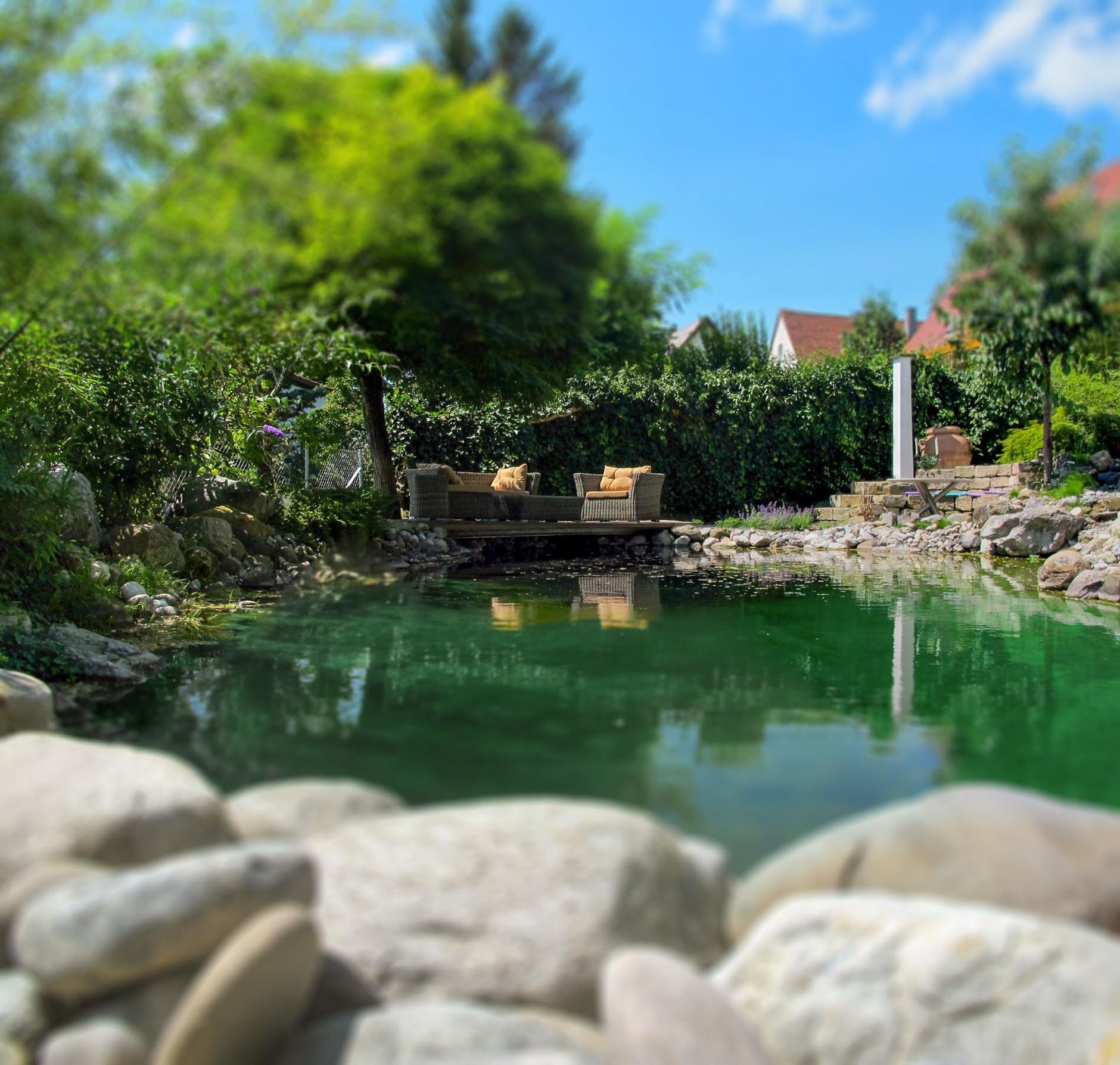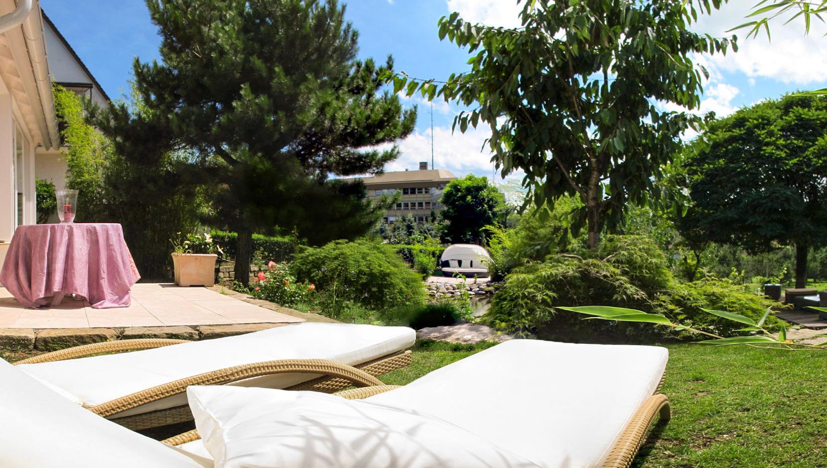 Der neu angelegte Garten mit mehreren Terrassen, Sitzplätzen, Liegewiesen sowie großem Teich mit Wasserfall lädt zum Verweilen, Entspannen und Grillen ein.