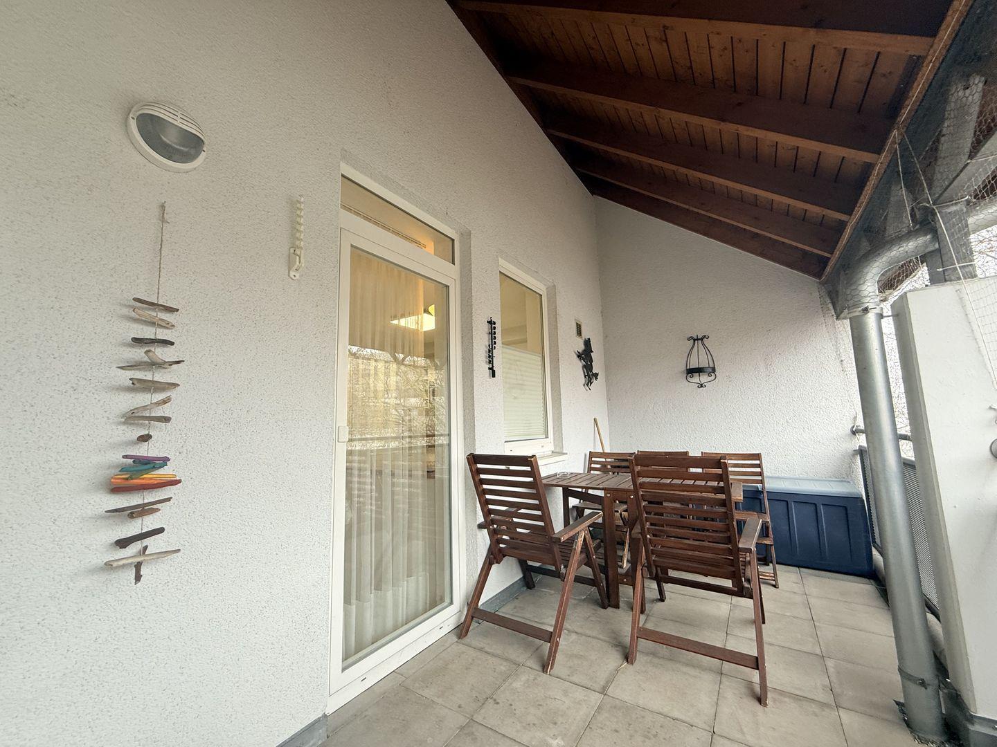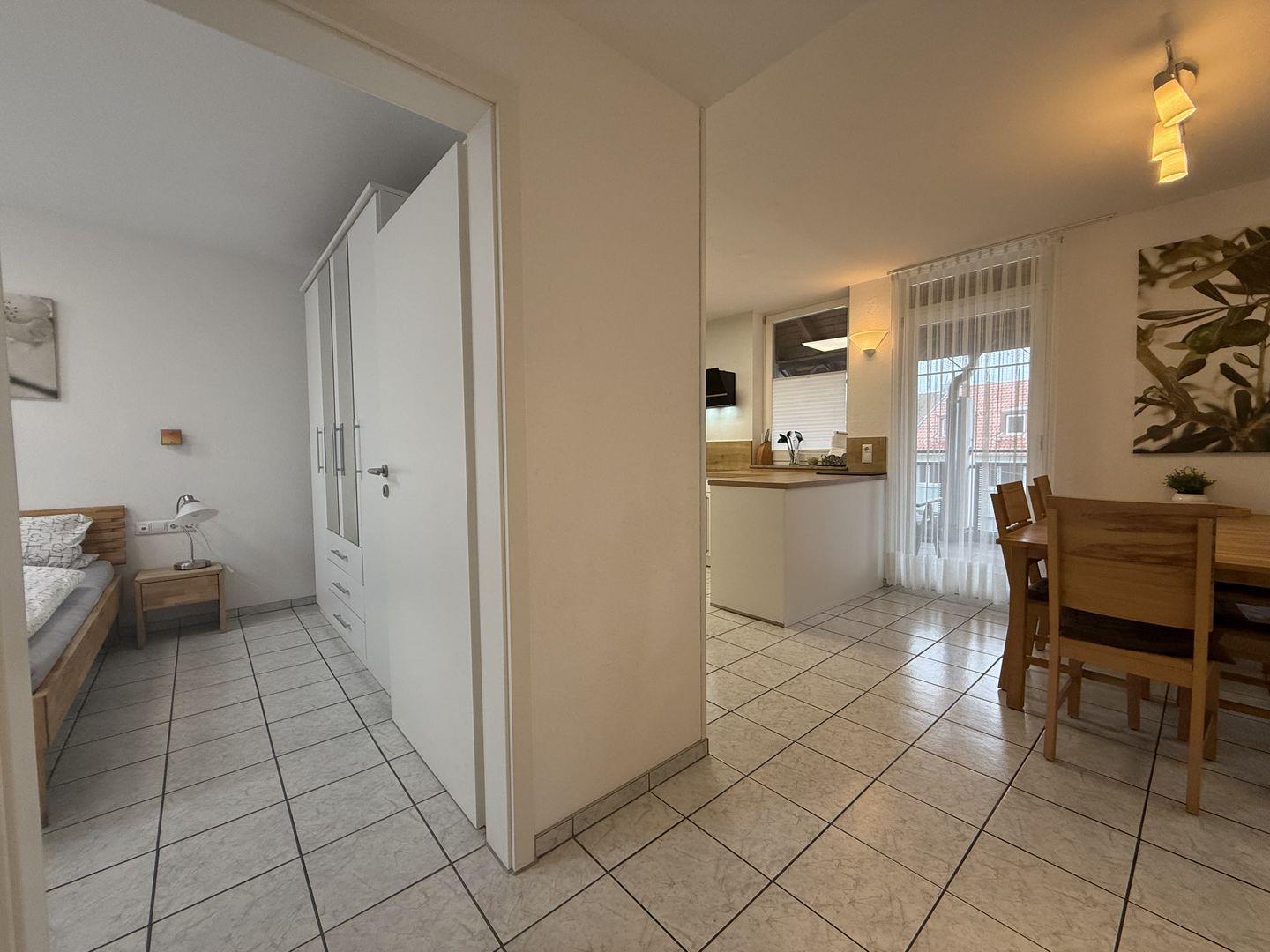 Die Wohnung verfügt über zwei Schlafzimmer. Eines ist mit einem großen Doppelbett ausgestattet, das zweite bietet ebenfalls ein Doppelbett sowie ein Stockbett für zwei Kinder. In beiden Schlafzimmern steht Ihnen ein Fernseher zur Verfügung. Der offene Wohnbereich mit gemütlicher Sitzecke lädt zum Entspannen ein. Die angrenzende Küche mit Essbereich ist voll ausgestattet mit Herd, Backofen, Kühlschrank, Geschirrspüler und Kaffeemaschine, sodass Sie sich bequem selbst versorgen können. Ein modernes Badezimmer mit Dusche sowie ein überdachter Balkon runden das Angebot ab und sorgen für ein angenehmes Wohngefühl.