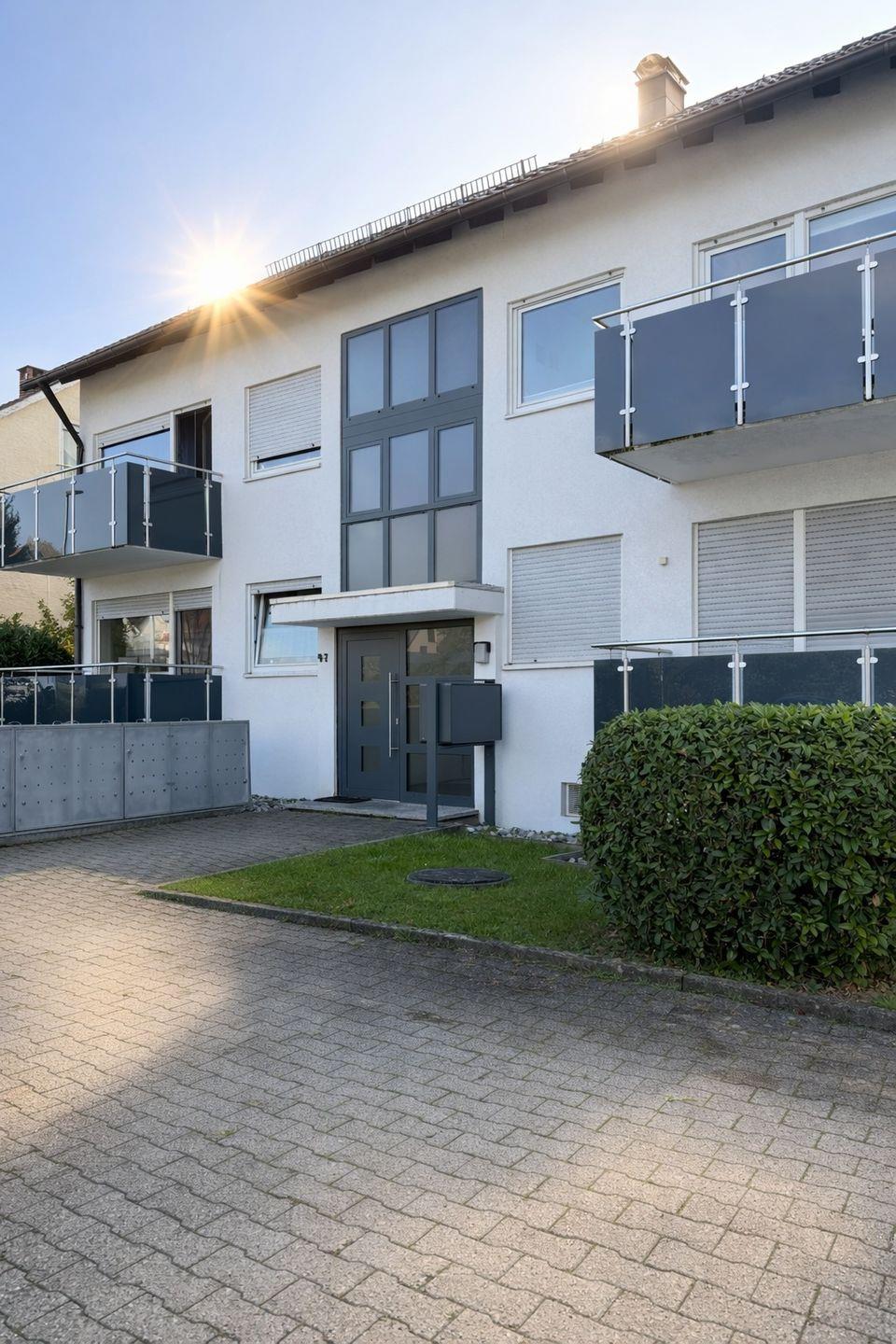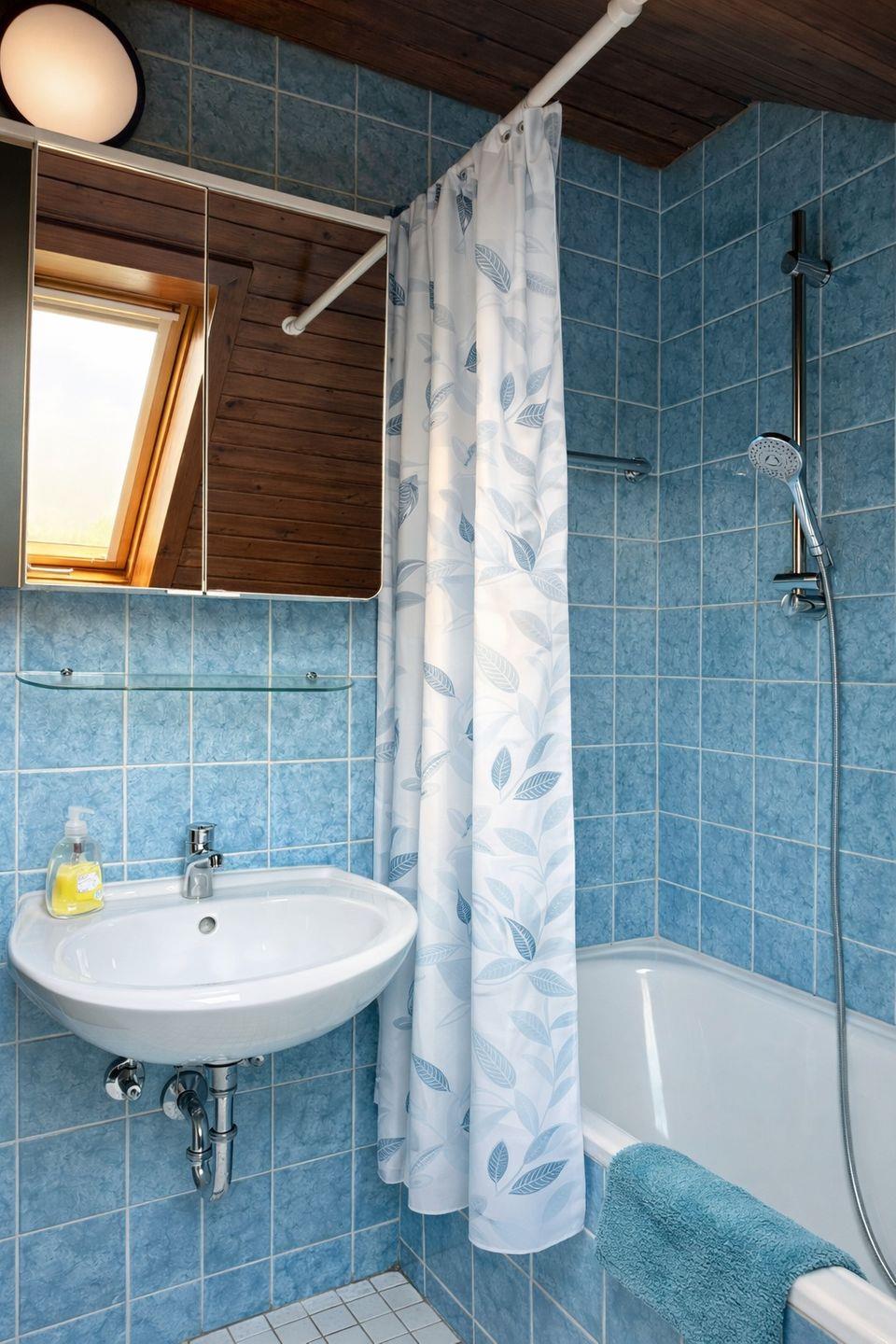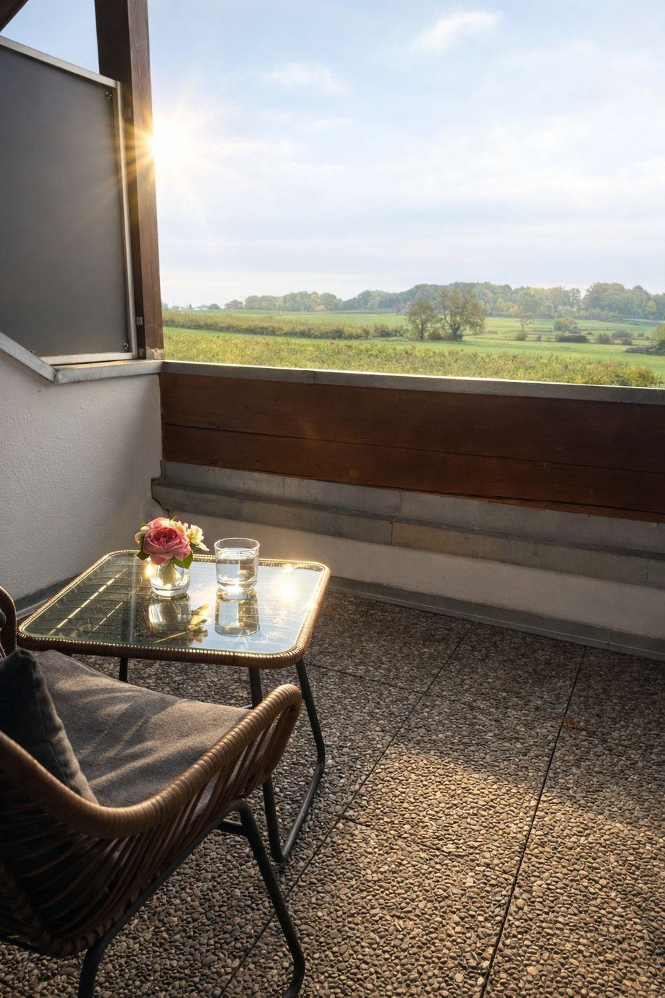 Das Badezimmer ist hell und gepflegt und verfügt über eine Badewanne mit Duschmöglichkeit, ein Waschbecken, Spiegel und WC. Ein besonderes Highlight ist der kleine, überdachte Balkon mit Sitzgelegenheit und Blick über Felder und Wiesen – ideal für den Morgenkaffee oder zum Entspannen am Abend.