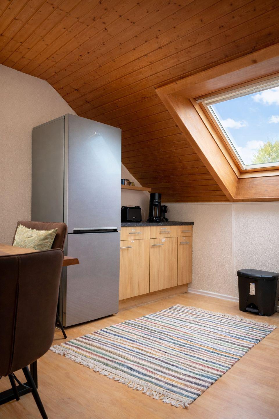 Die moderne Küche ist vollständig ausgestattet mit Kühlschrank, Herd, Backofen, Kaffeemaschine, Toaster und Wasserkocher. Am großen Esstisch unter dem Dachfenster genießen Sie Ihr Frühstück oder Abendessen mit viel Tageslicht und schönem Ausblick.