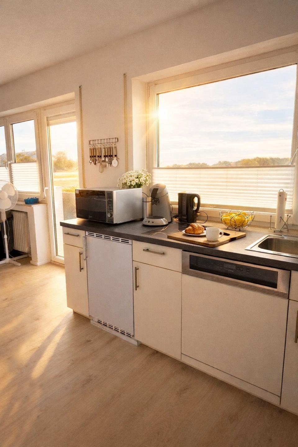 Die Küchenzeile bietet alles, was Sie für Ihren Aufenthalt benötigen: Kühlschrank, Geschirrspüler, Mikrowelle, Kaffeemaschine, Wasserkocher, Toaster sowie ausreichend Geschirr und Kochutensilien. Ein gemütlicher Essbereich lädt zum gemeinsamen Frühstück oder Abendessen ein.