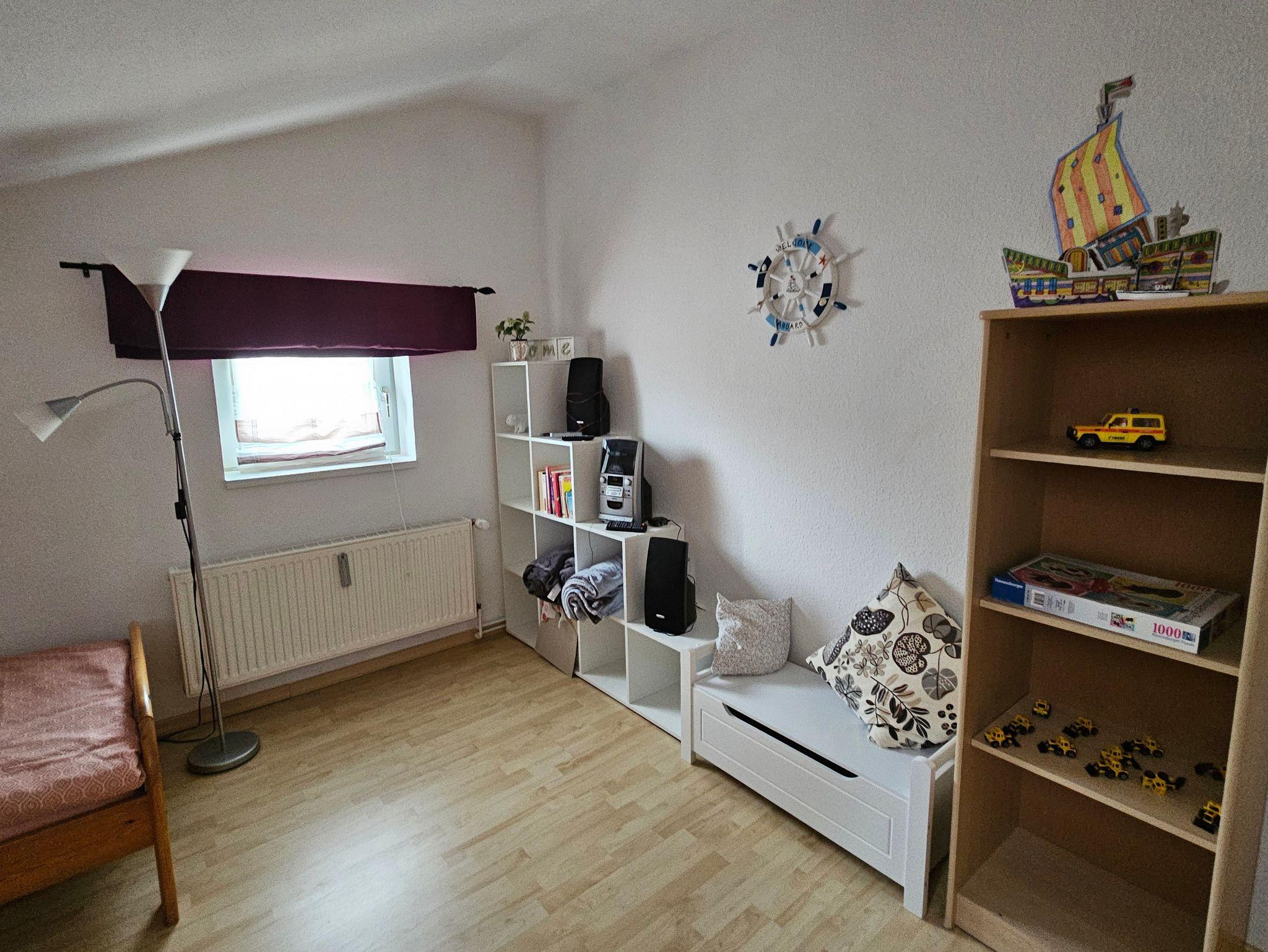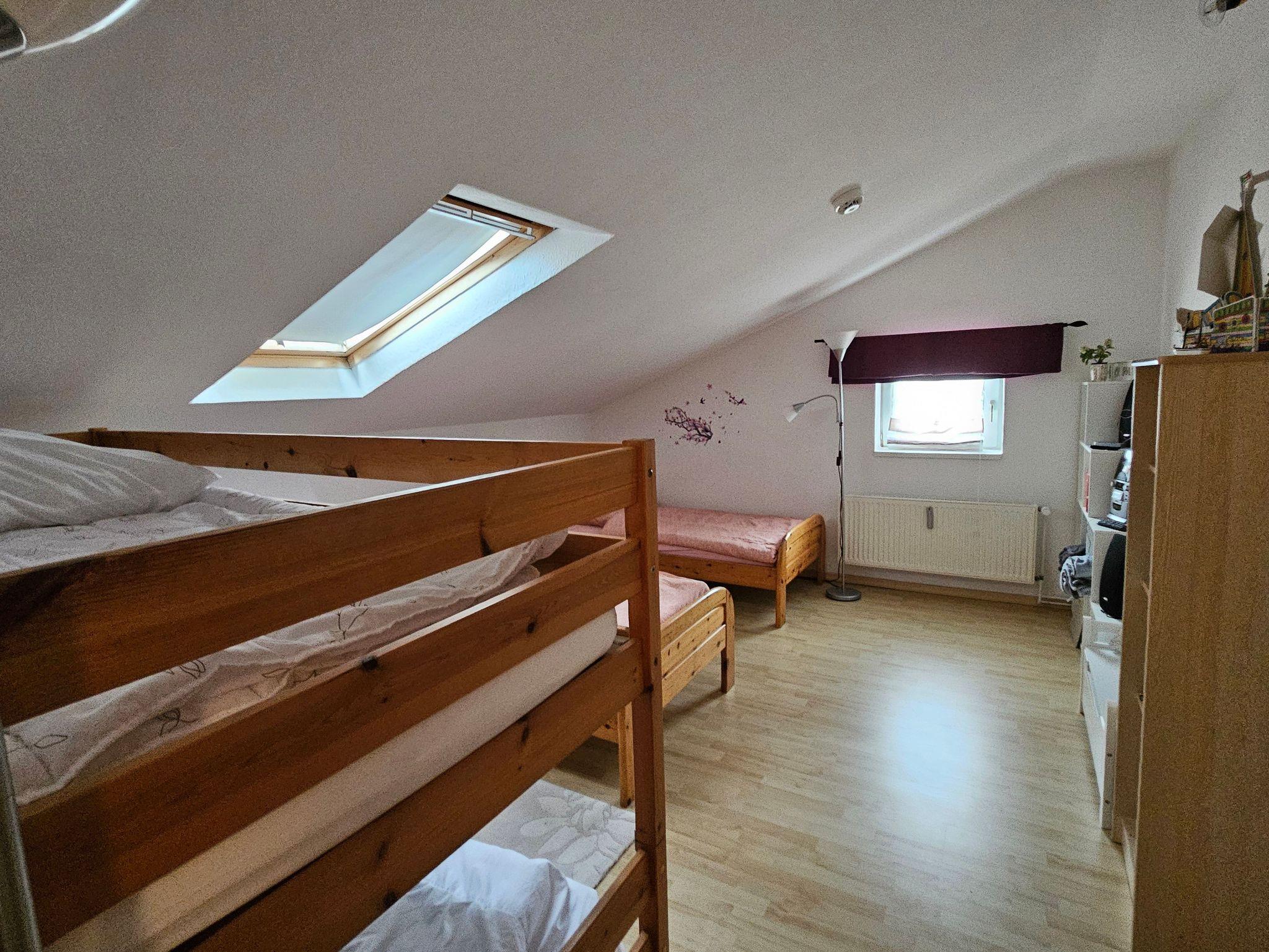 ein großes Kinderzimmer mit 2 Betten und einem Etagenbett