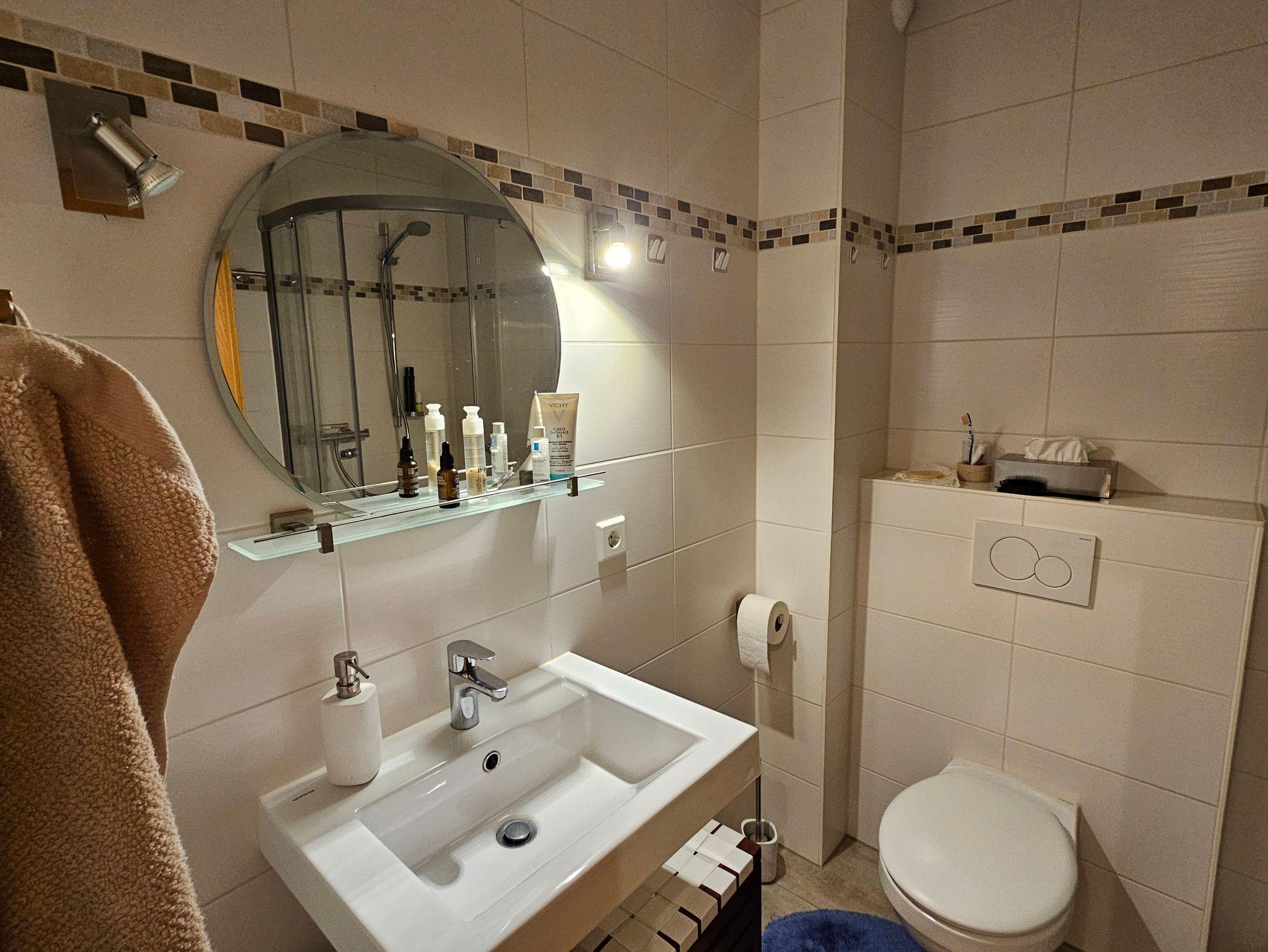 modernes Bad mit Waschtrockner stehen für Sie bereit.