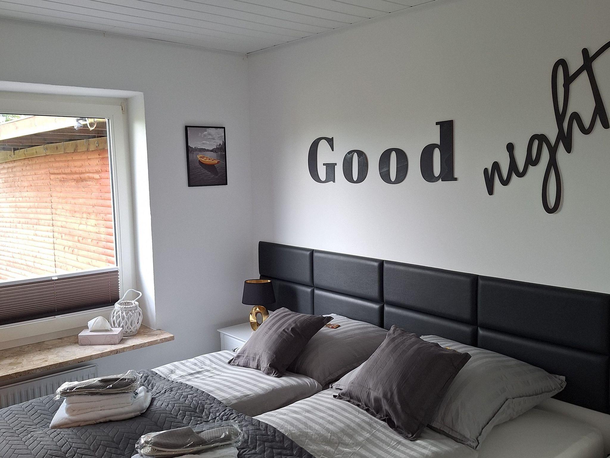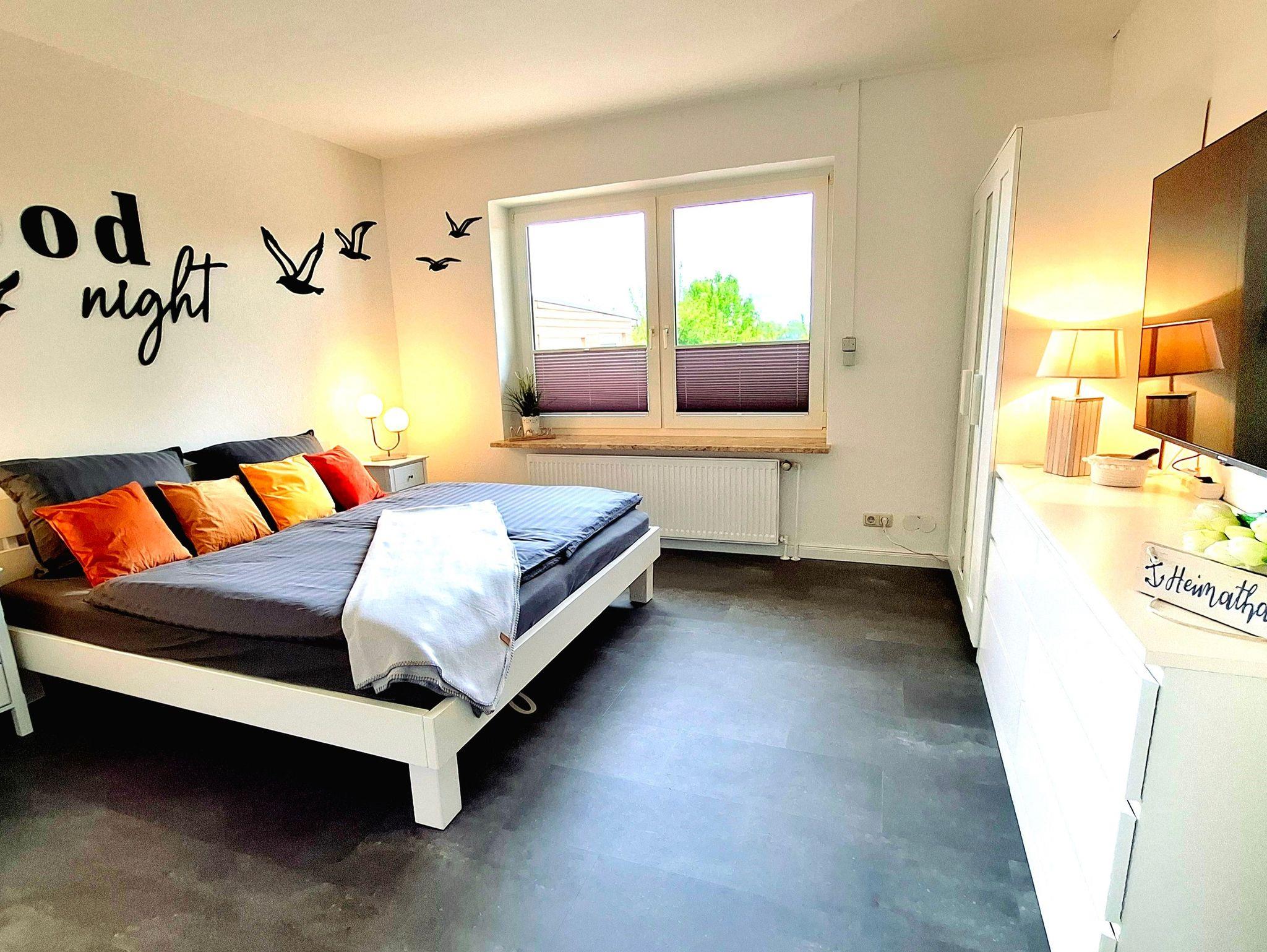 Schlafzimmer 1: Doppelbett, 55-Smart-TV, großer Kleiderschrank, Nachttische mit USB-Ladestationen