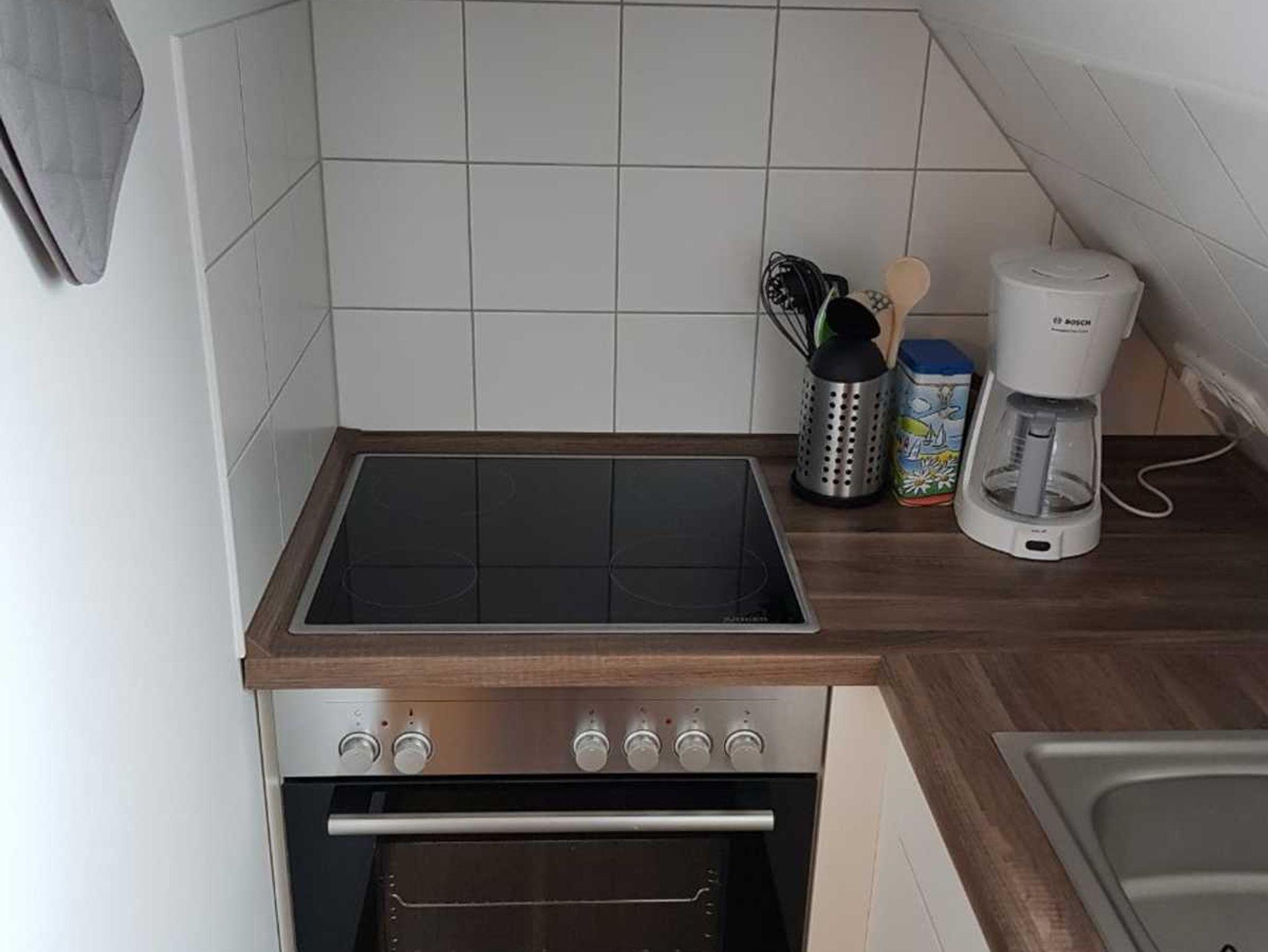 • Die Küche hat einen Kühlschrank, einen Herd, diverse Kleingeräte wie Toaster, Wasserkocher, Kaffemaschine etc.