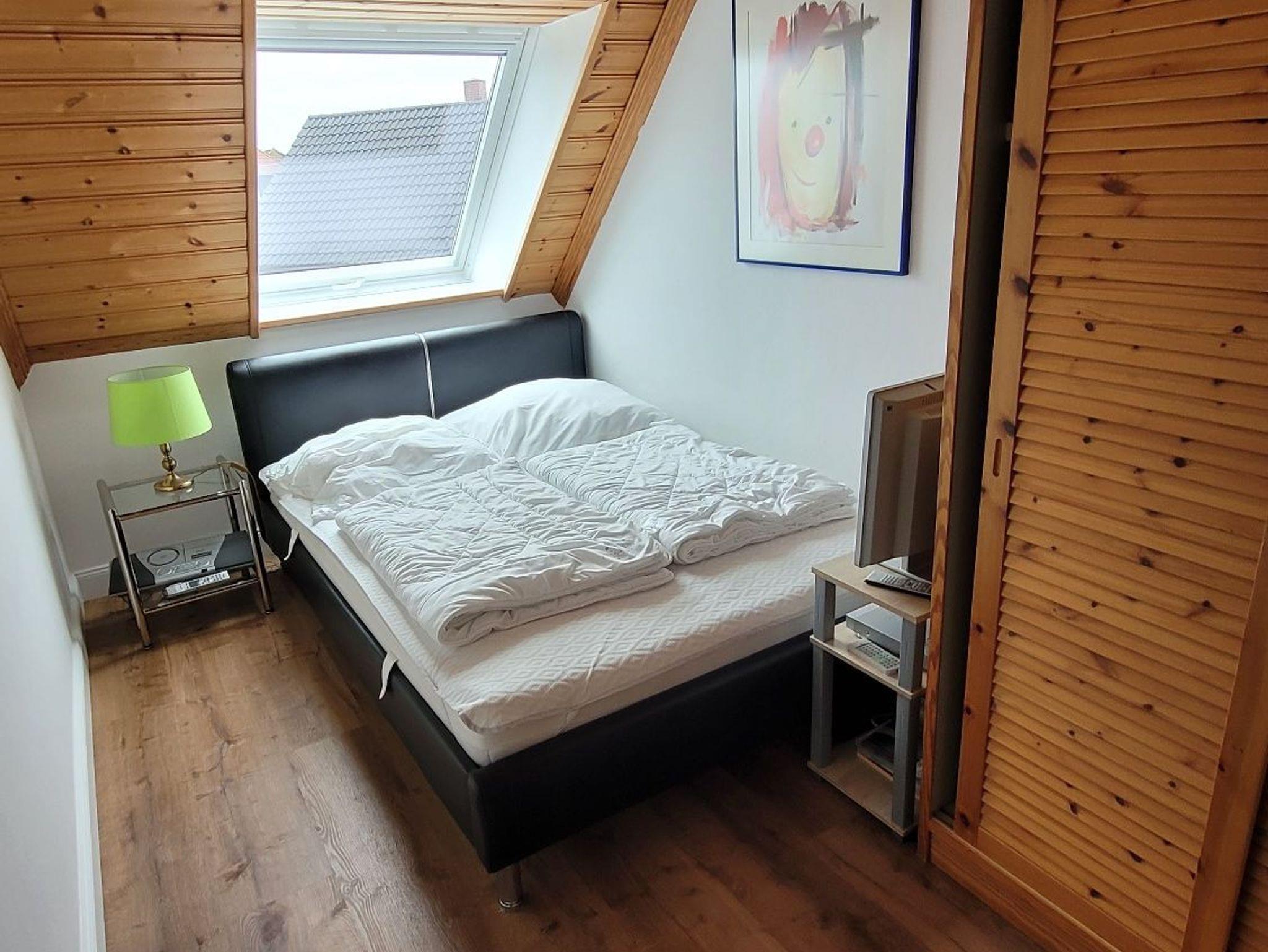 Dachgeschoss, bis drei Personen, ca. 45 m² große, gemütliche Wohnung mit Kieferndecken. In der Wohnung befinden sich Flur, gemütlicher Wohn-/Schlafraum mit Essecke, Badezimmer mit Wanne, separate Küche mit Einbauküche.