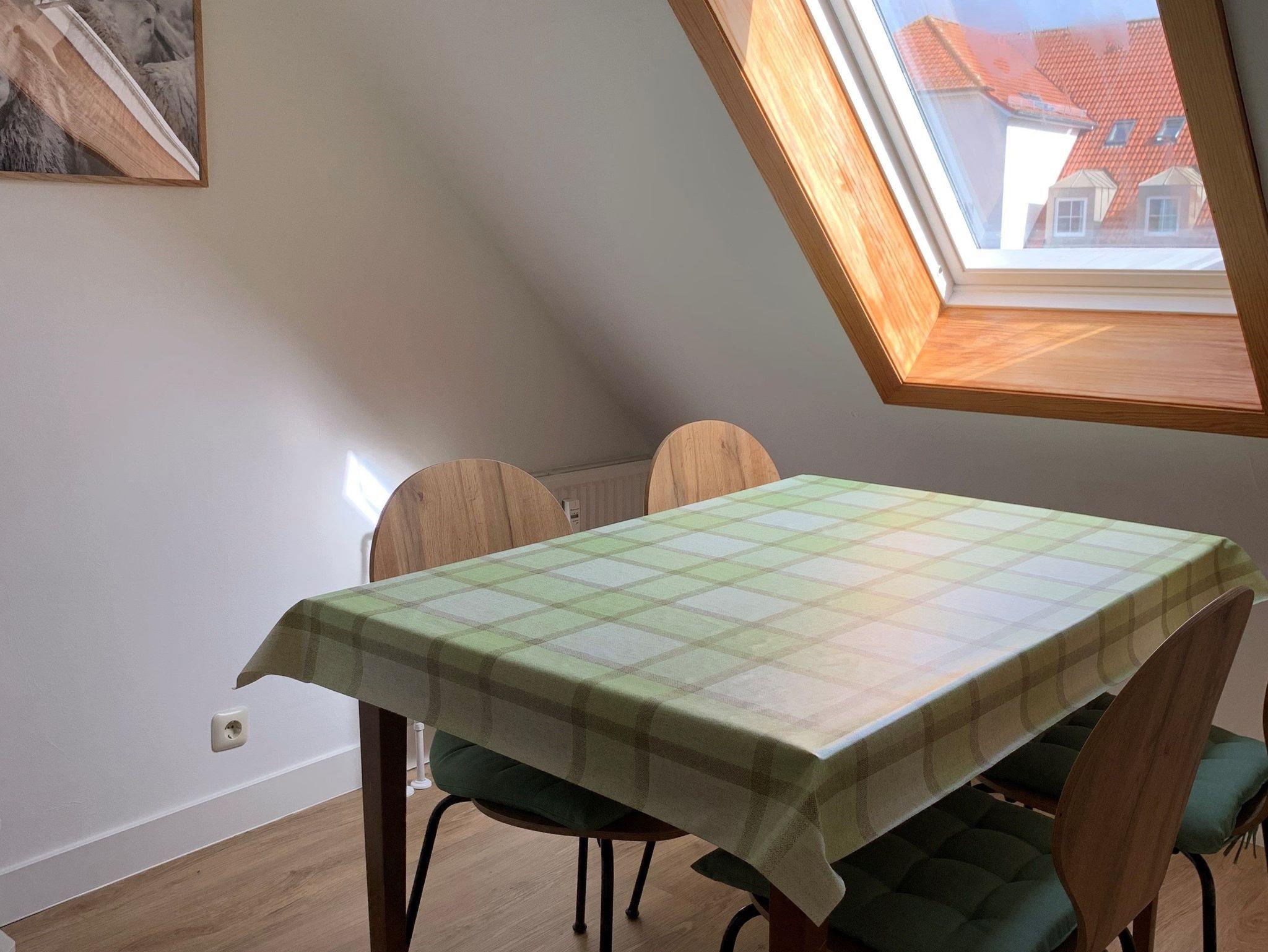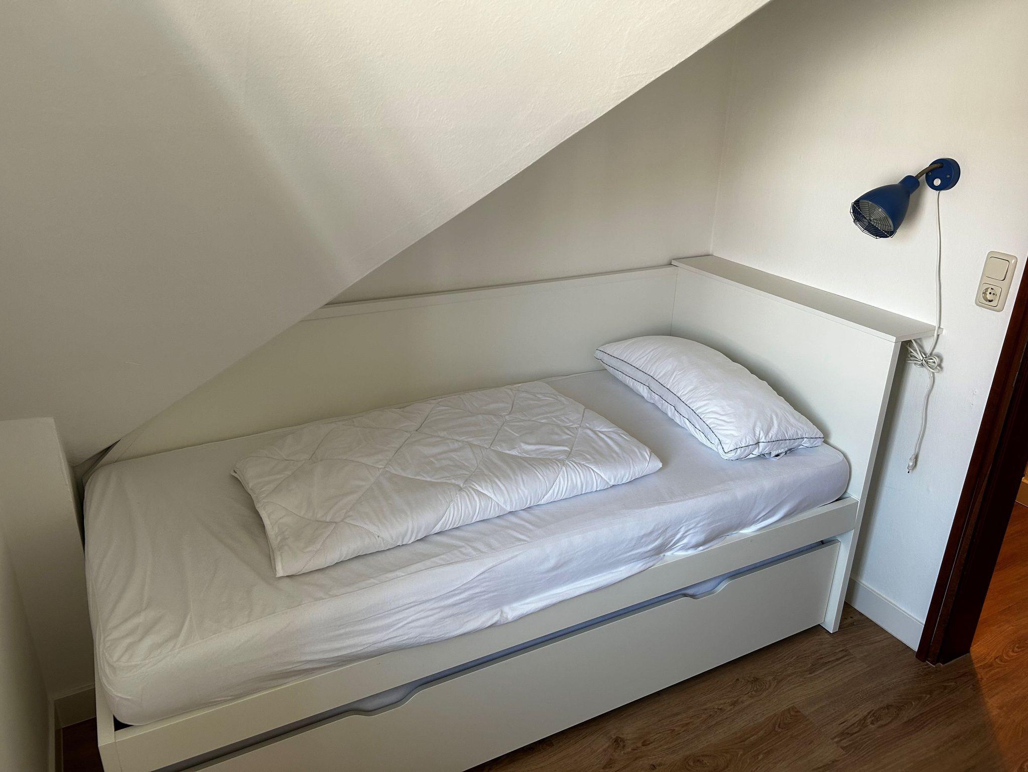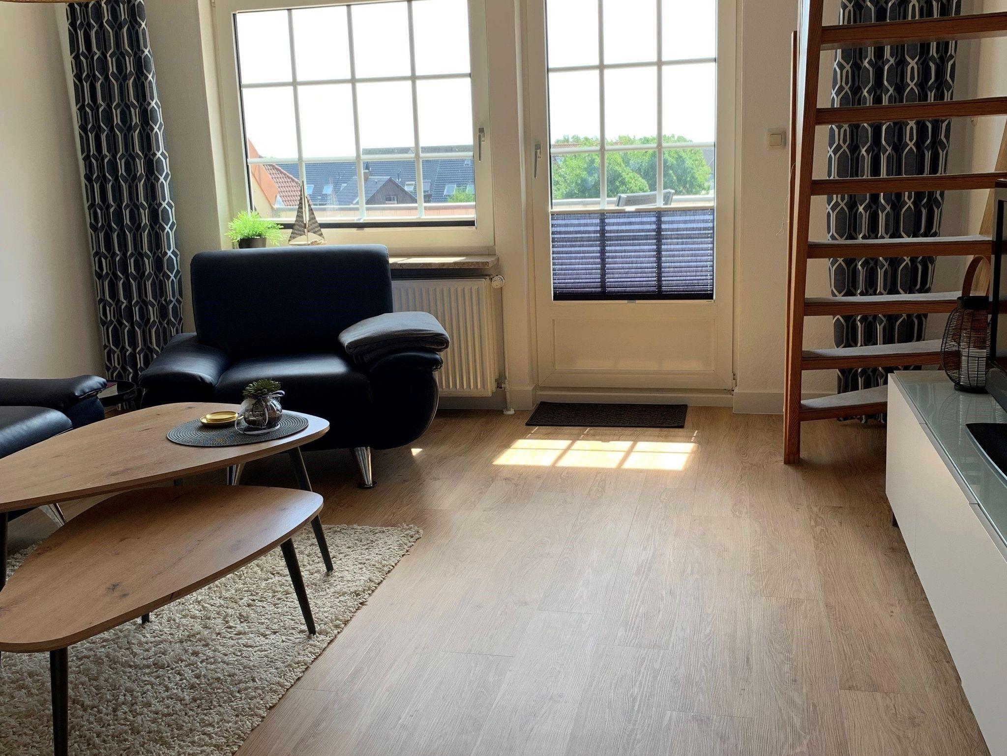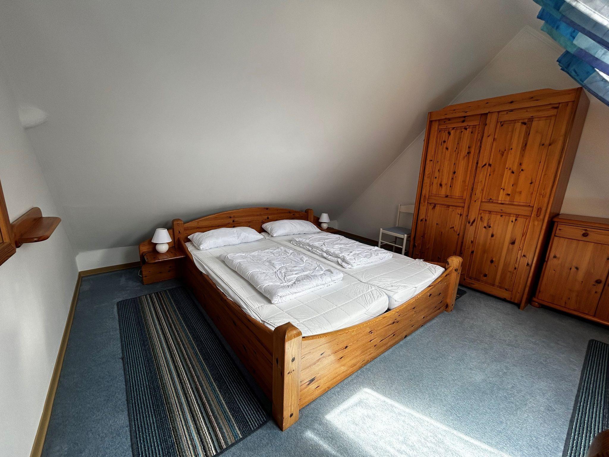 Morgens begrüßt Sie in der voll ausgestatteten Küche die Sonne. Frische Brötchen erhalten Sie in der Bäckerei im Erdgeschoss. Vom gemütlichen Wohnzimmer aus führt eine Raumspartreppe ins Dachgeschoss, wo sich das Elternschlafzimmer mit einem Doppelbett befindet und vom dem aus Sie einen herrlichen Blick über den Deich und auf das Wattenmeer haben. Ein weiteres kleines Schlafzimmer mit zwei Schlafplätzen im Ausziehbett ist in der unteren Etage vorhanden. Auf der schönen Loggia können Sie vom späten Vormittag bis zum Abend die Sonne genießen. Die 2022/23 teilmodernisierte Wohnung verfügt über einen kostenfreien WLAN-Zugang. Ein eigener Stellplatz befindet sich auf dem Grundstück.