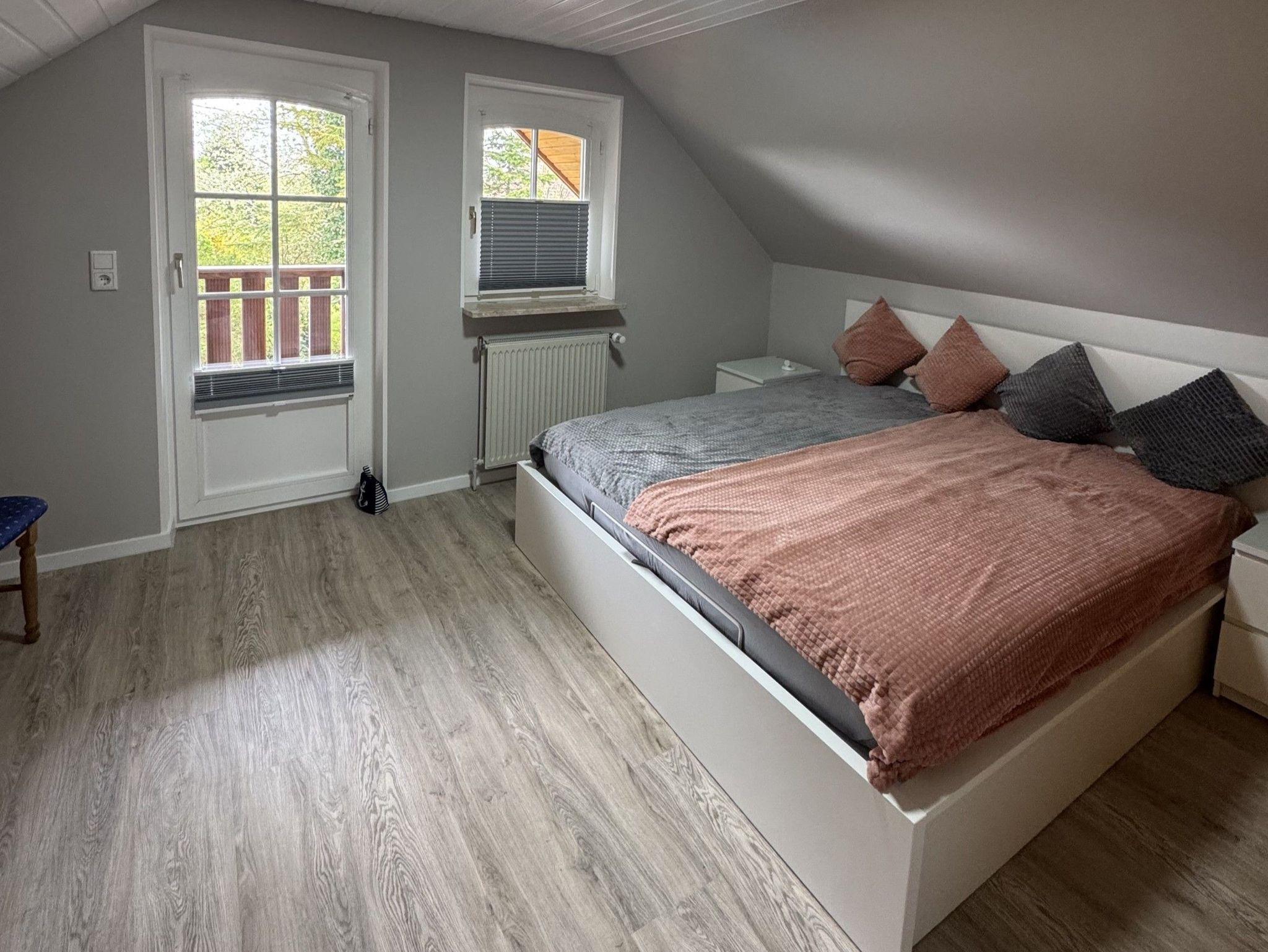 • großes Schlafzimmer mit massivem Einbauschrank, 1,80 m Doppelbett und Balkonzugang