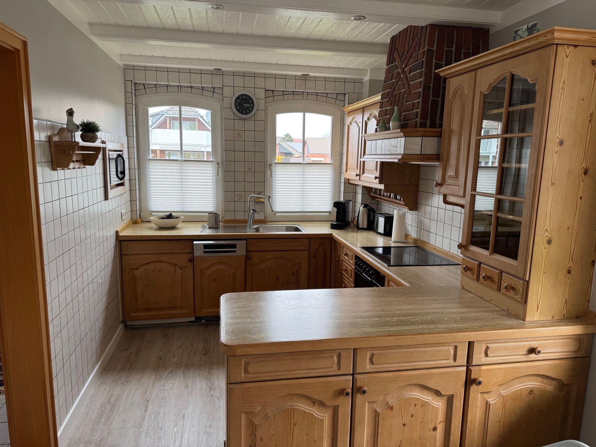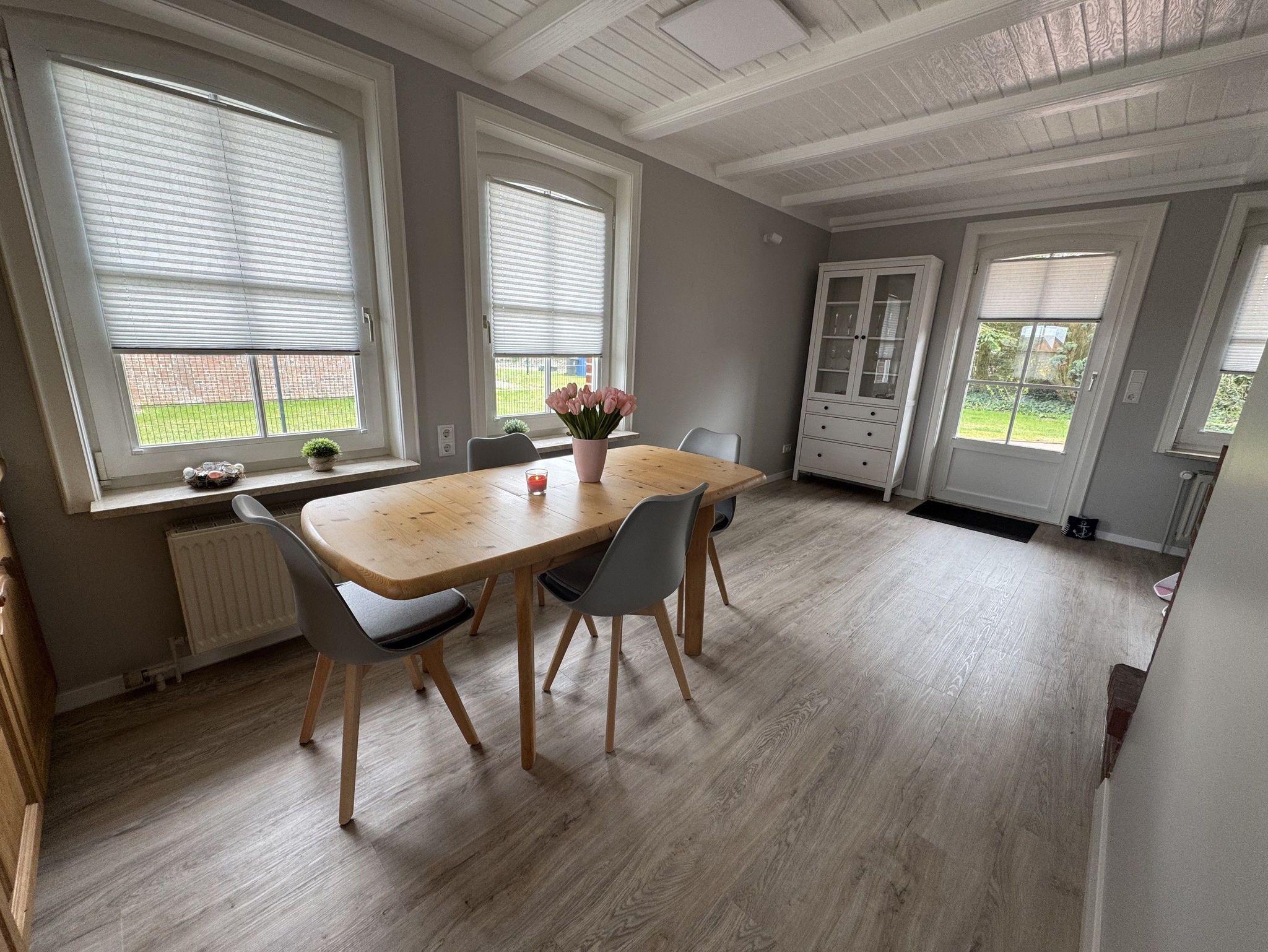 Die Massivholz-Einbauküche lässt keine Wünsche offen: Sie ist mit hochwertigen Elektrogeräten, Geschirr und allem ausgestattet, was Sie zum Kochen brauchen. Direkt anschließend lädt der helle Essbereich mit Blick in den Garten bis zu 6 Personen zum Verweilen ein.