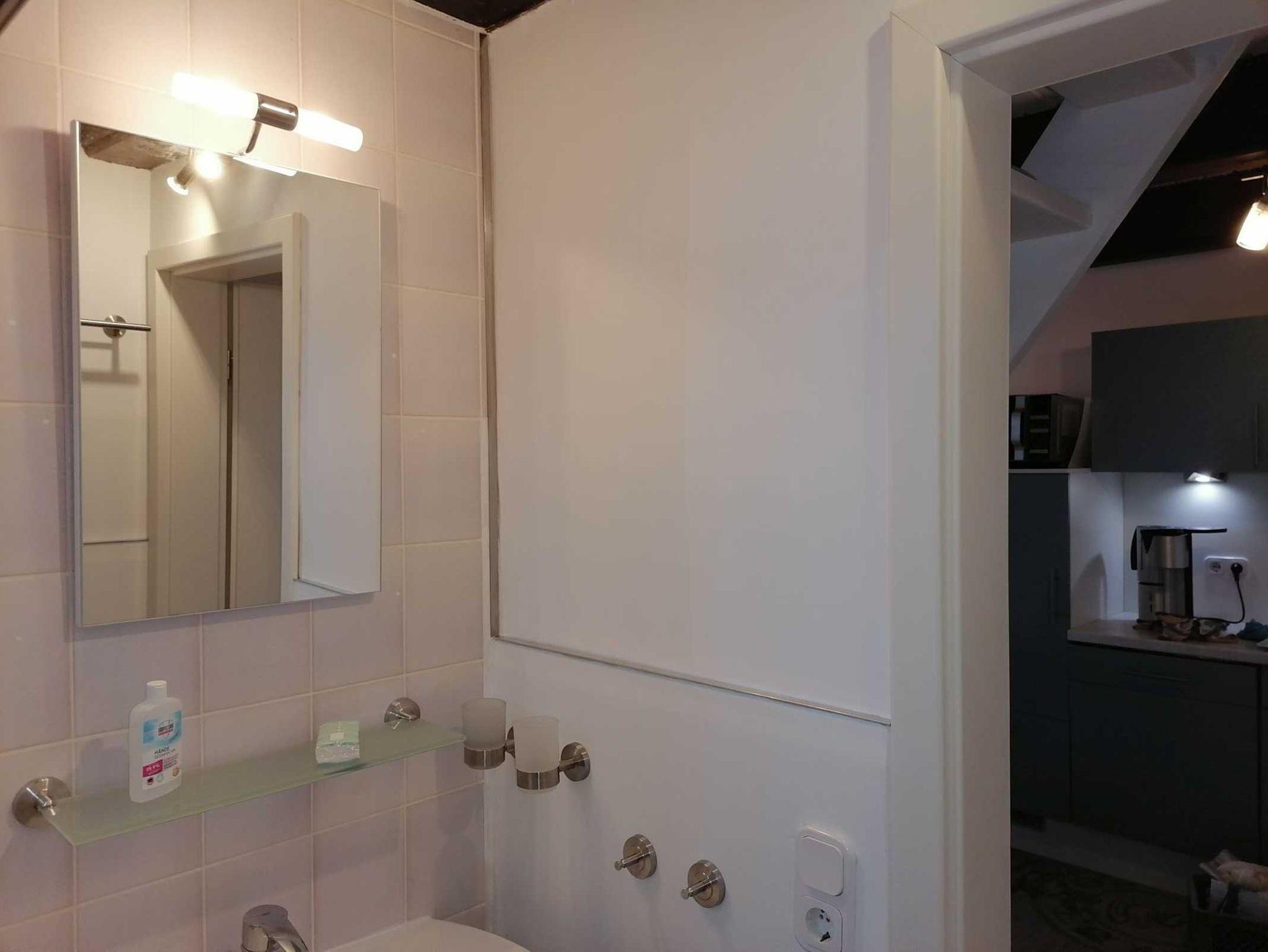 Die 55 m² große und gemütlich eingerichtete Ferienwohnung liegt im ersten und zweiten Obergeschoss. Sie verfügt über ein Schlafzimmer, Bad mit Dusche und WC sowie eine Küche mit Wohn-/Essbereich mit Eckcouch und einem Ausziehtisch. Das Schlafzimmer verfügt über ein Bett (160 x 200) mit zwei Einzellattenrosten und Matratzen. Dazu kommt ein Wohn- und Schlafbereich im zweiten Obergeschoss unter dem Dach mit zwei weiteren Schlafmöglichkeiten. Hier befindet sich auch ein PC auf dem mitgebrachte Spiele installiert werden können, Wlan ist auch vorhanden. Die Küche ist ausgerüstet mit einem Kühlschrank, einem Ceranfeld, einer Spülmaschine sowie Kaffeemaschine, Toaster, Heißwasserbereiter, Eierkocher, Sandwichtoaster, Mikrowelle mit Backfunktion und Sandwichmaker. TV, DVD PLayer, Radio/CD sind vorhanden. Alle Räume sind mit Laminat bzw. Fliesen ausgelegt. Eine in einem kleinen Raum im Hausflur befindliche Waschmaschine bzw. Trockner kann gegen ein geringes Entgelt benutzt werden. Bettwäsche und Handtücher können hinzu gebucht werden. Die Wohnung ist für vier Personen ausgelegt. Das Mobiliar umfasst auch ein Kinderbett und einen Hochstuhl sowie Spiele und Bücher.