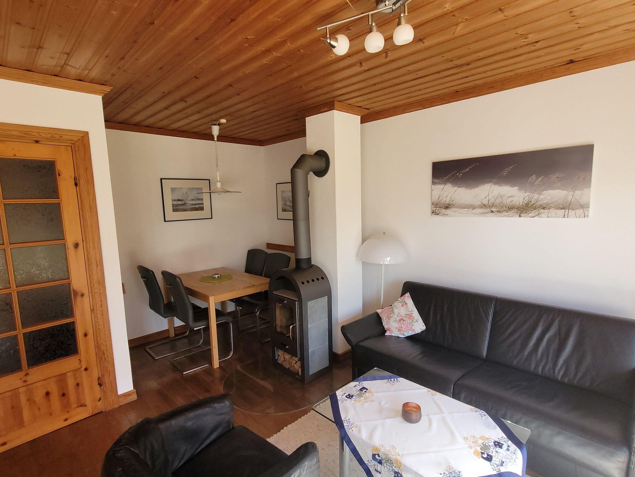 Wohn-/Schlafraum: Bequemes Schlafsofa mit Lattenrost für zwei Personen, LCD-Fernseher mit Sat-Empfang und DVD-Player, Kaminofen, Essecke für vier Personen.