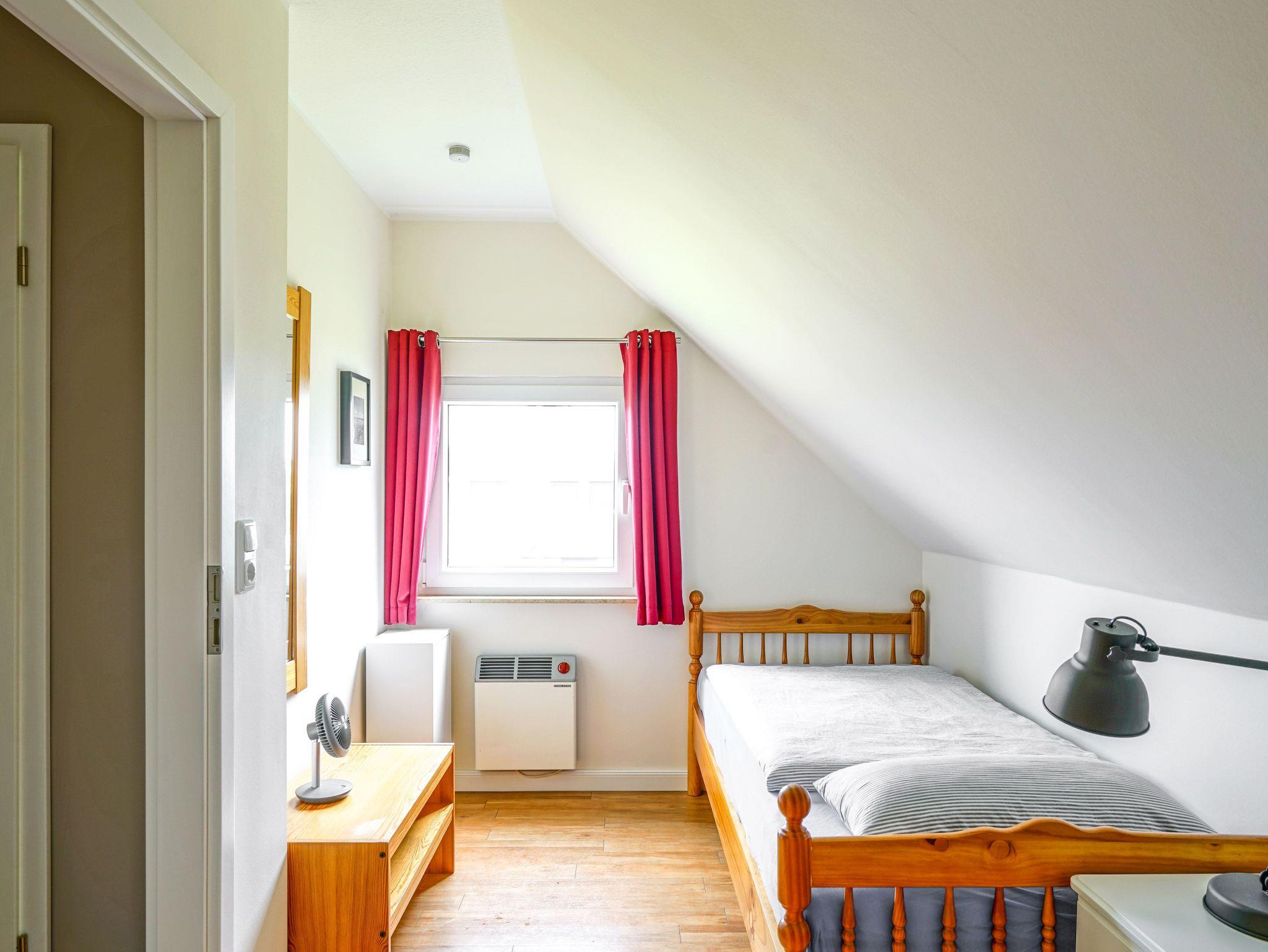 Wendeltreppe ins Dachgeschoss mit einem großem Schlafzimmer mit Doppelbett und Kleinkindbett, geräumigem Schrank und Arbeitsmöglichkeit, einem kleineren Schlafzimmer mit zwei Einzelbetten und Kleiderschrank sowie einem modernen Duschbad mit Regendusche.
