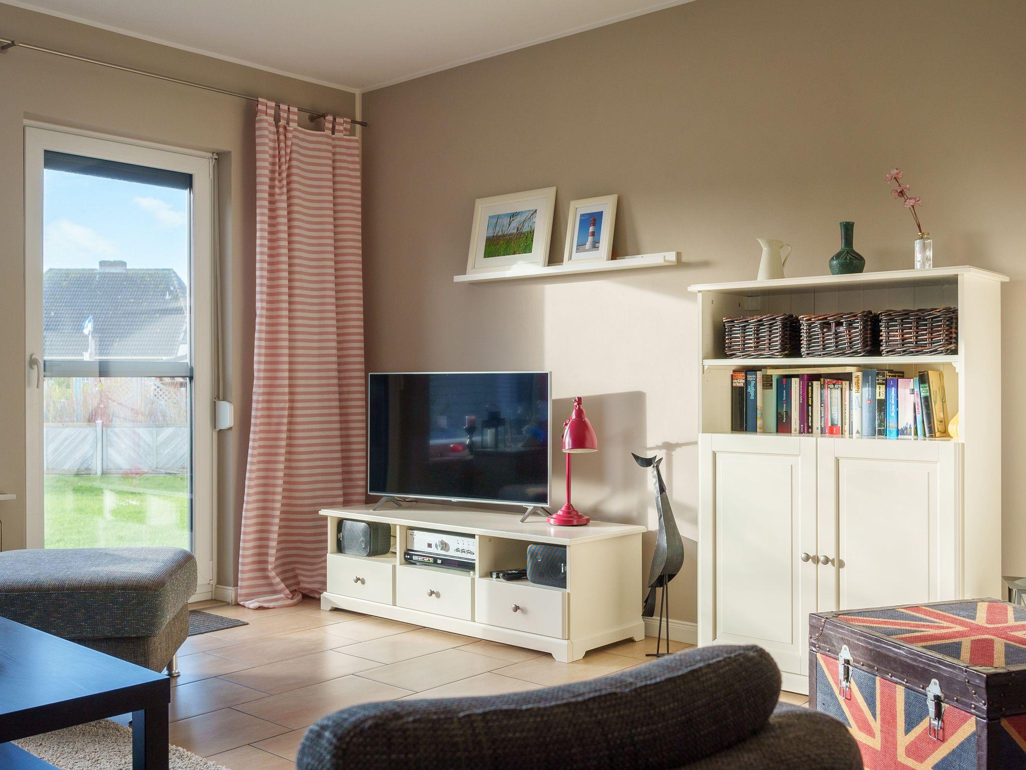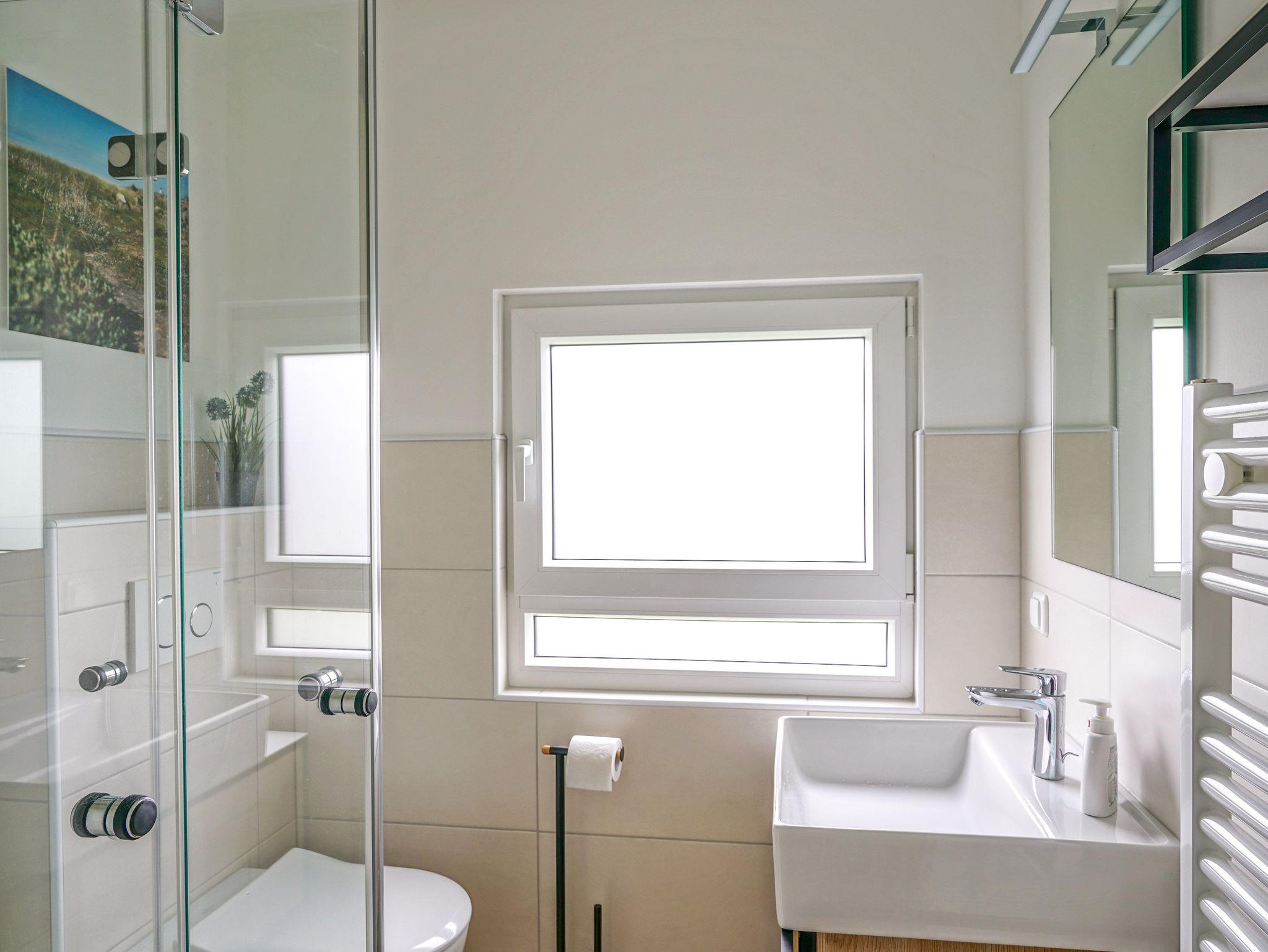 Die Unterkunft erstreckt sich vom Erdgeschoss mit Wohn-/Esszimmer, Terrasse, gut ausgestatteter Küche und Gäste-WC über eine Wendeltreppe ins Dachgeschoss mit einem großen Schlafzimmer mit Doppelbett und Kleinkindbett, einen weiteren Schlafzimmer mit 2 getrennten Betten und einem gemütlichen Wellness-Duschbad mit Regendusche.