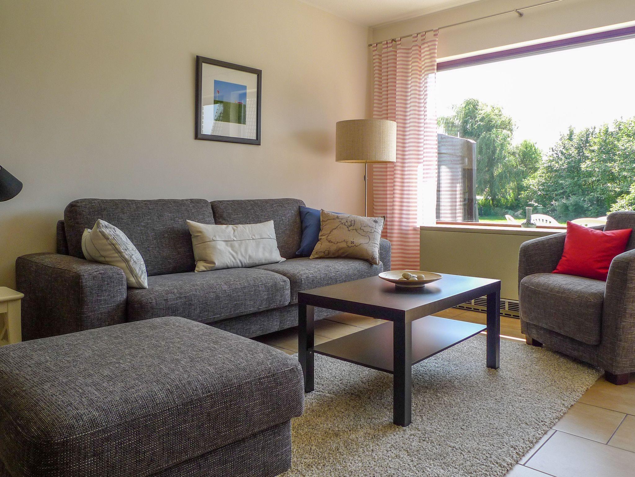 Im Wohnzimmer gemütliches Sofa mit Sessel und Hocker.