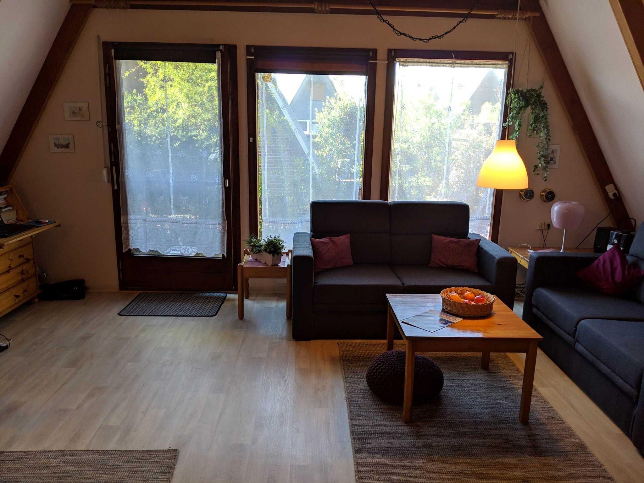Gemütliches individuell eingerichtetes Nurdachferienhaus für maximal vier Personen mit zirka 65 m². Mit großem Garten am Eckgrundstück im Wendehammer nur 100 Meter vom Deich mit Badestrand. Die Einrichtung des Wohnzimmer u.A. Sitzecke mit Couch, Essbereich, Fernseher mit Sat-Anschluß, Video und Radio/CD. Voll ausgestattete Küche u.A. Spüle, 4-Plattenherd mit Backofen, Mikrowelle und Spülmaschine. Zwei Schlafzimmer u.A.jeweils zwei Einzelbetten, Nachttisch, Schrank, Kinderreisebett. Bad u.A. Dusche, Waschbecken und Toilette.