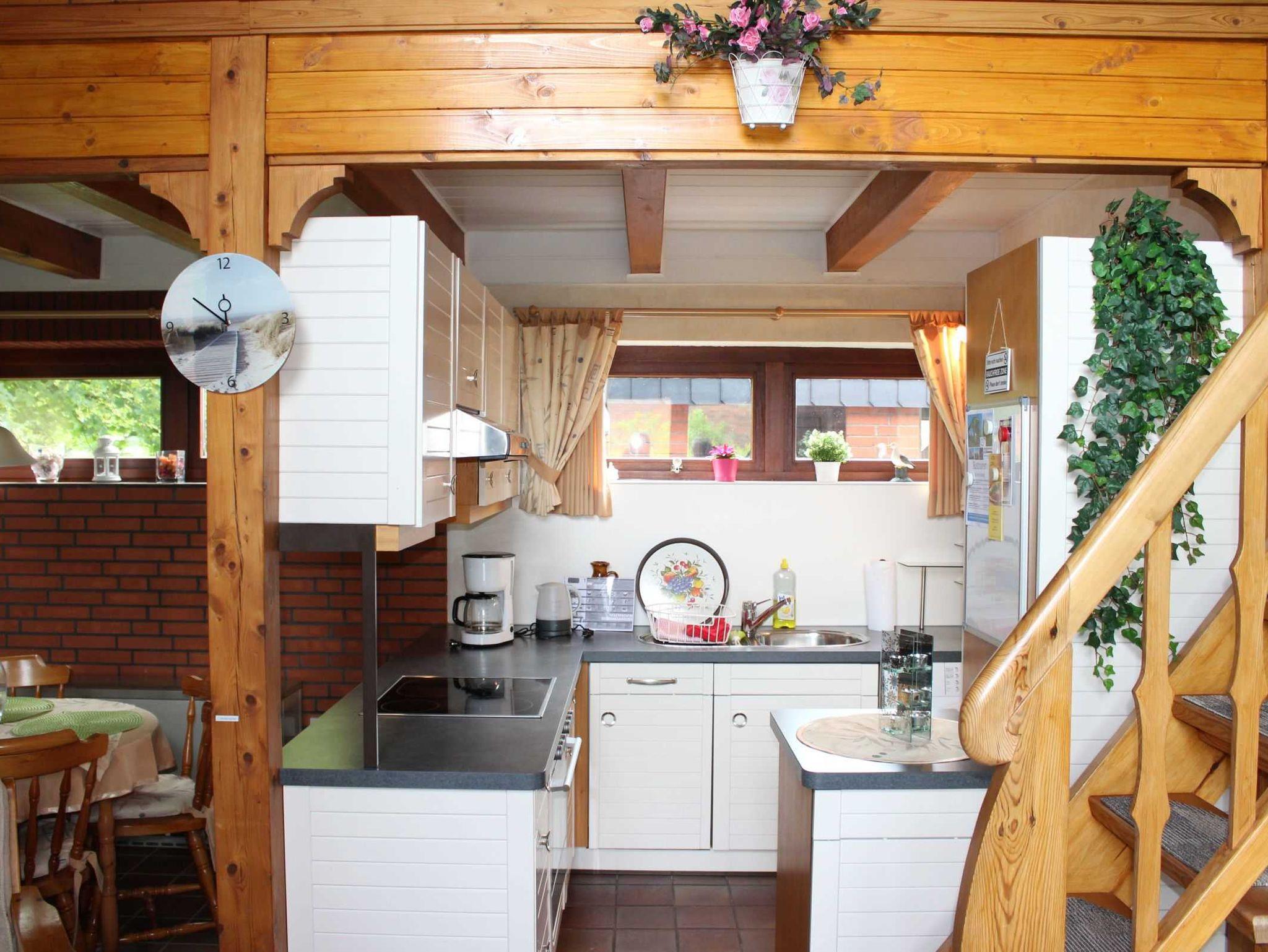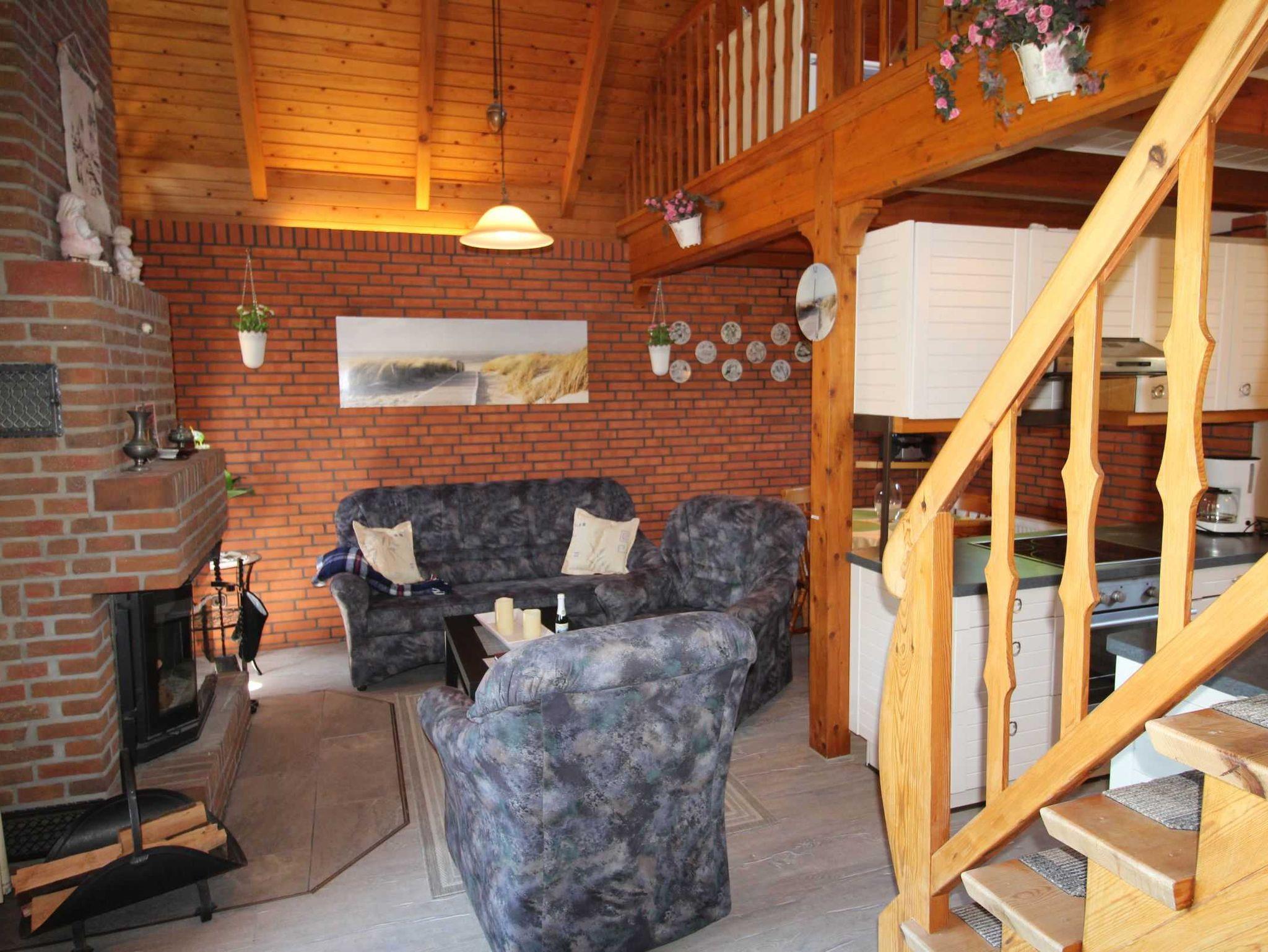 Das Ferienhaus Sandfoort besticht durch seine offene Bauweise mit Galerie im Wohnbereich. Im Erdgeschoß befindet sich der Wohnbereich mit Essecke, offener Küche (4er Ceranfeld, Backofen, Kühlschrank mit Eisfach) und Kamin. Vom Wohnbereich erfolgt der Zugang zur Terrasse. Ebenfalls im Erdgeschoß befindet sich ein Schlafzimmer sowie das Badezimmer. Der zweite Schlafraum befindet sich im Obergeschoß. Die Schlafräume sind mit einem Doppelbett, der andere mit zwei Einzelbetten ausgestattet. Bei Bedarf wird ein Kinderbett und ein Hochstuhl gestellt. Eine Waschmaschine ist ebenfalls vorhanden (ohne Gebühr). Ein Holzhaus im Garten dient als Abstellraum für mitgebrachte Fahrräder.