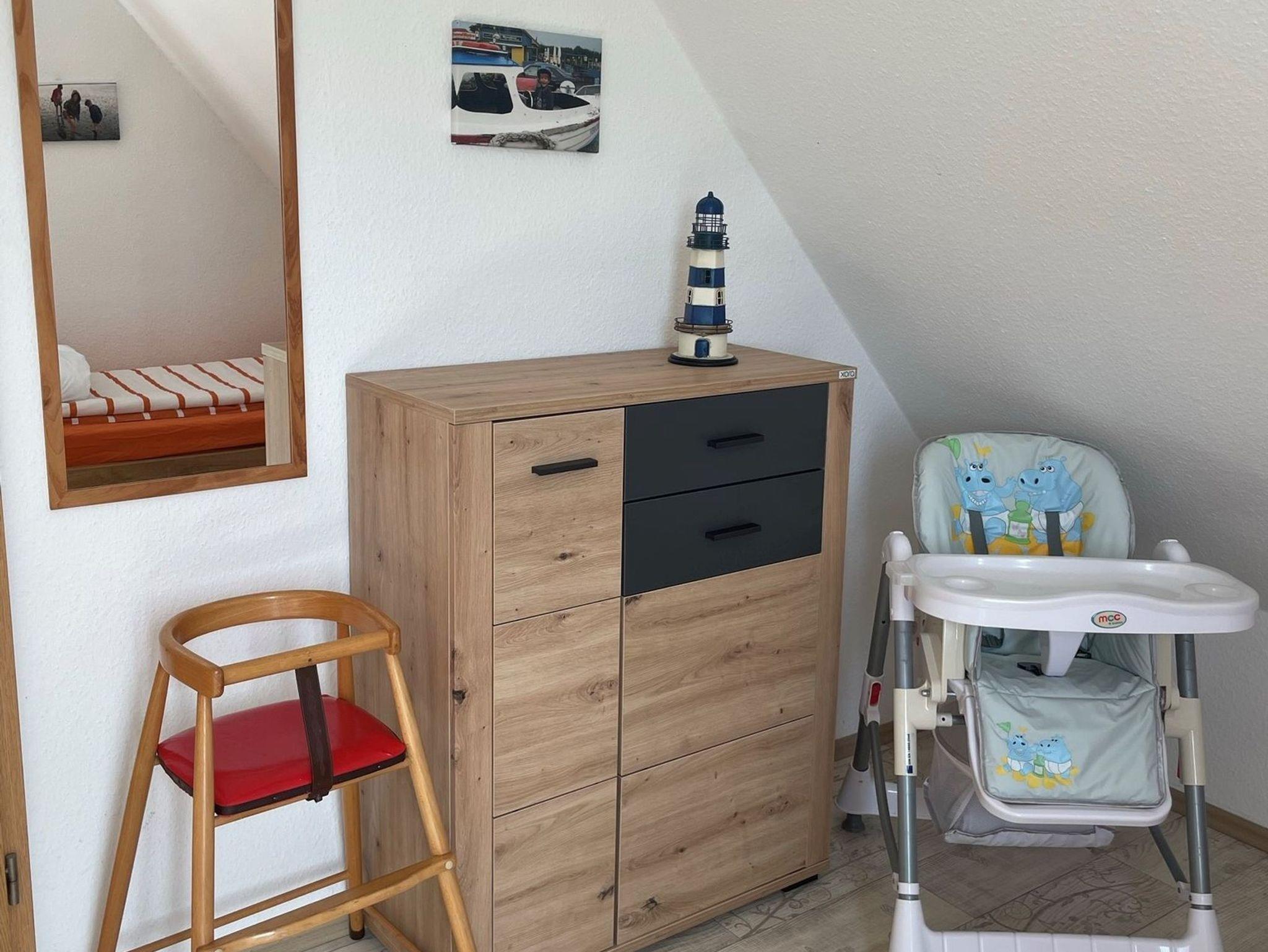 • 1 Schlafraum mit 1 Bett und Kinderbett und Wickelkommode (1. Stock)
