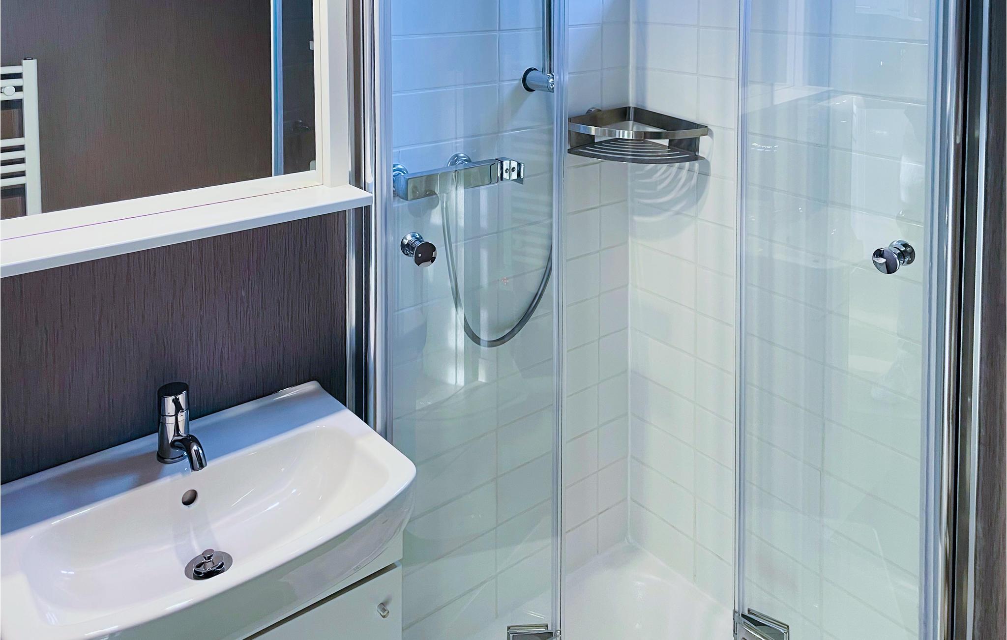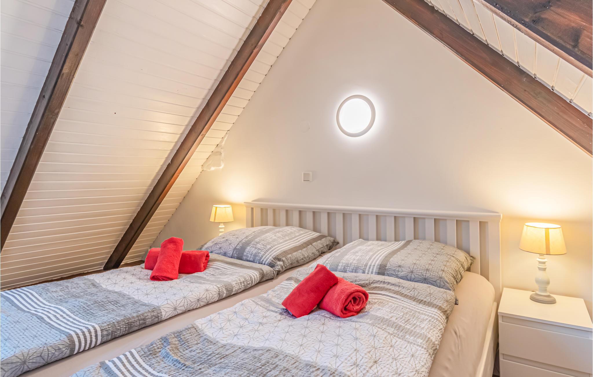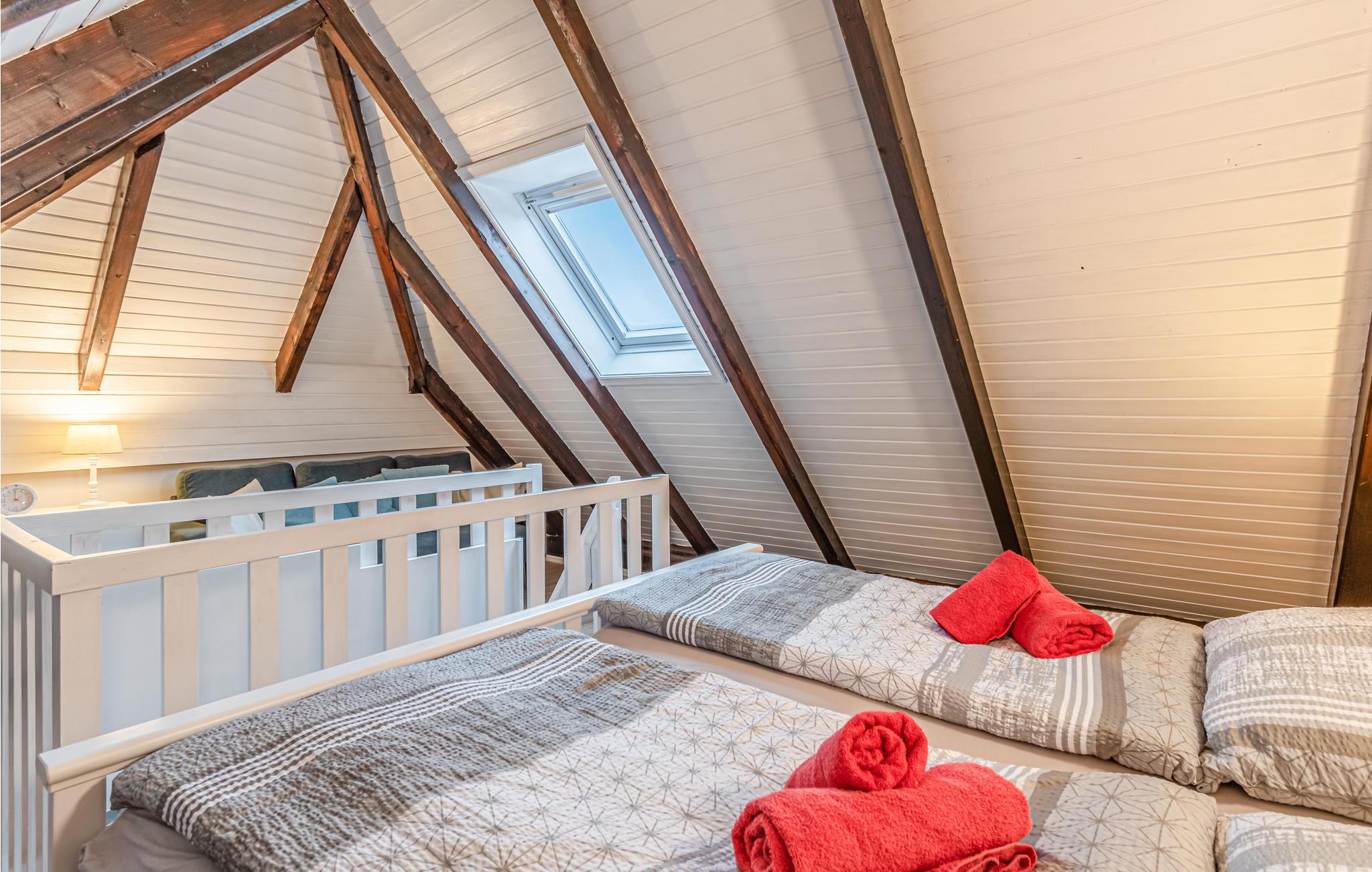 Altanen er overdækket, så I kan bruge den selv i dårligt vejr. Soveværelset nedenunder har en enkeltseng, som kan udvides til to senge ved at trække ud. I rummet er der et læsehjørne med en behagelig lænestol. Det øverste soveværelse har en dobbeltseng, og der er også et læseområde med en behagelig sofa. Begge soveværelser har mørklægningsgardiner.