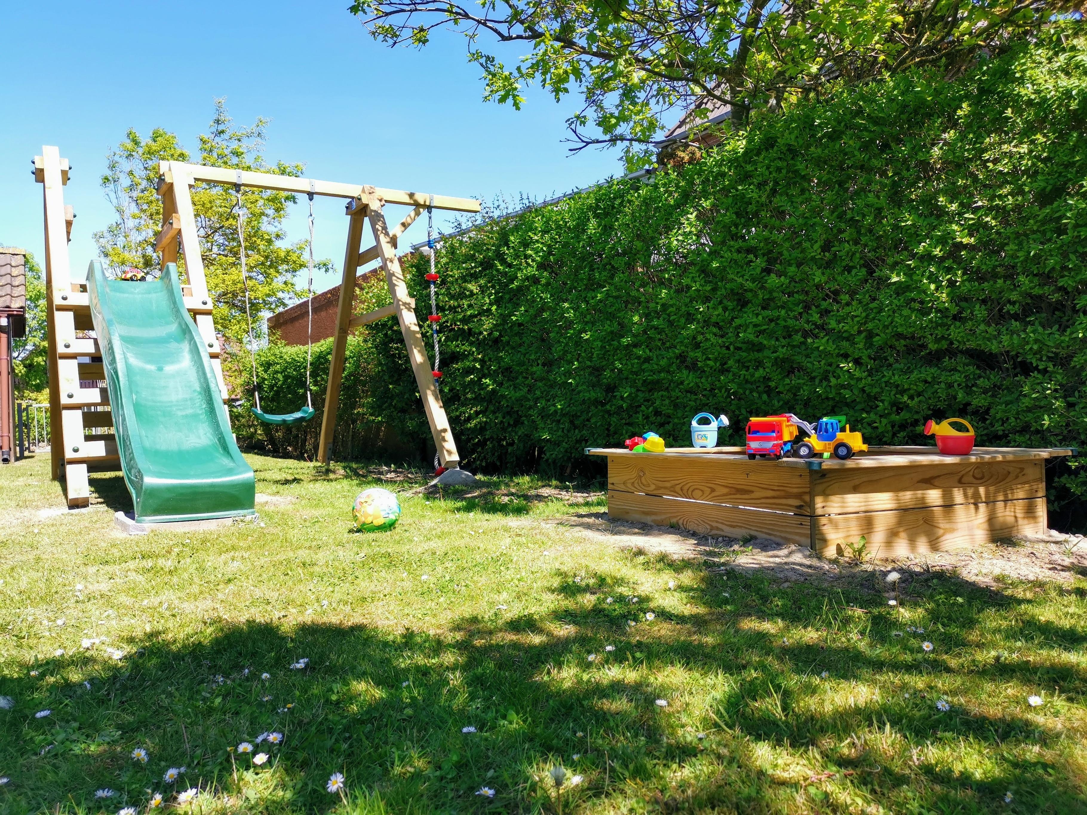 Im Garten stehen Spielgeräte bereit.