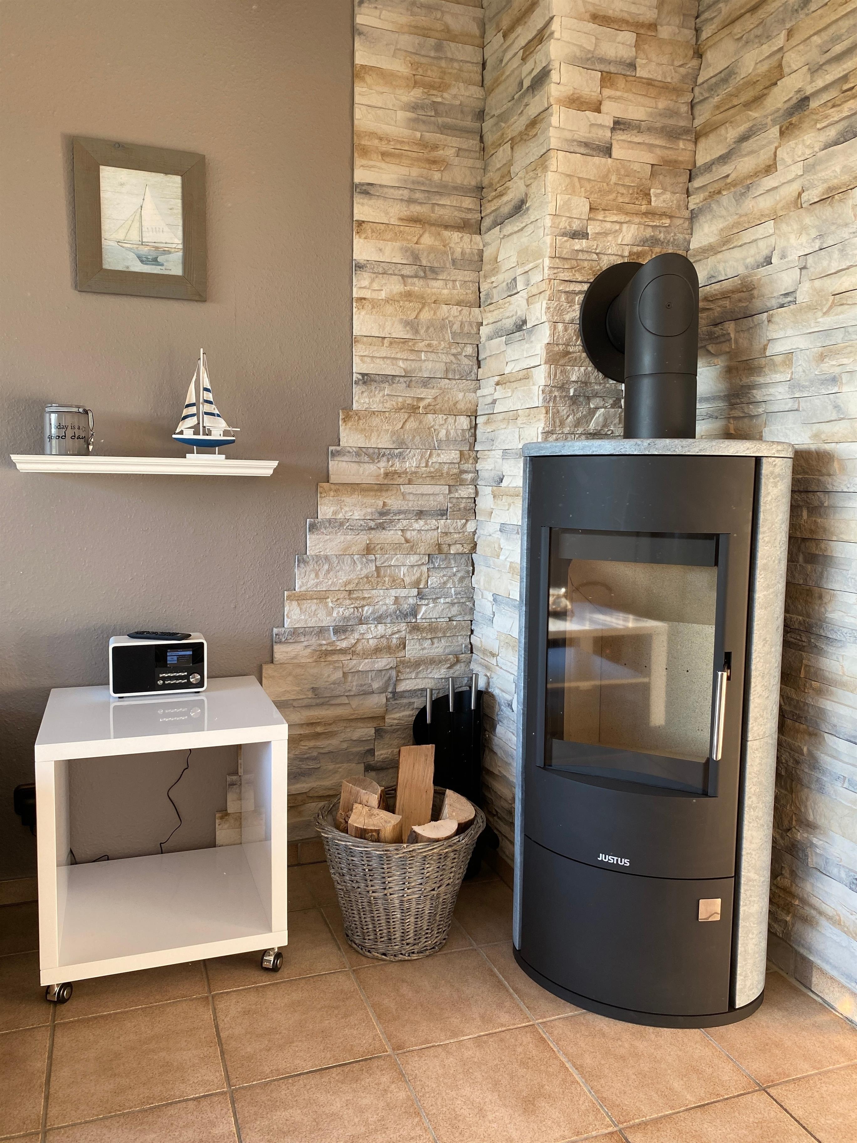 Im Wohnbereich steht ein Kaminofen zur Verfügung, den Sie durch mitgebrachtes Brennholz oder Holzbriketts (auch bei REWE erhältlich) betreiben können.