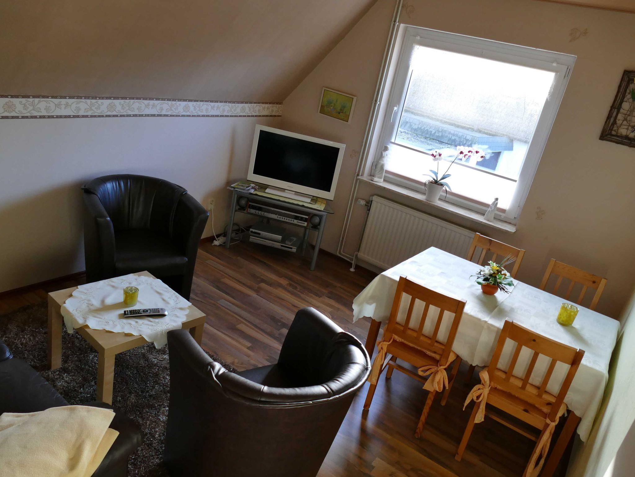 Ferienwohnung für 4 Person; Vollausstattung , Spielmöglichkeit für Kinder im Garten, 2 Schlafräume, Küche, Wohnzimmer mit Essecke, Duschbad. Reisebett ist vorhanden.