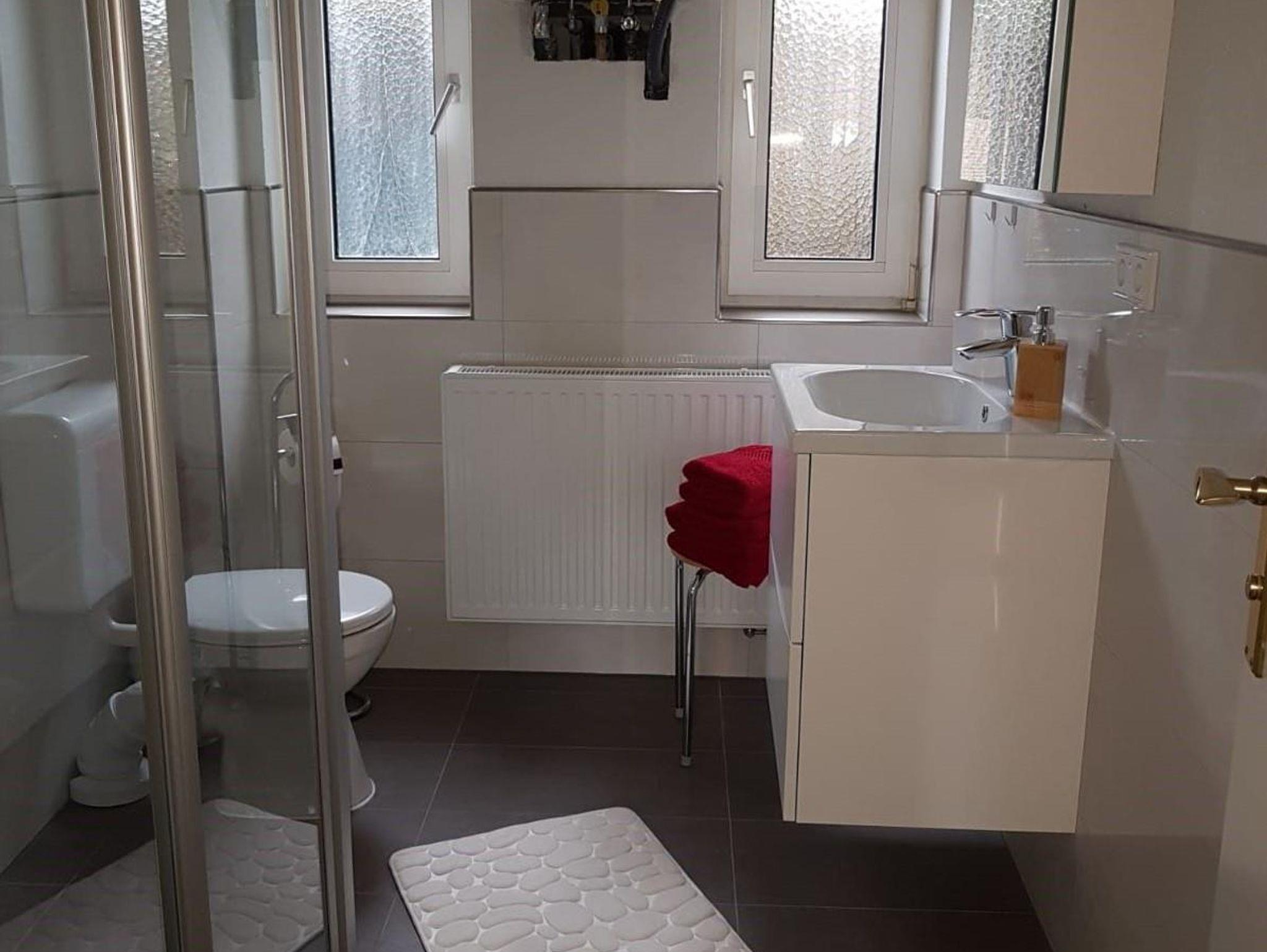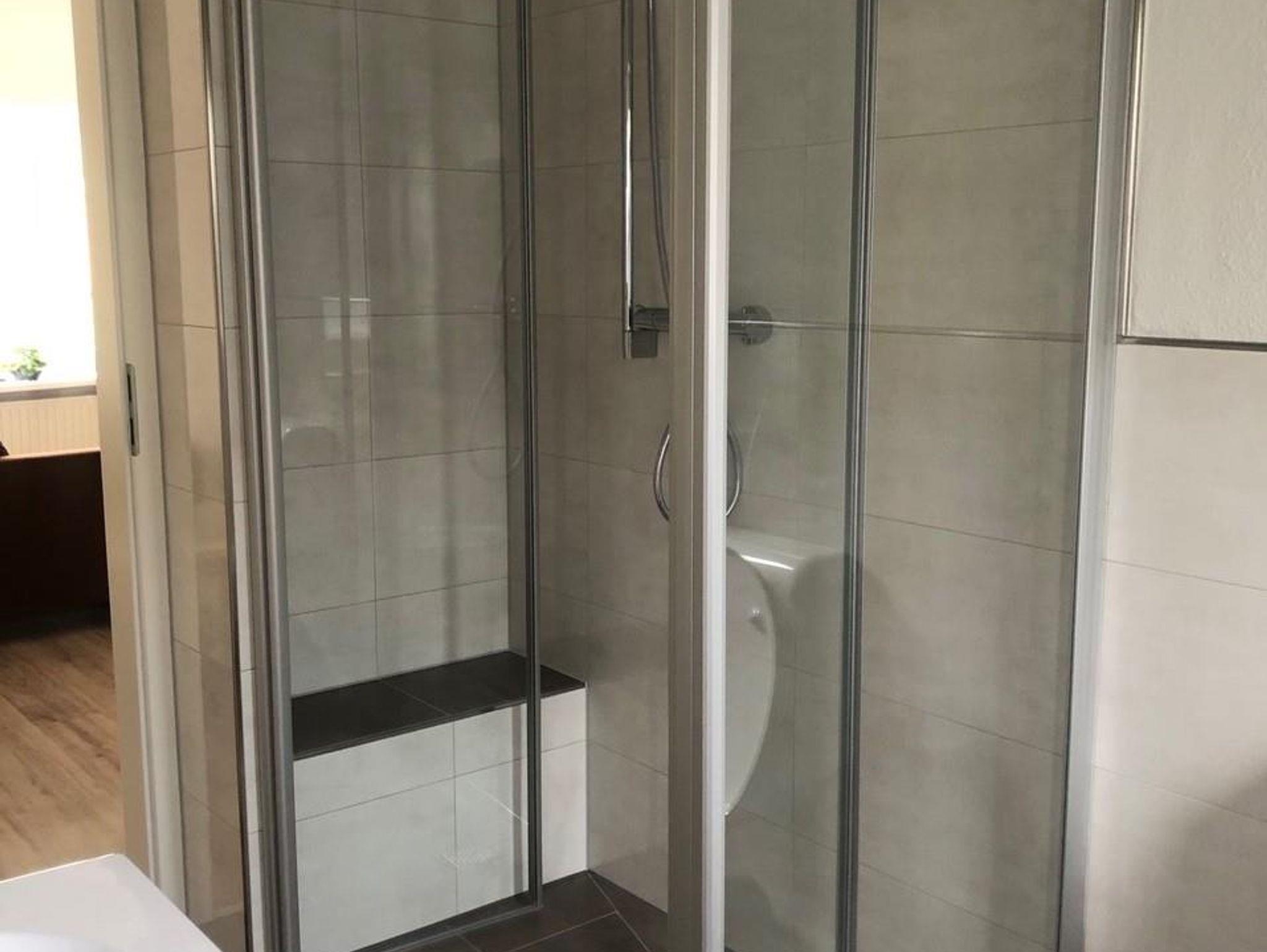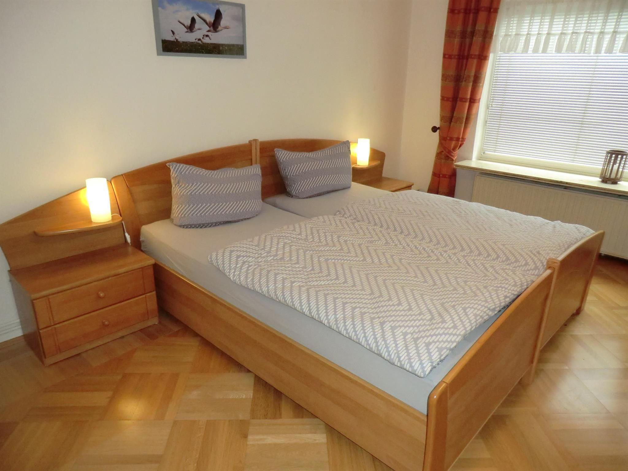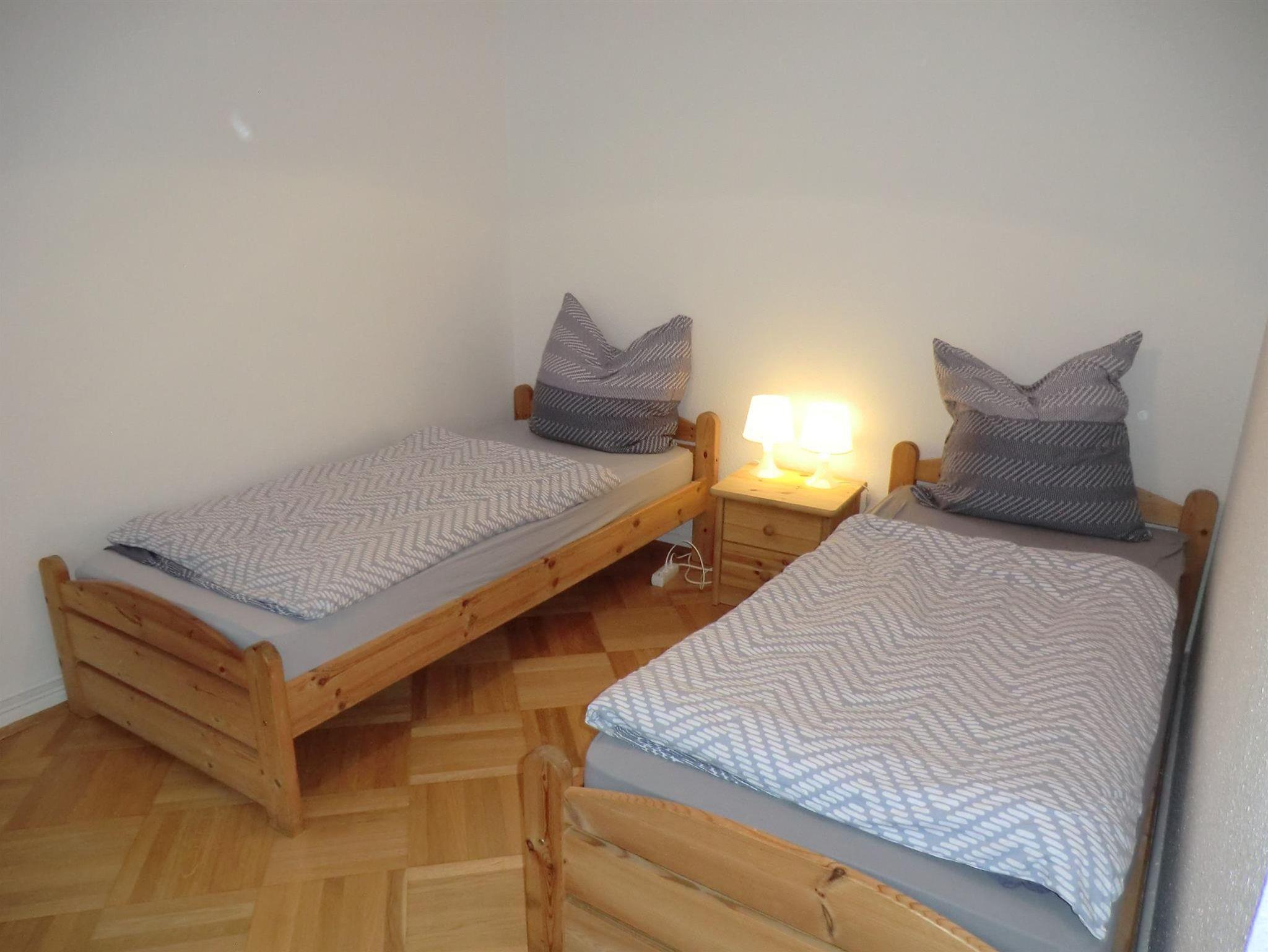 Die Ferienwohnung hat zwei großzügige Schlafzimmer und ein großes Wohnzimmer. Das eine Schlafzimmer ist mit einem Doppelbett und das zweite Schlafzimmer ist mit zwei Einzelbetten und einem Fernseher ausgestattet. Die vollausgestattete Küche liegt auf der Rückseite des Hauses, mit einer kleinen Terrasse davor. Im Badezimmer befinden sich eine ebenderdige Dusche.