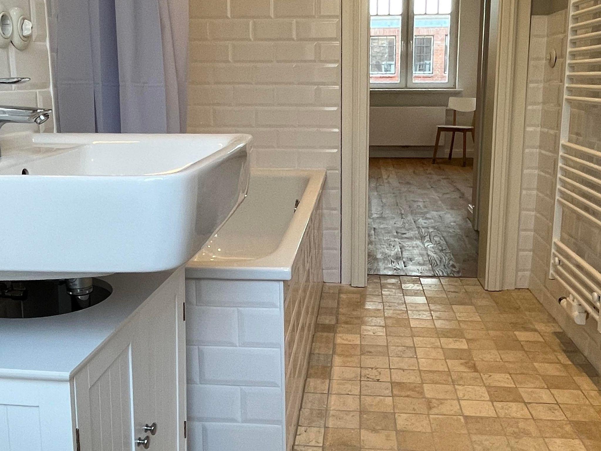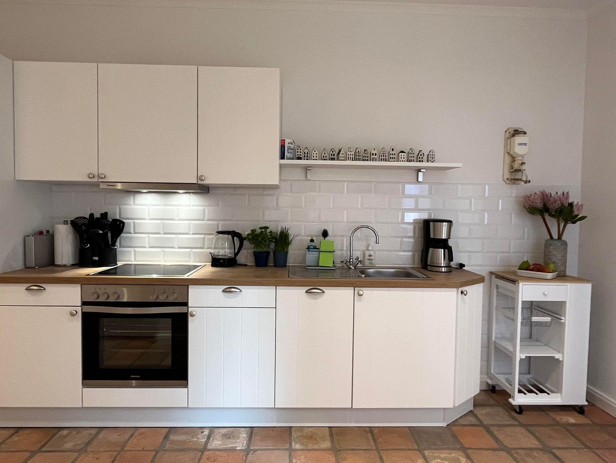 Der Küchenbereich, der sich offen im Loft befindet hat eine Spülmaschine, Kühlschrank mit Eisfach und eine große Ausstattung von allem was das Herz begehrt, wenn man einen längeren Urlaub plant und gerne kocht. Es gibt ein Badezimmer mit Fenster zum Innenhof mit ebenerdiger Dusche, WC, Waschbecken und Handtuchwämer.