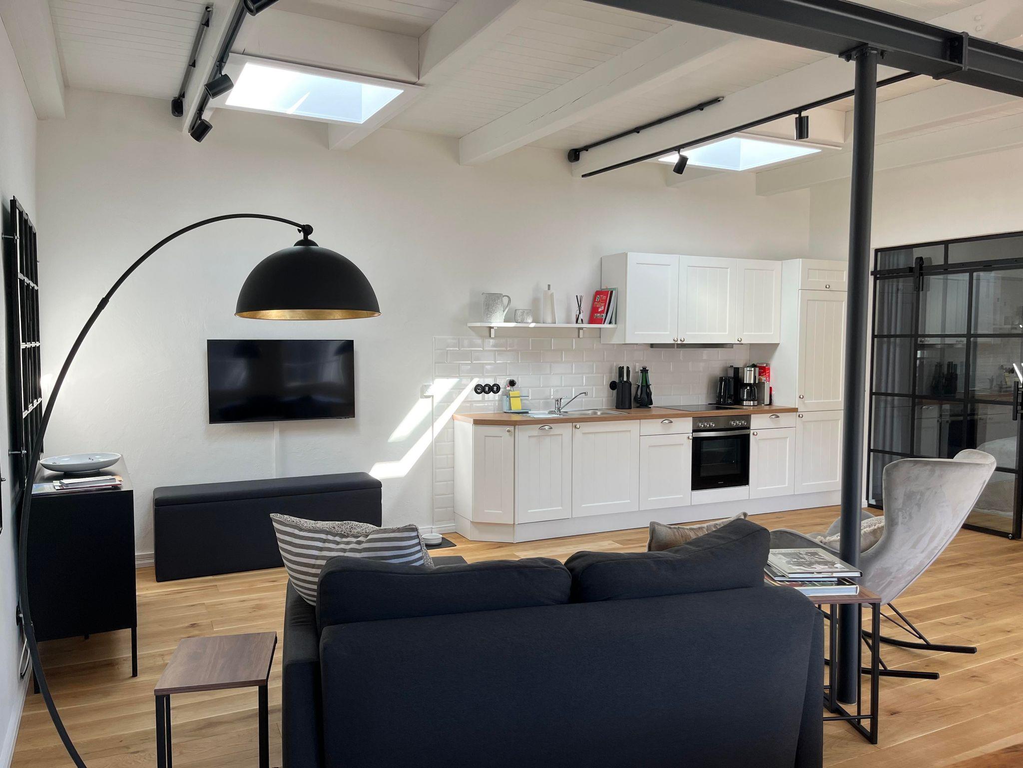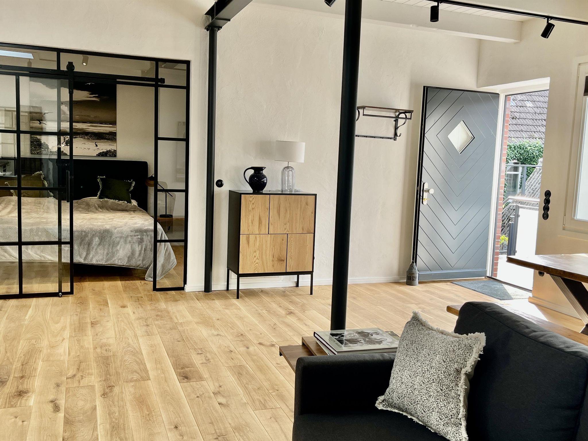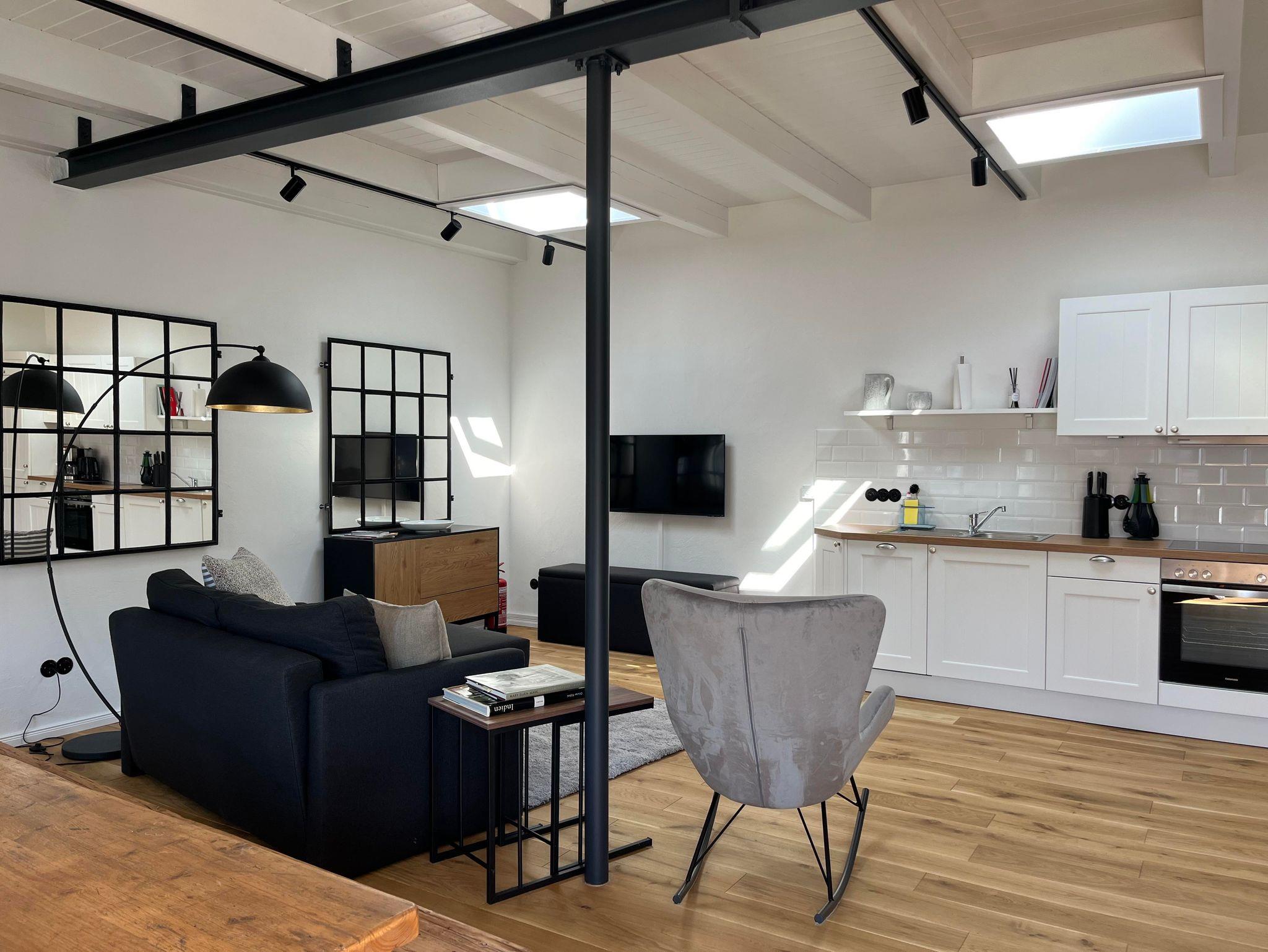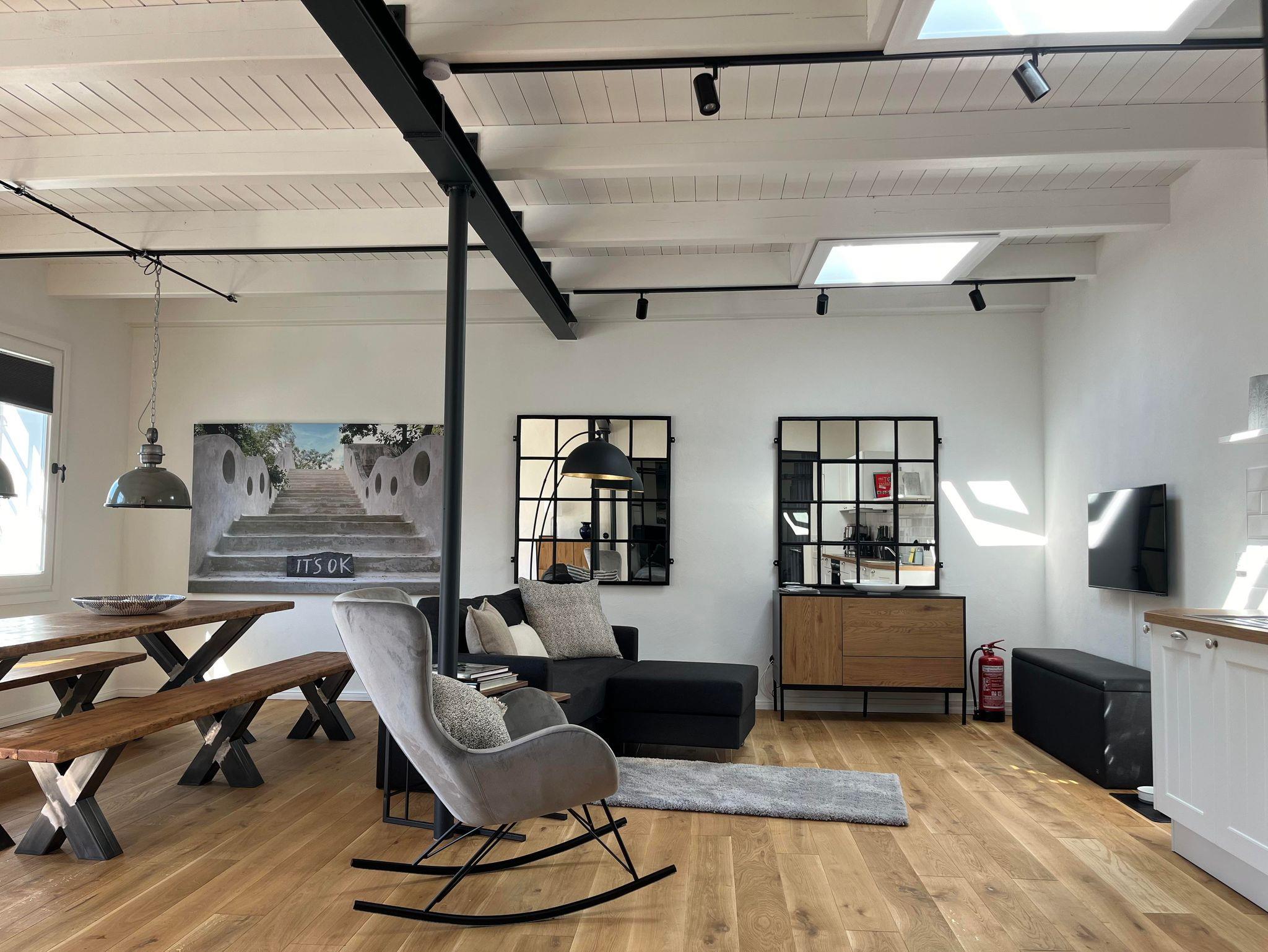 Das Loft verfügt über ein sehr schönes Schlafzimmer, daß vom Ess- und Wohn durch eine Glas/Stahlwand getrennt ist und abgedunkelt werden kann. Im Wohnbereich befindet sich ein Schlafsofa, auf dem ein bis zwei weitere Personen schlafen können. Am großzügigen Esstisch kann man arbeiten oder Mahlzeiten einnehmen.