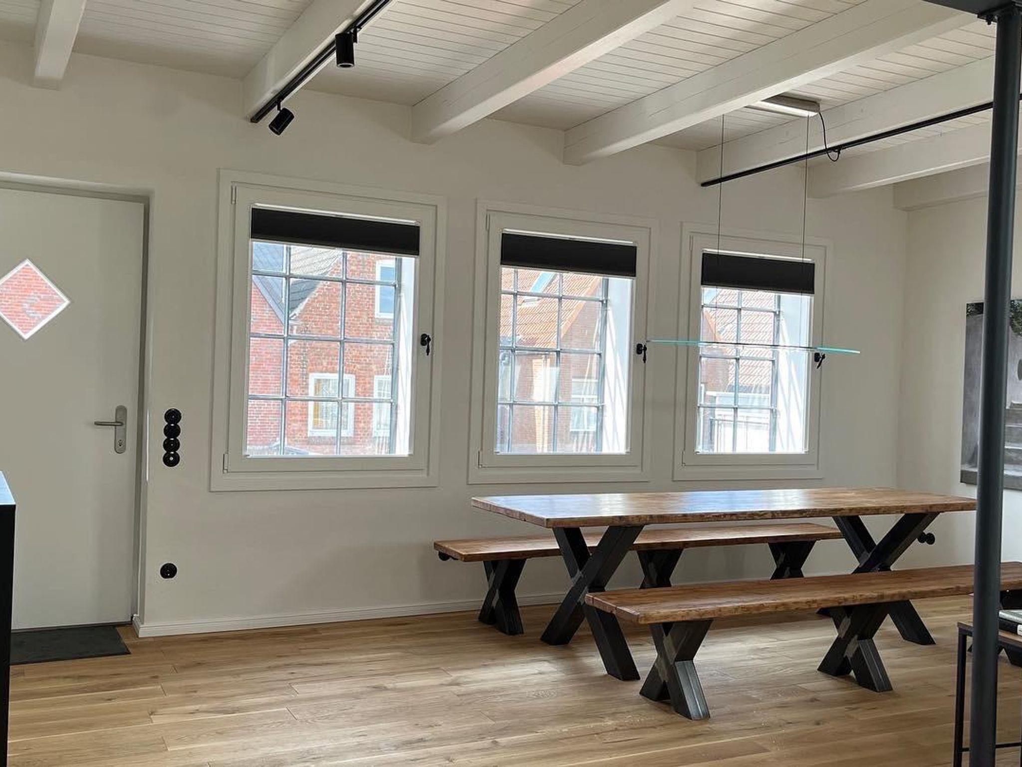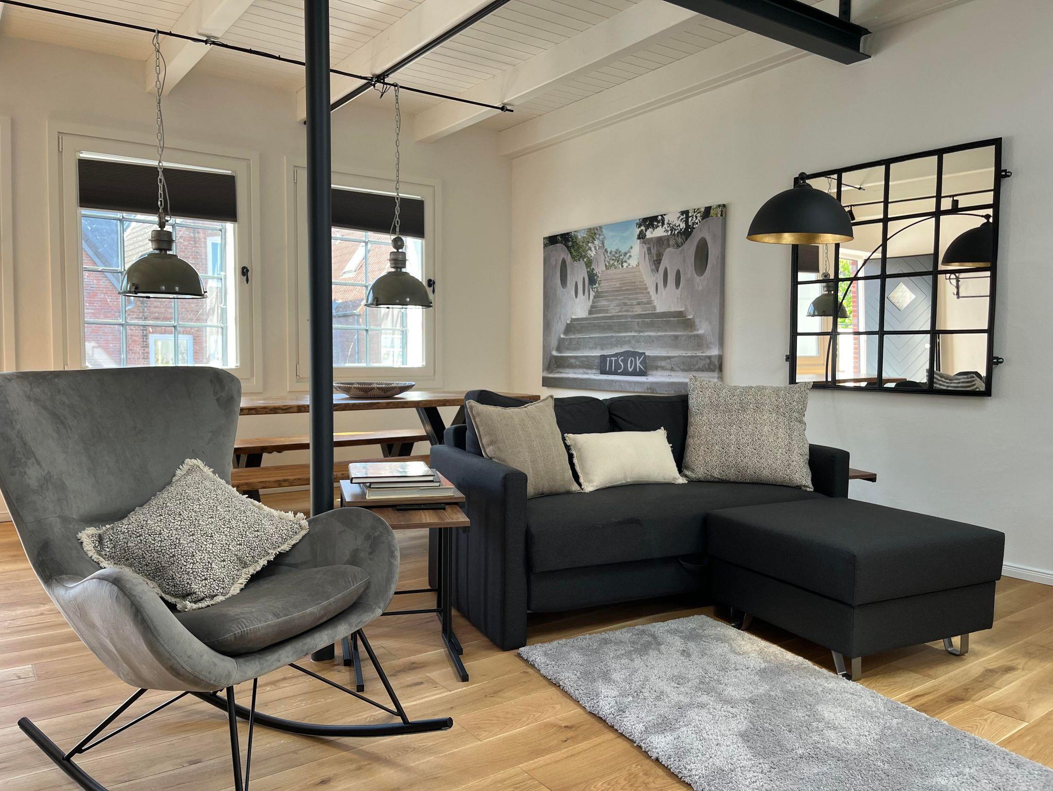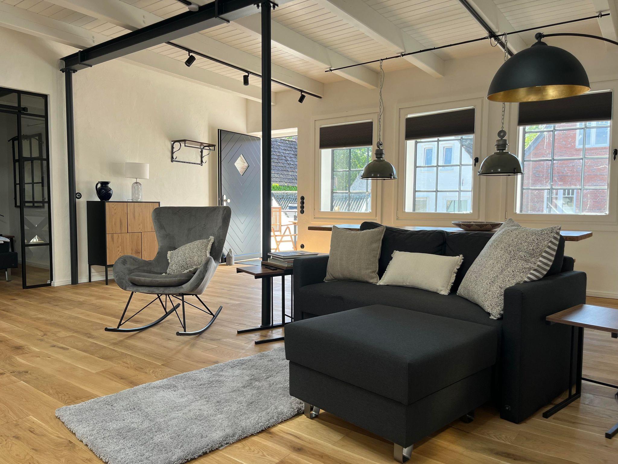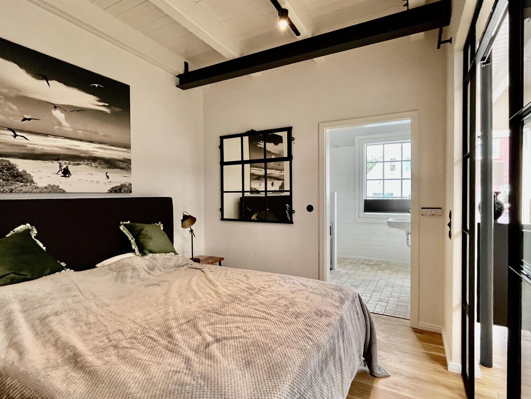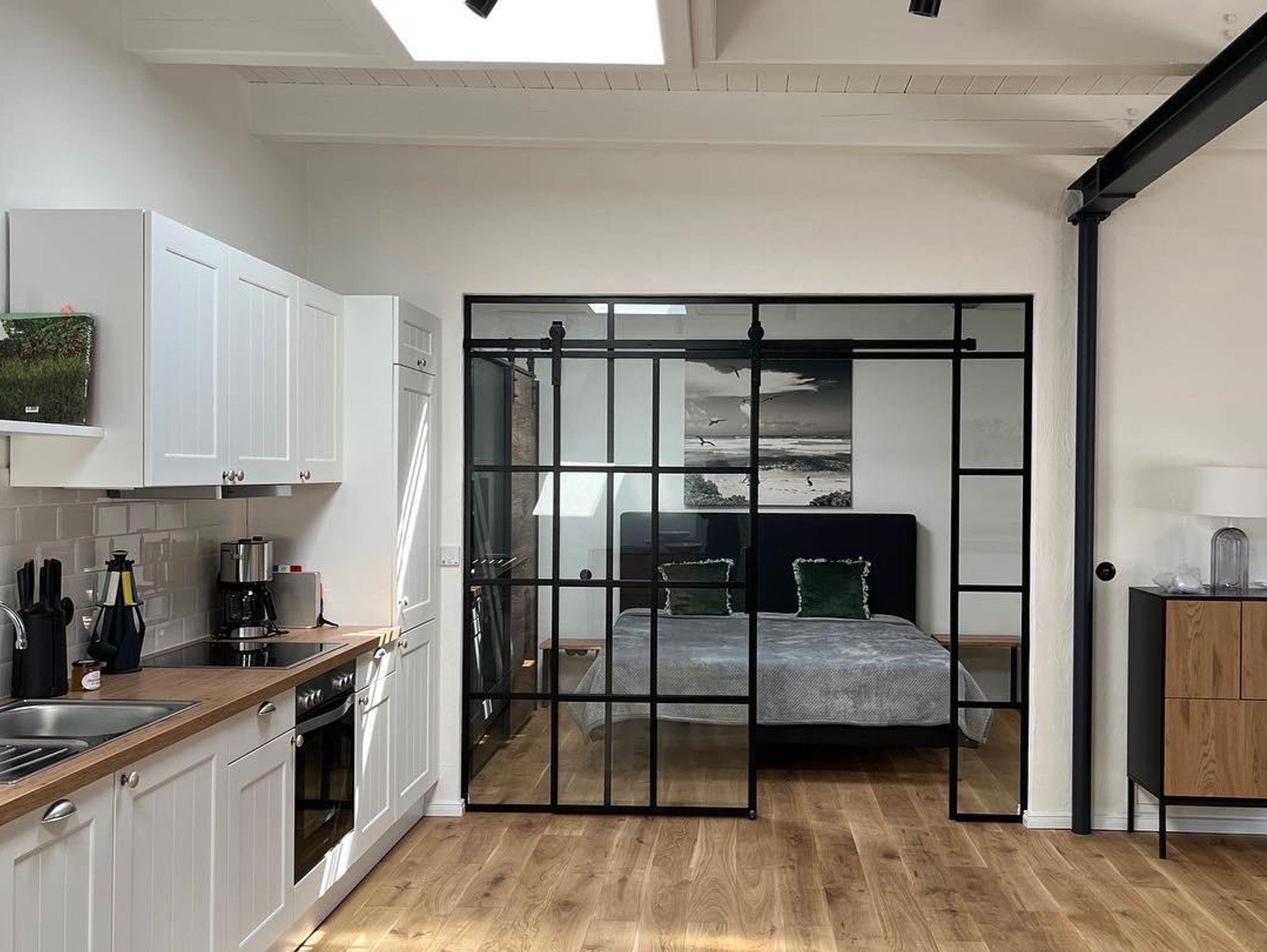 Das Loft verfügt über ein sehr schönes Schlafzimmer, daß vom Ess- und Wohn durch eine Glas/Stahlwand getrennt ist und abgedunkelt werden kann. Im Wohnbereich befindet sich ein Schlafsofa, auf dem ein bis zwei weitere Personen schlafen können. Am großzügigen Esstisch kann man arbeiten oder Mahlzeiten einnehmen.