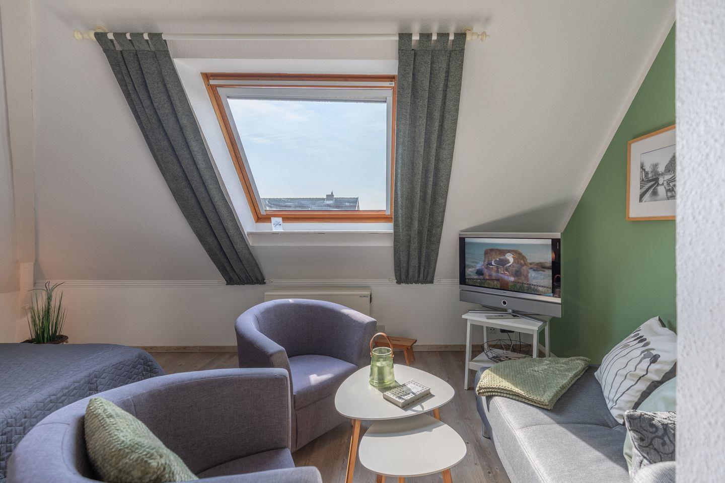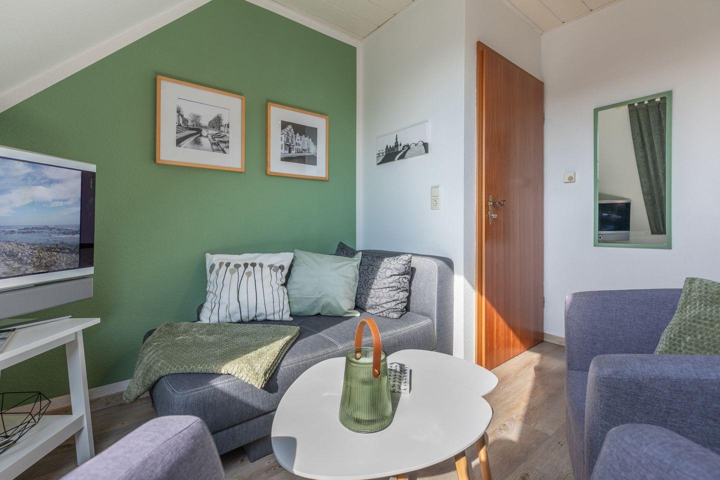 Die ca. 50 Quadratmeter große Ferienwohnung „Grachtennest“ befindet sich im ersten Obergeschoss eines Wohnhauses und ist über eine innenliegende Treppe erreichbar. Die Wohnung verfügt über zwei separate Schlafzimmer: Das größere Zimmer ist mit einem Doppelbett (160 × 200 cm) und einer Sitzecke mit Flachbildfernseher ausgestattet. Im zweiten Schlafzimmer befindet sich ein Einzelbett (80 × 200 cm). Die Küche ist vollständig eingerichtet und bietet unter anderem eine Kaffeemaschine, einen Kühlschrank, ein Kochfeld sowie Koch- und Essgeschirr – ideal für die Selbstverpflegung im Urlaub. Ein angrenzender Essbereich lädt zum gemeinsamen Essen ein. Das hell gestaltete Bad ist funktional ausgestattet und verfügt über eine Dusche, ein WC und ein Waschbecken.