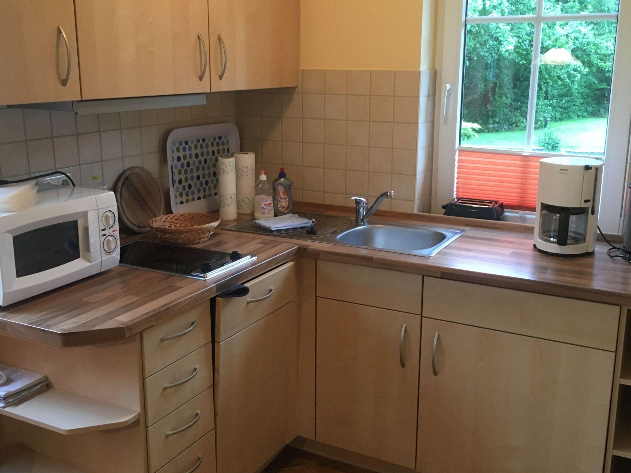 komfortable Küche mit Cerankochfeld, Geschirrspüler, Toaster, Wasserkocher, Kaffeemaschine, sowie Kühlschrank mit Gefrierfach, Heißluftfriteuse