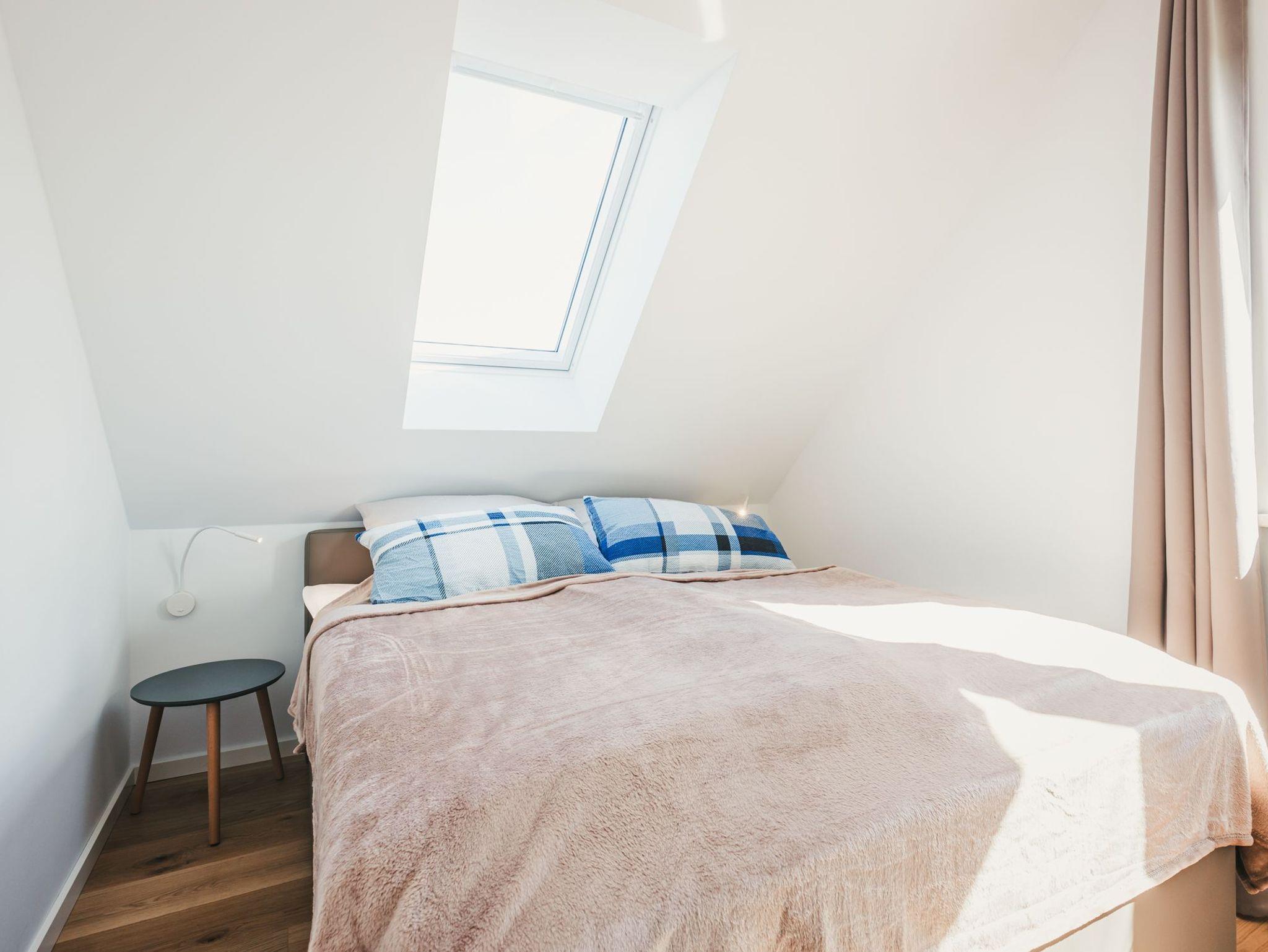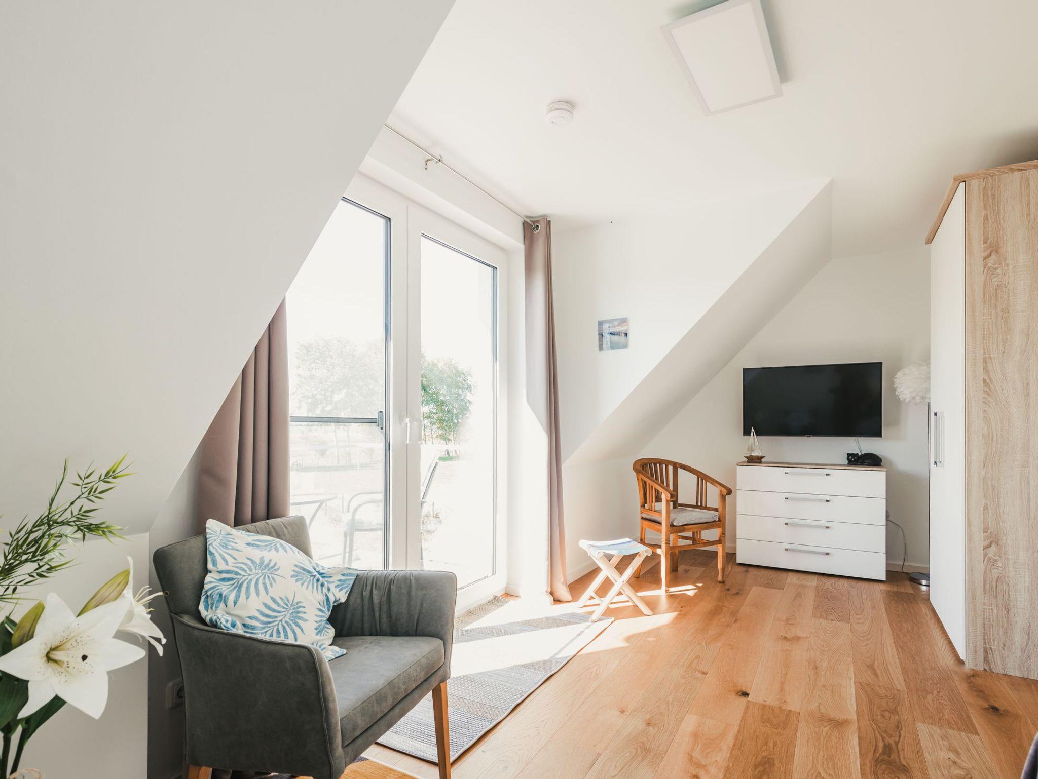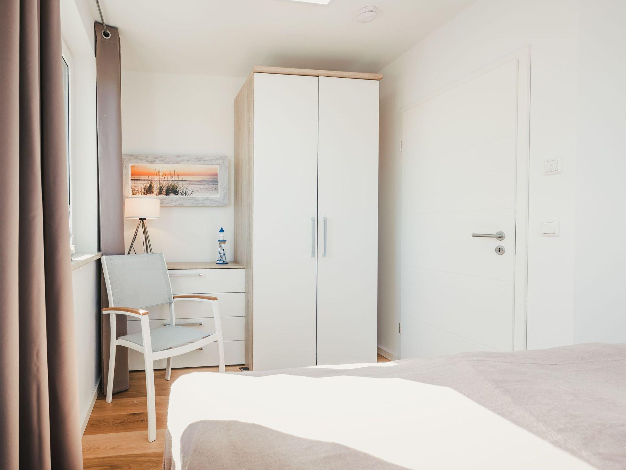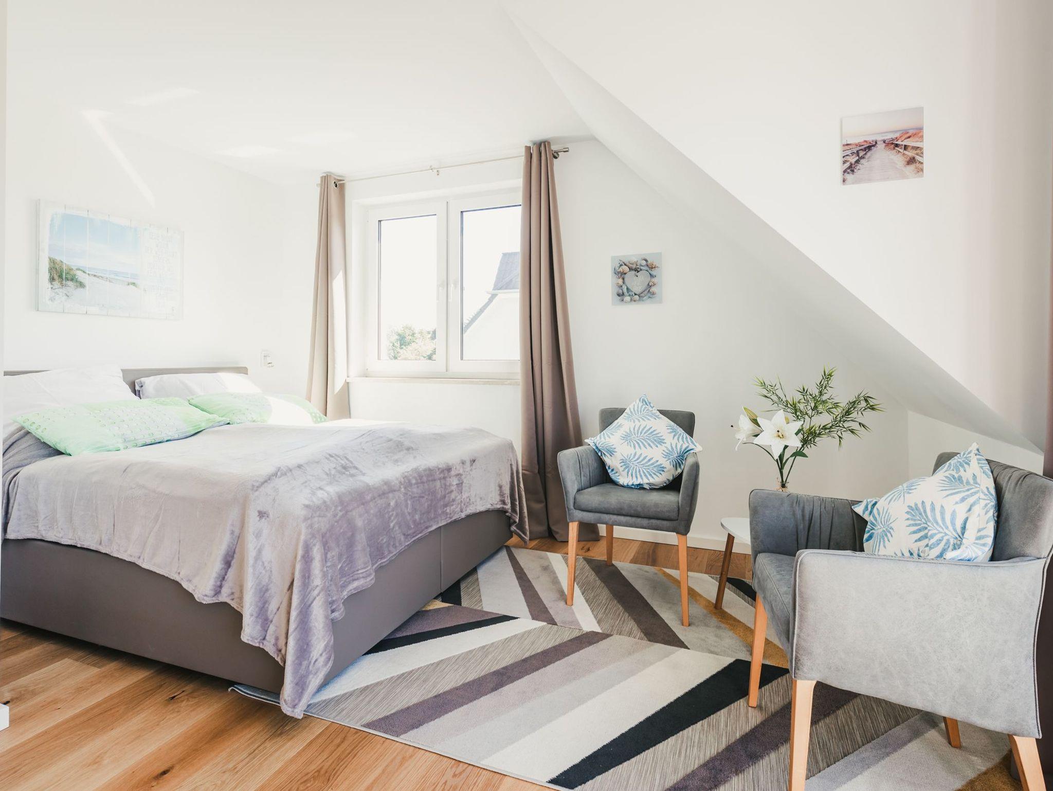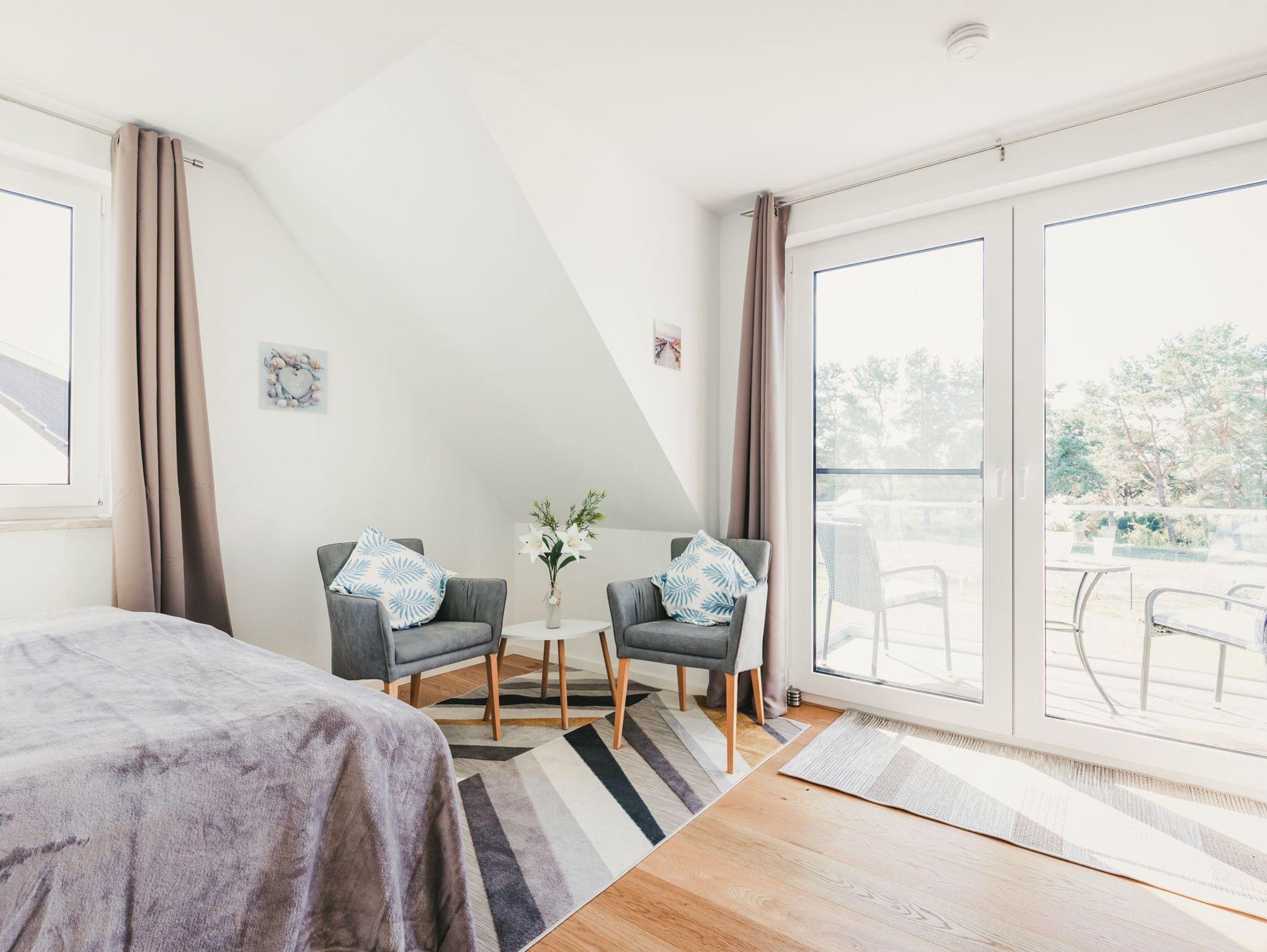 Beide Schlafzimmer verfügen über hochwertige Boxspringbetten, Leselampen, Schränke und Schubladenkommoden. Das kleinere Schlafzimmer hat ein zusätzliches Velux ? Dachfenster, das eine helle und angenehme Atmosphäre vermittelt. Das größere Schlafzimmer ist mit bodentiefen Fenstern ausgestattet und besitzt darüber hinaus zwei gemütliche Sessel, TV und einen Balkon, von dem aus Sie bei einer Tasse Kaffee oder einem Glas Wein den Panoramablick über Bodden, Wald und Wiesen genießen können.