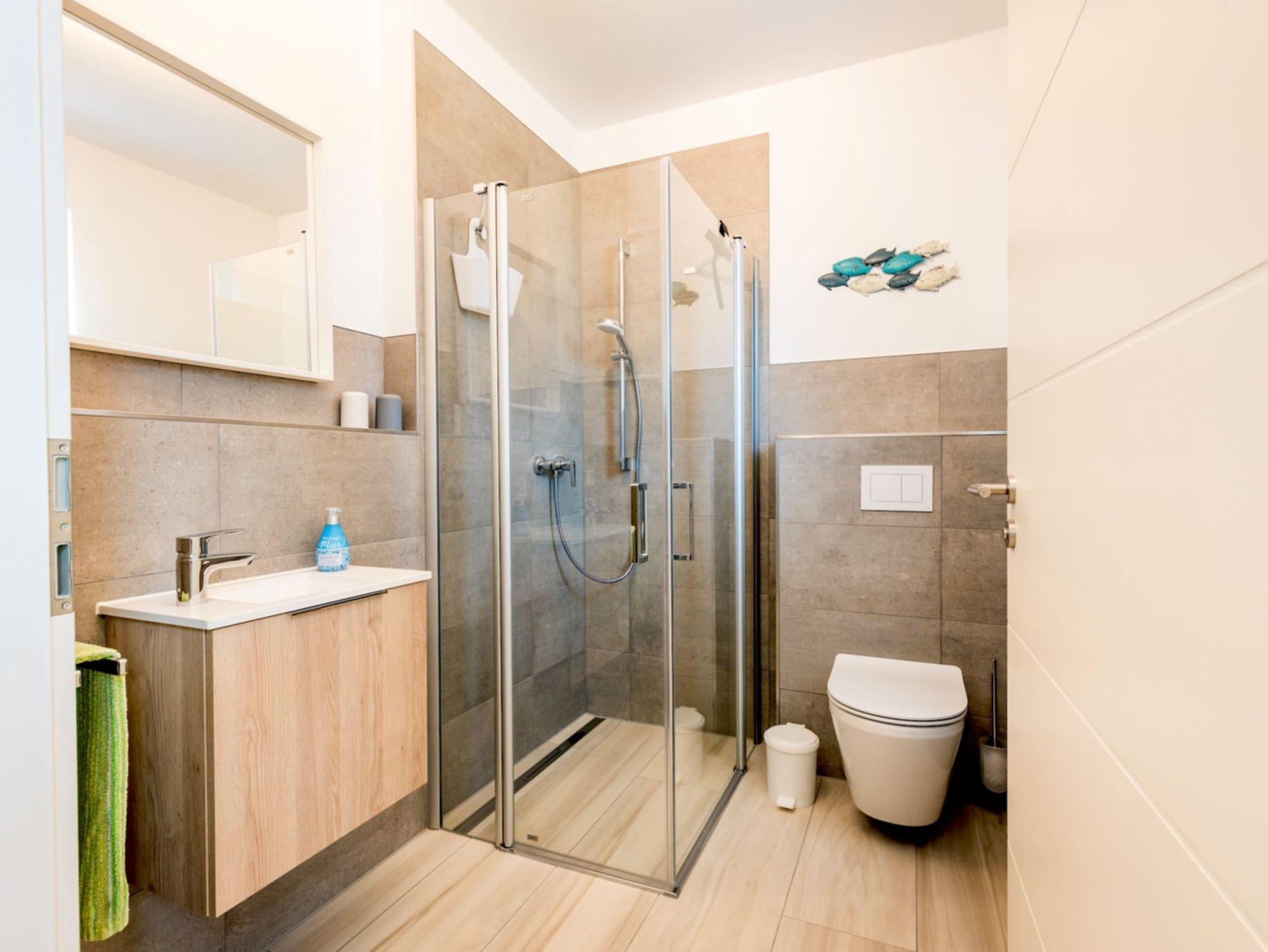Das Obergeschoss des Hauses verfügt über zwei Schlafzimmer. In dem einen befindet sich ein bequemes, hochwertiges Boxspringbett mit angrenzendem begehbaren Kleiderschrank sowie ein Schreibtisch und Smart-TV. Im zweiten sind zwei Einzelbetten mit Einbauschrank und ebenfalls Smart-TV vorhanden. Das großzügige Badezimmer mit Fenster und ebenerdiger Dusche in moderner Beton-Optik runden den hohen Standard der Unterkunft ab.