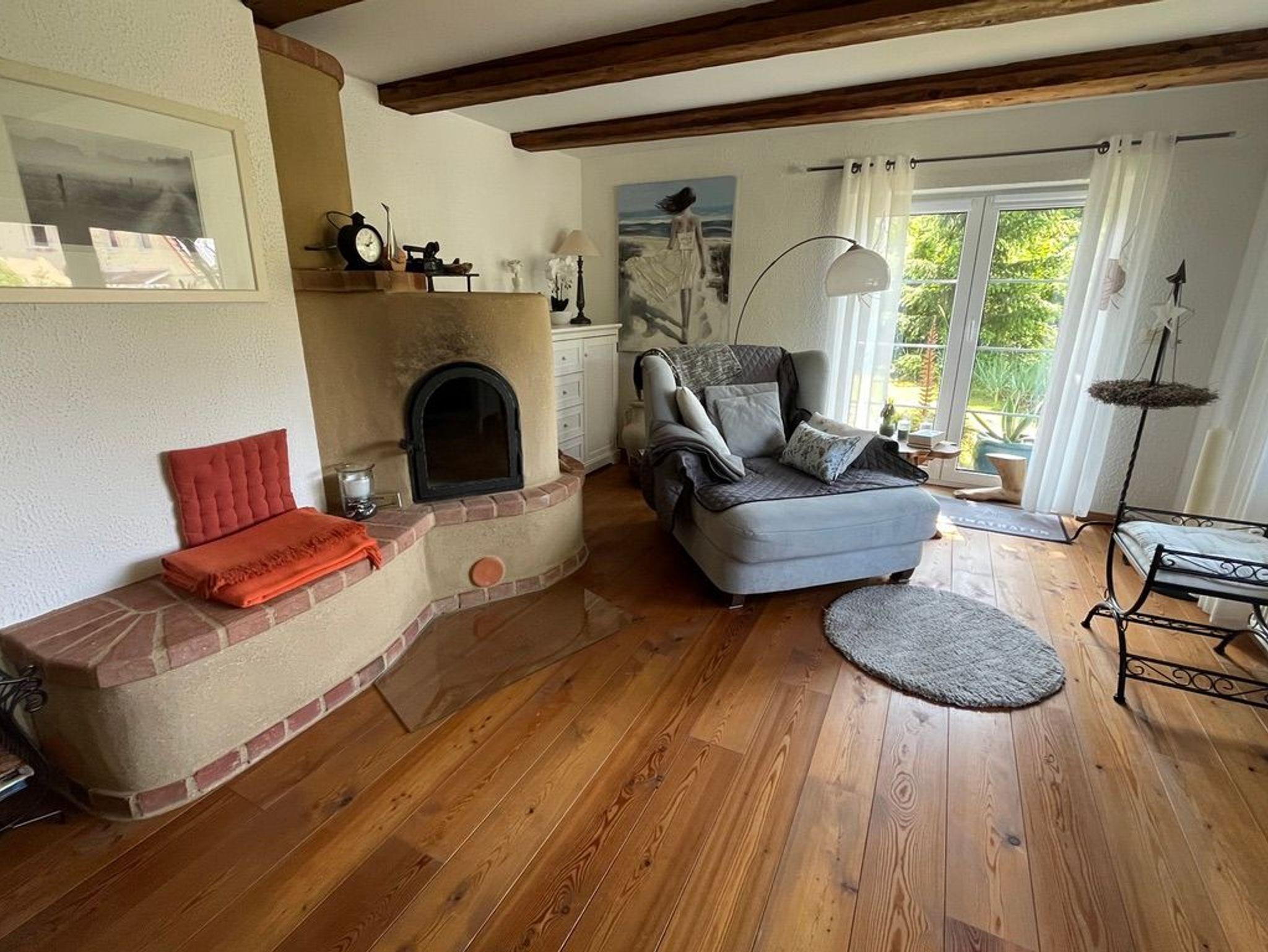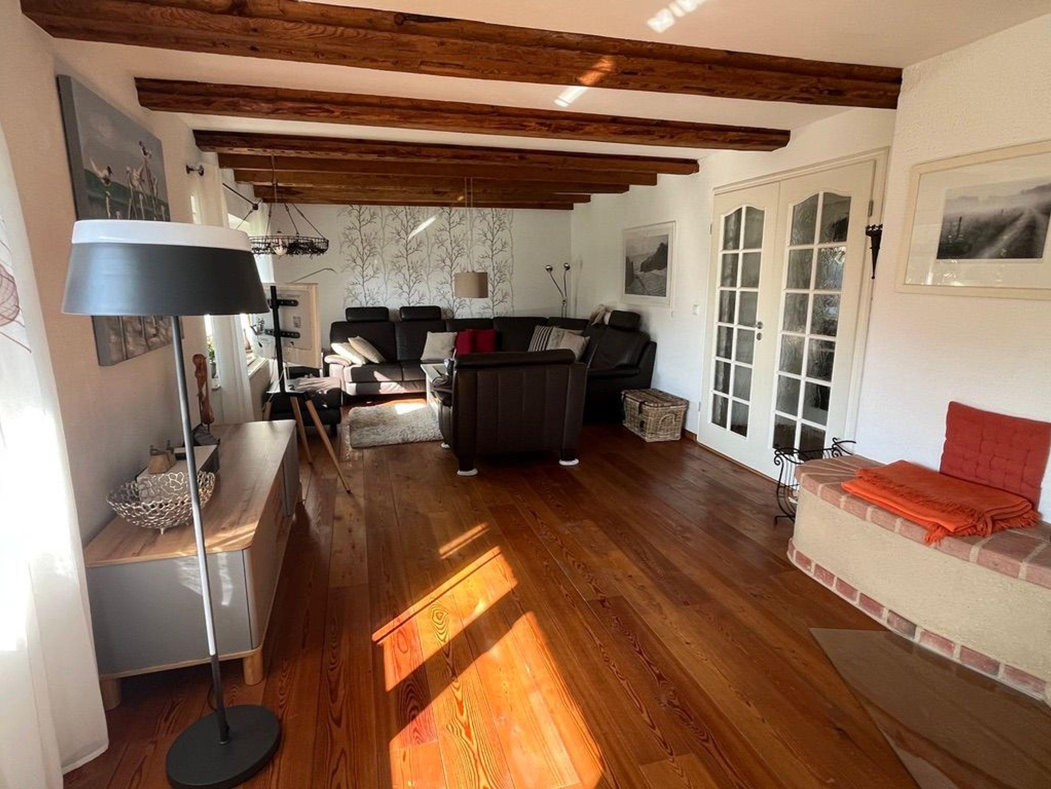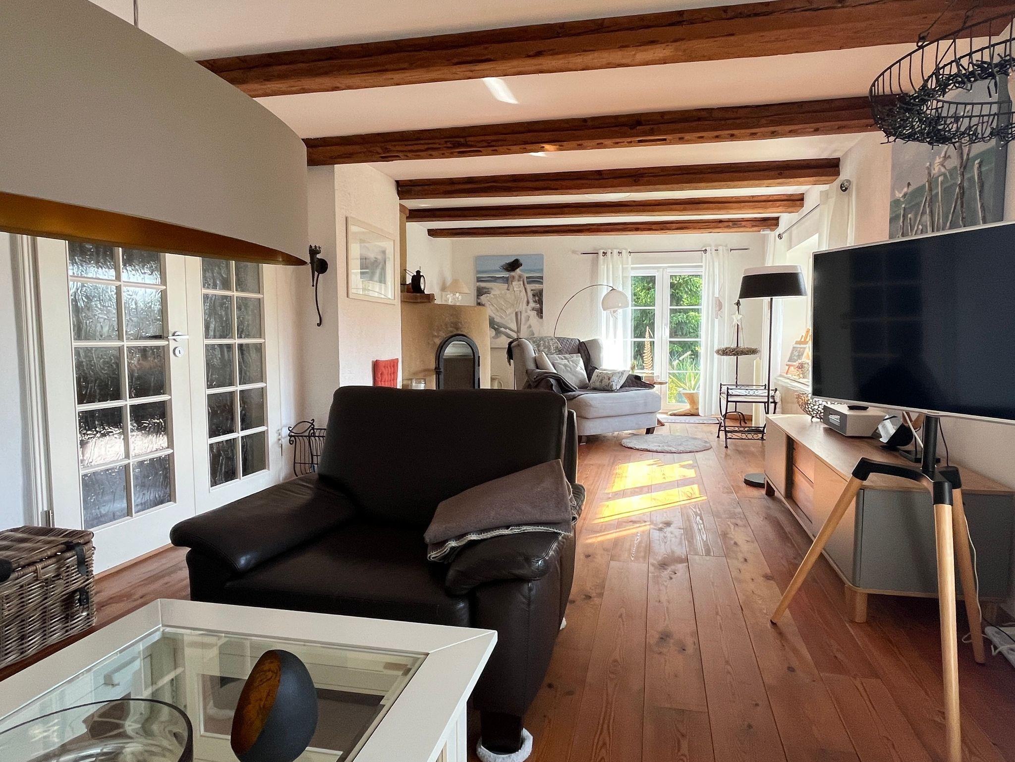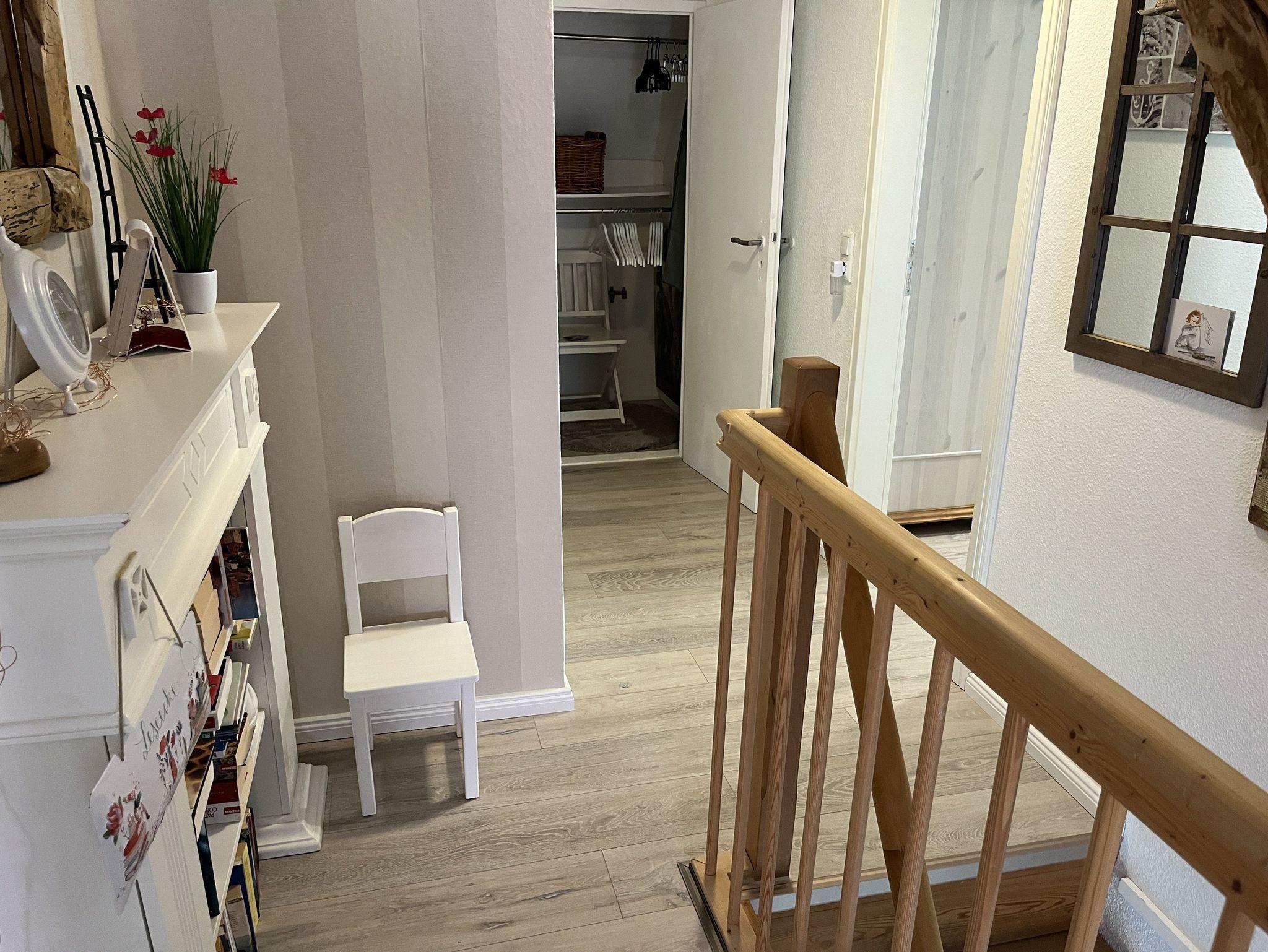 Im Erdgeschoss befindet sich der Wohnbereich mit Kaminofen, die Diele, die Küche und das Bad.