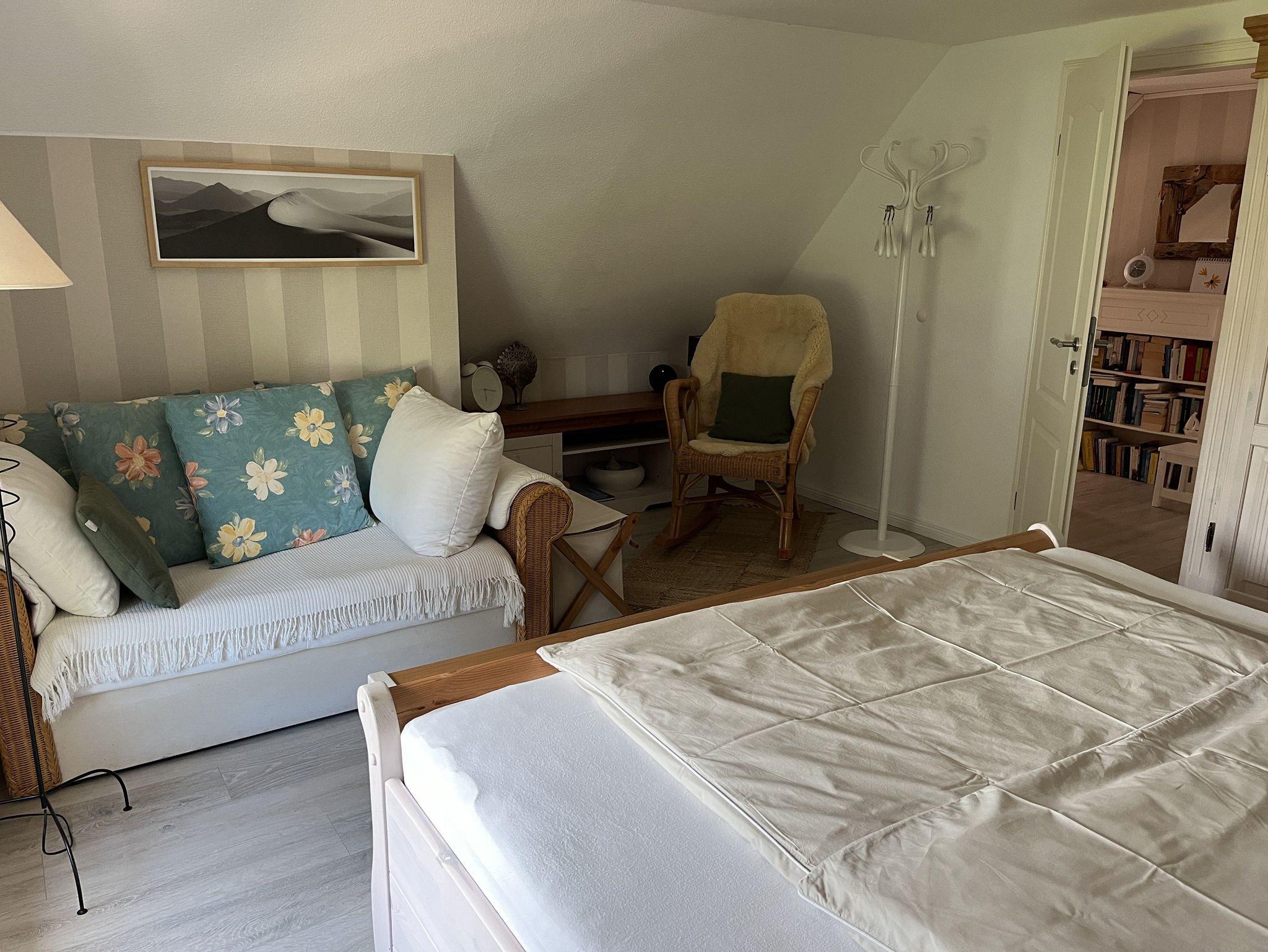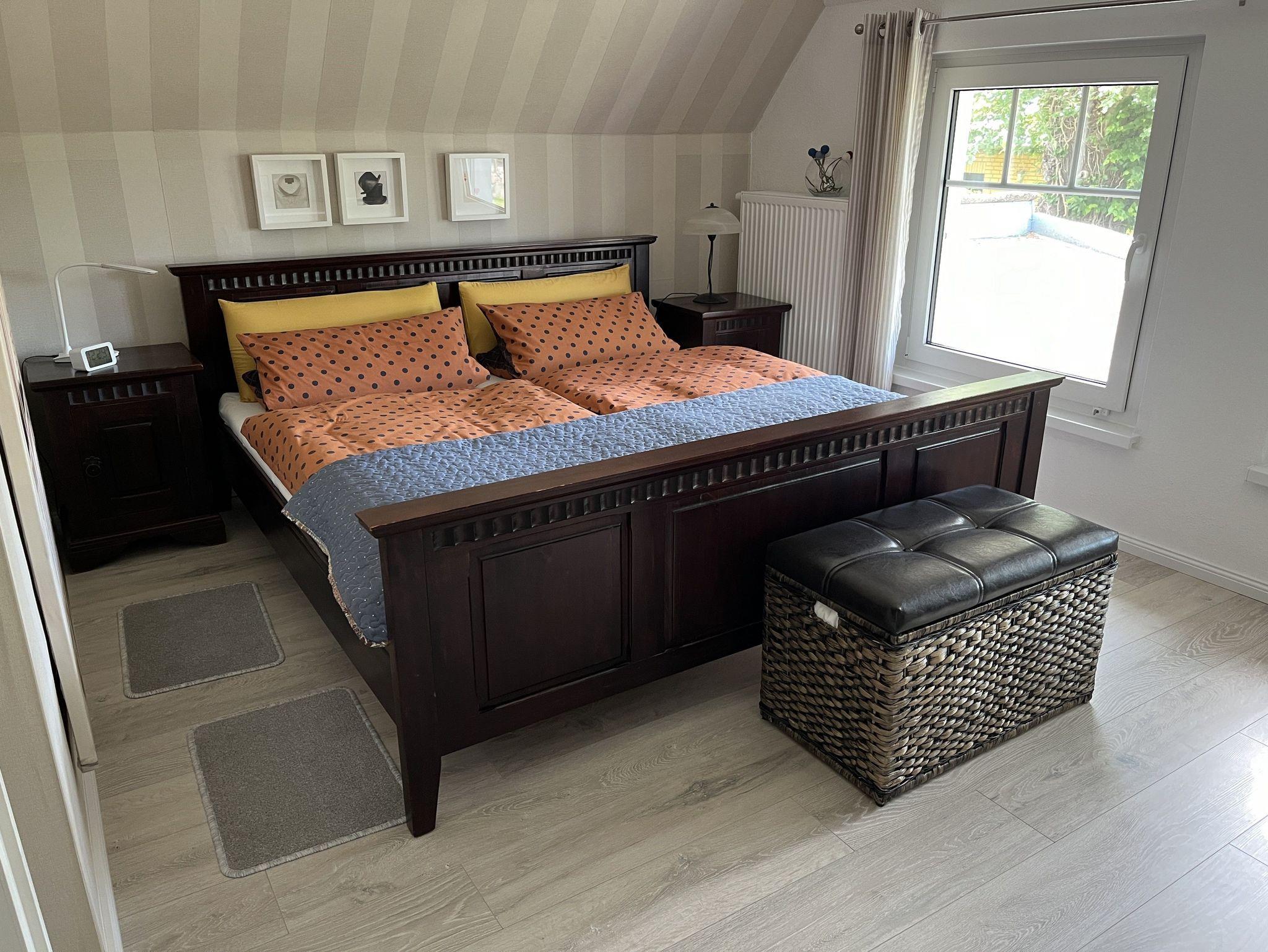 In der oberen Etage befinden sich die 2 Schlafräume mit je einem Doppelbett. Und wenn das einmal nicht reicht, kann in einem Raum eine Aufbettung erfolgen.