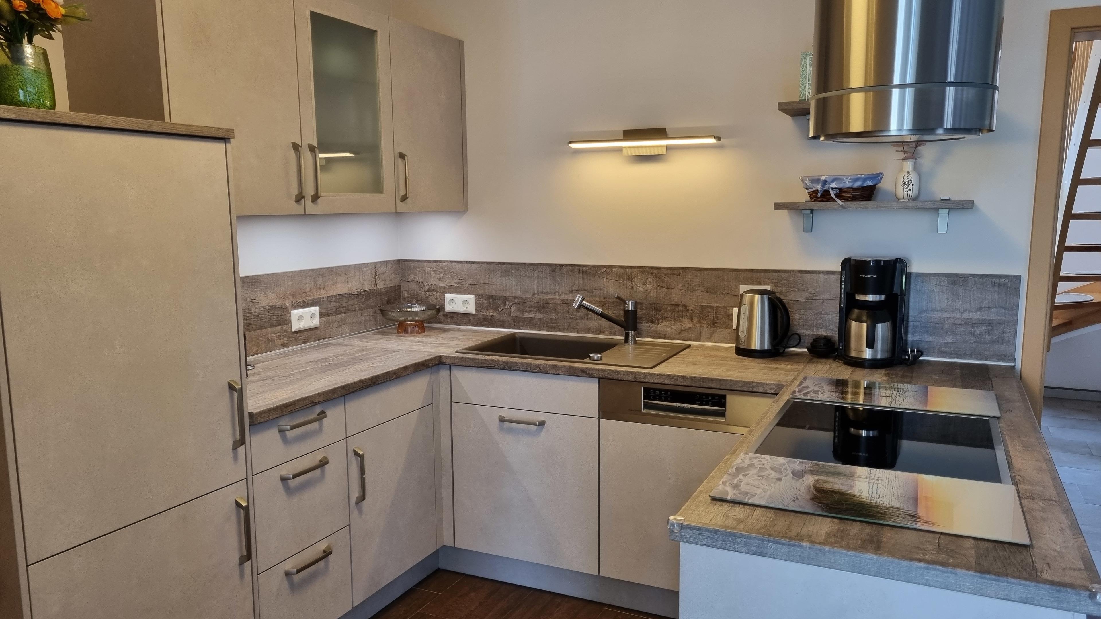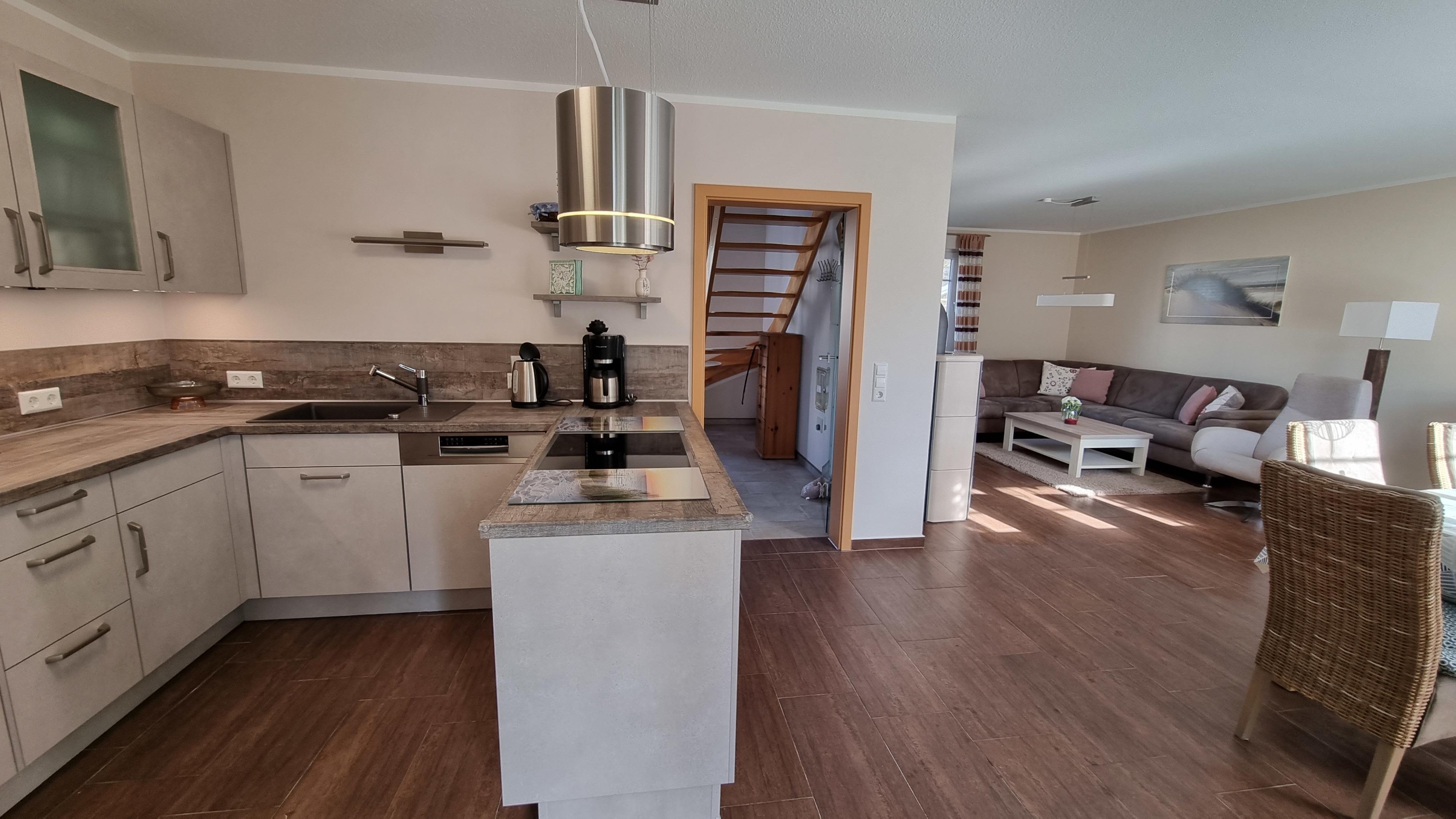 Die offene Küche mit Geschirrspüler und angrenzendem Essbereich ist komplett ausgestattet.