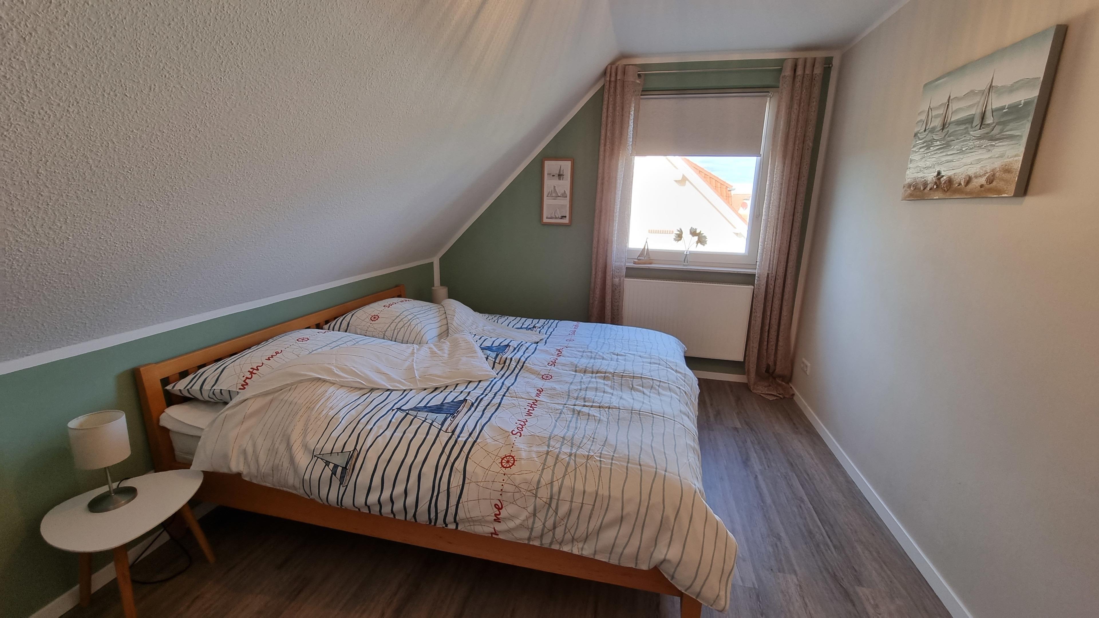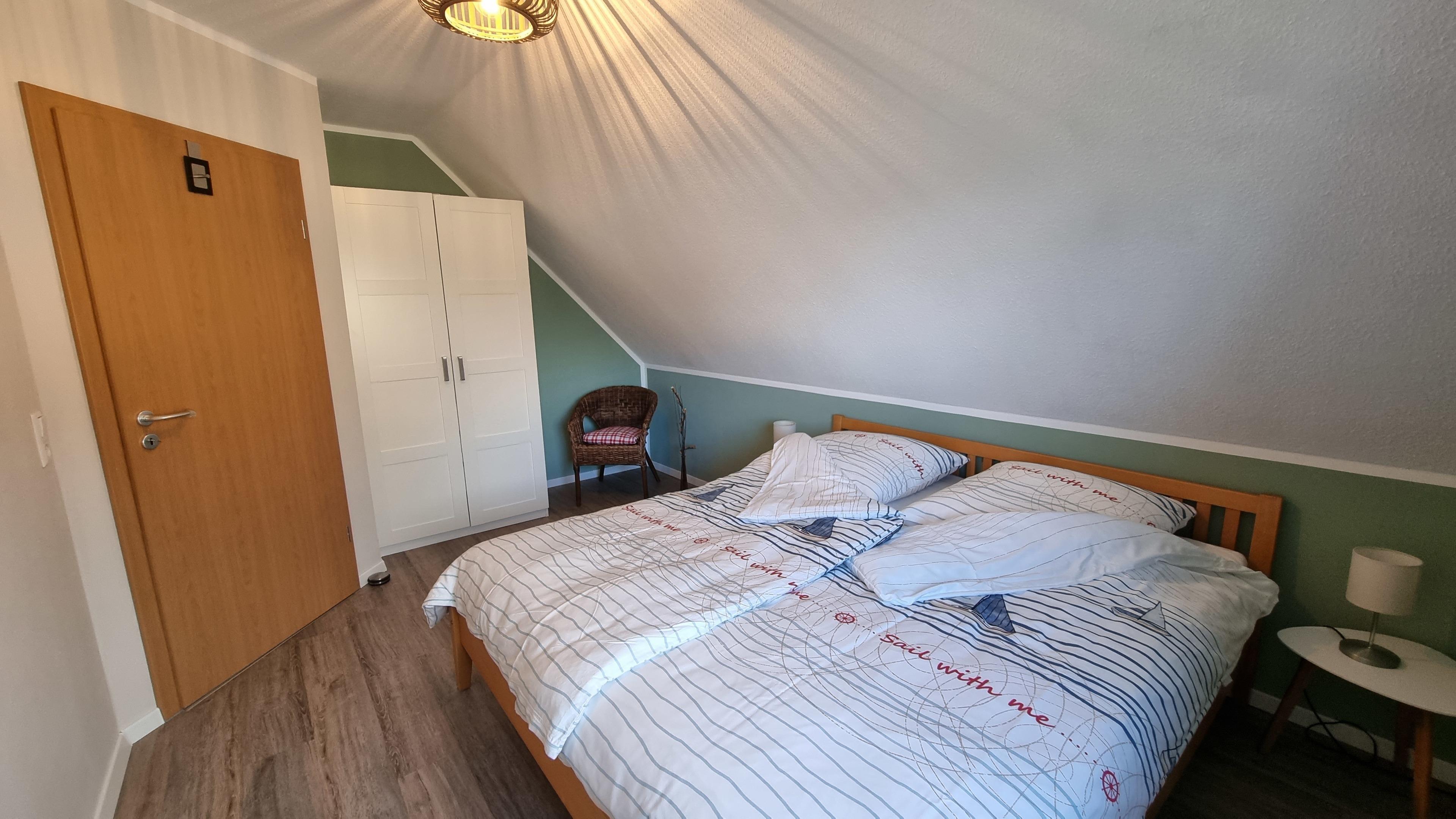 Im OG befinden sich die drei Schlafzimmer und das Bad mit Dusche und Badewanne mit Blick auf den Bodstedter Bodden. Zwei Schlafzimmer sind mit Doppelbetten 180x200, das dritte mit zwei Einzelbetten 90x200 und einem Kinderbett 70x140 ausgestattet. Kleiderschränke sind in jedem Schlafzimmer vorhanden.